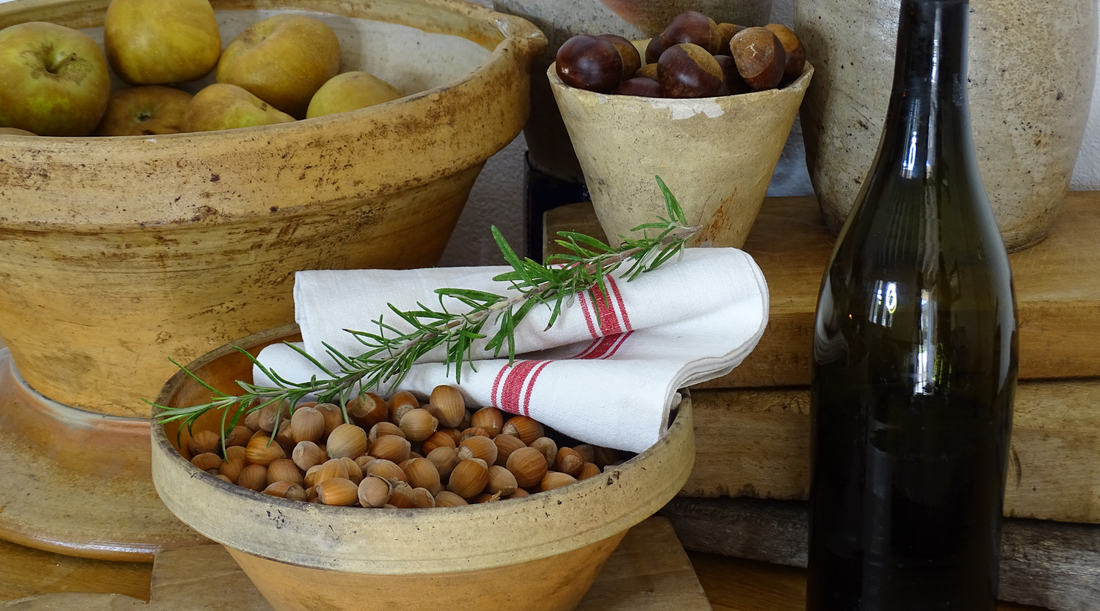 Autumn decor: French antique wooden cutting boards and antique rustic pottery