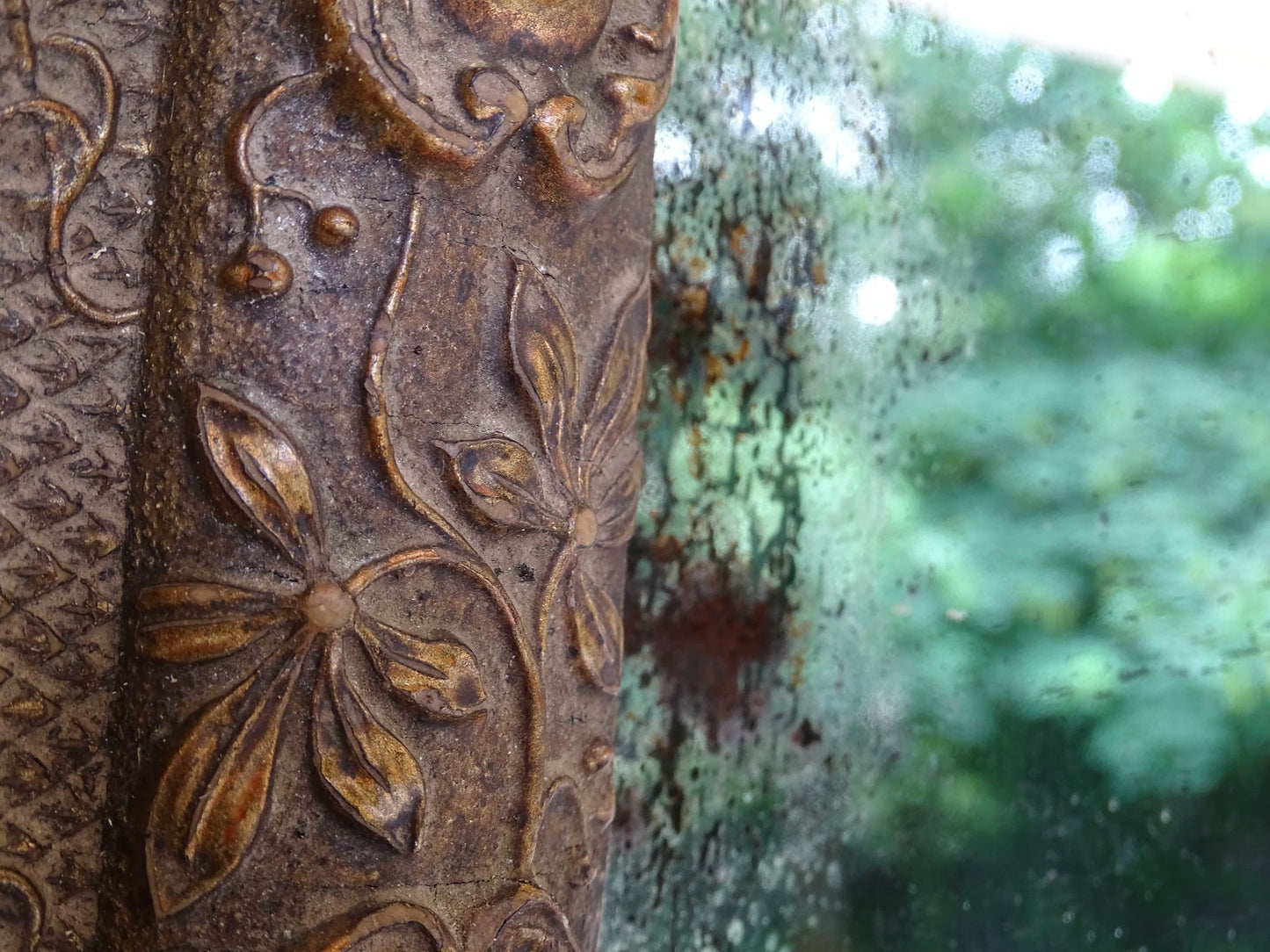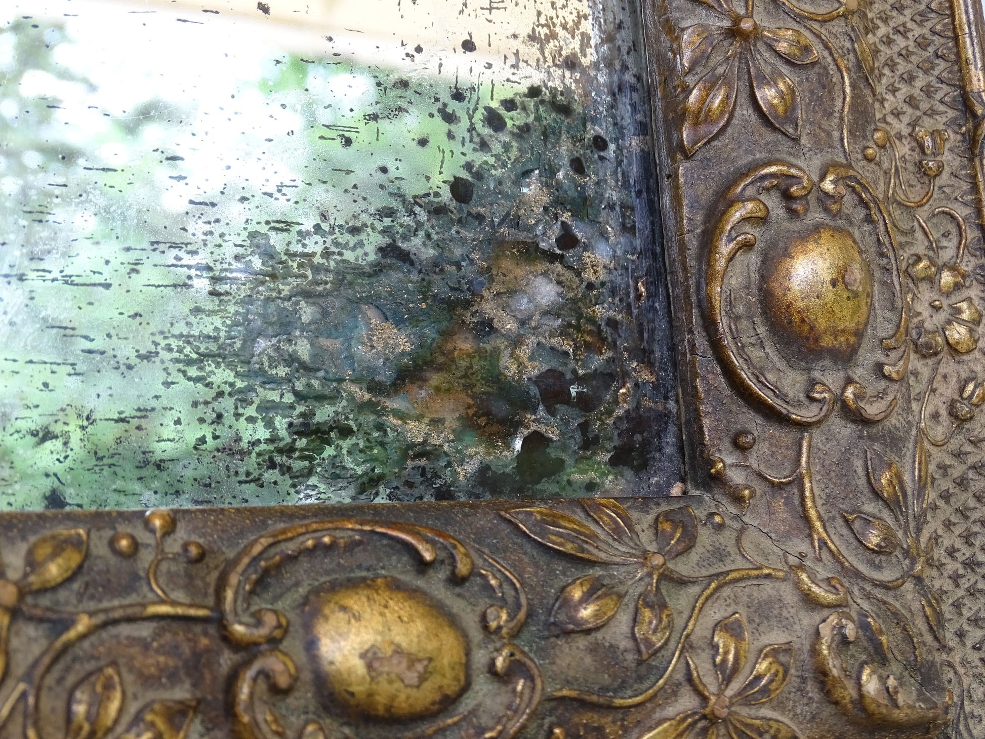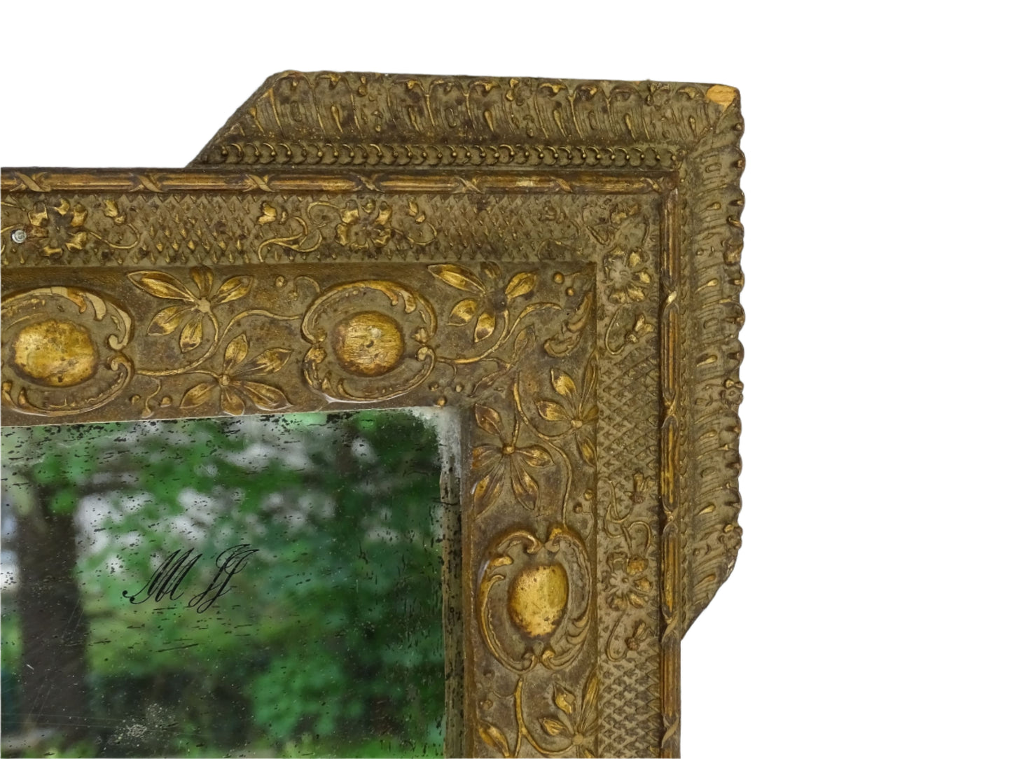 This 19th century antique French mirror retains its original mercury glass plate, which shows natural signs of age including foxing and silver loss, adding softness and patina. A discreet pair of initials, “M.J.", can be seen on the glass, likely added by a former owner.