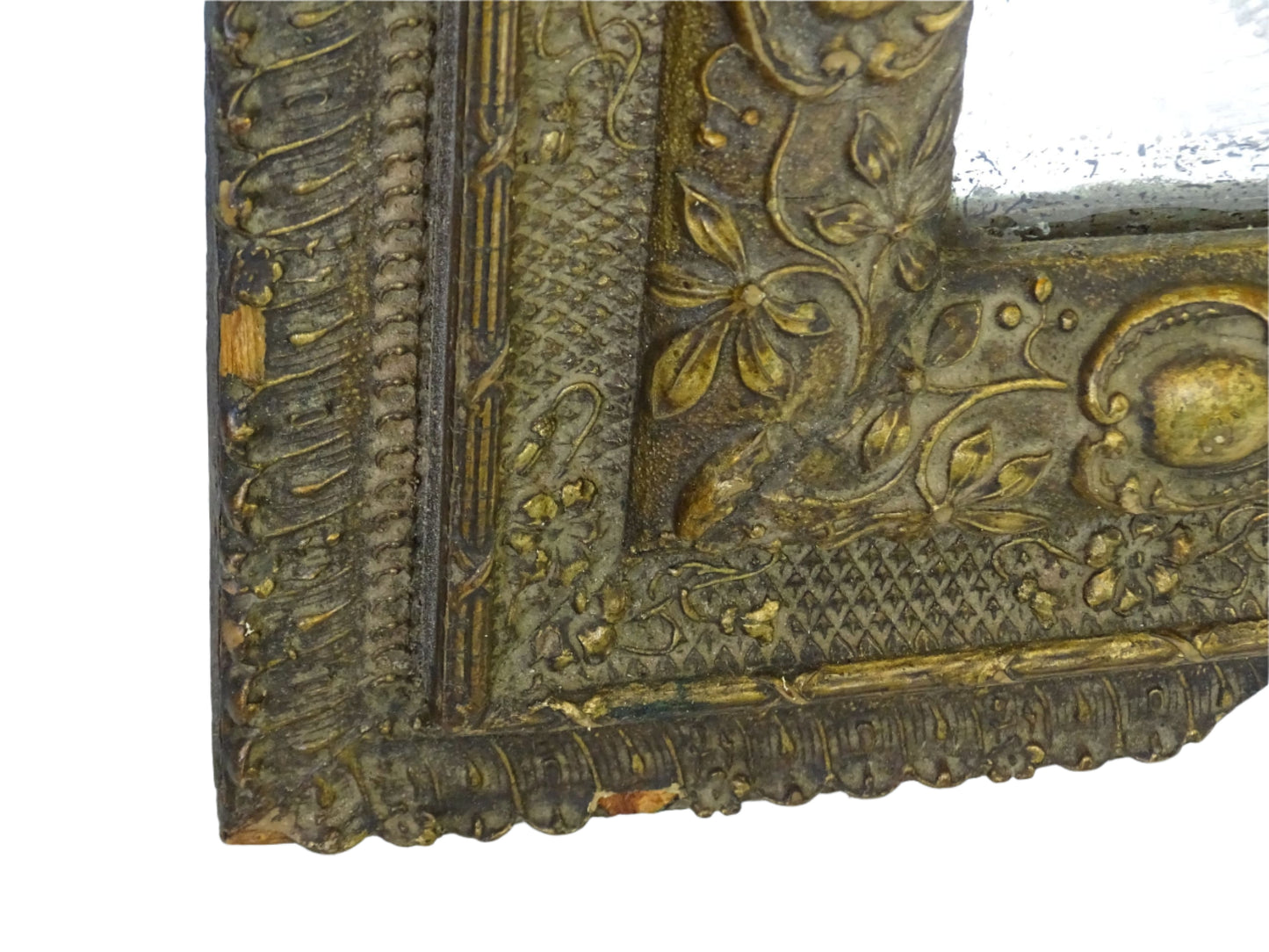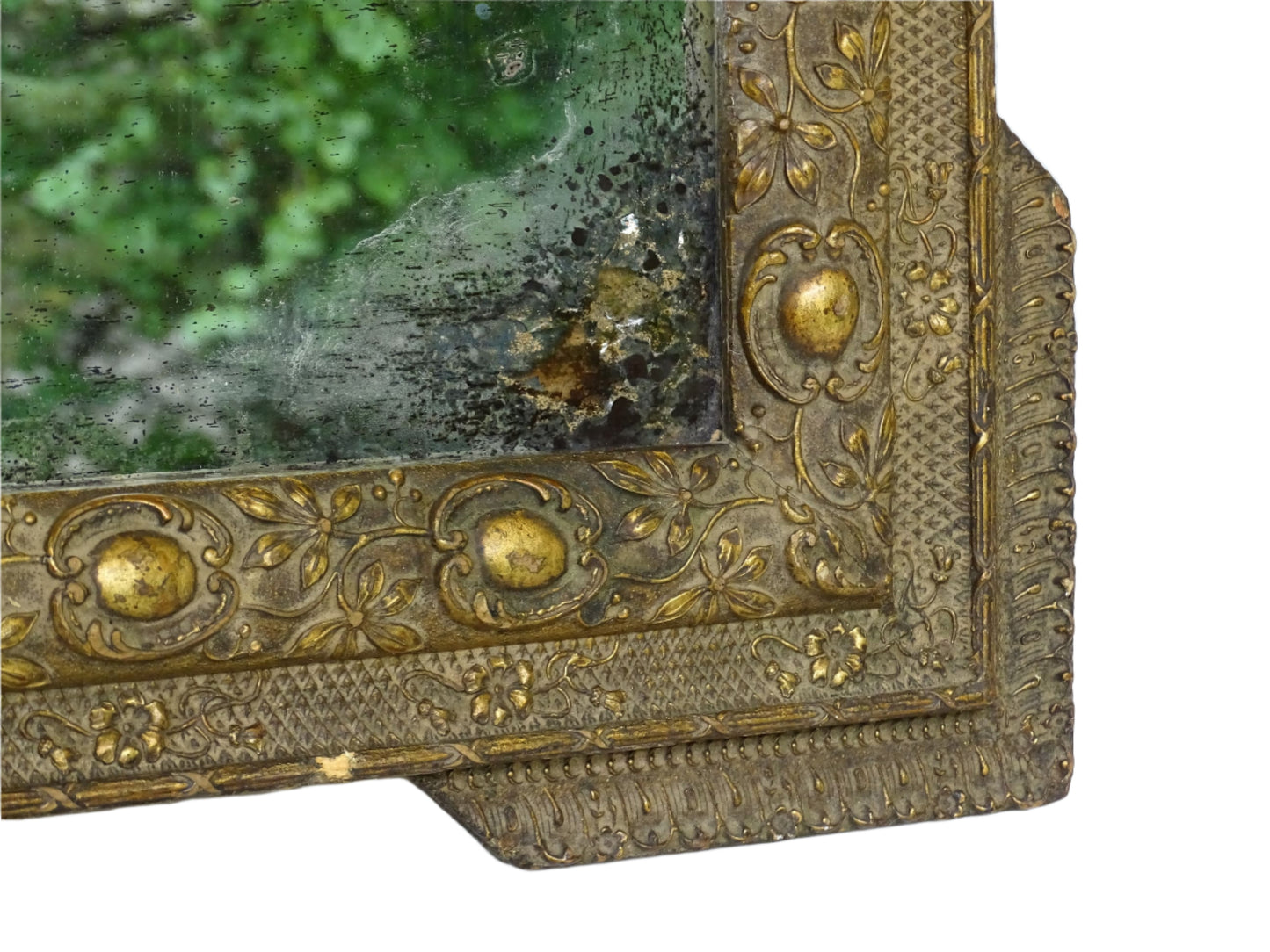 A beautifully aged antique French mirror from the Napoleon III period, featuring a frame with stepped corners and finely detailed gesso decoration. The giltwood frame showcases a repeating pattern of oval medallions, floral motifs, and textured cross-hatching, classic elements of French decorative arts from period.