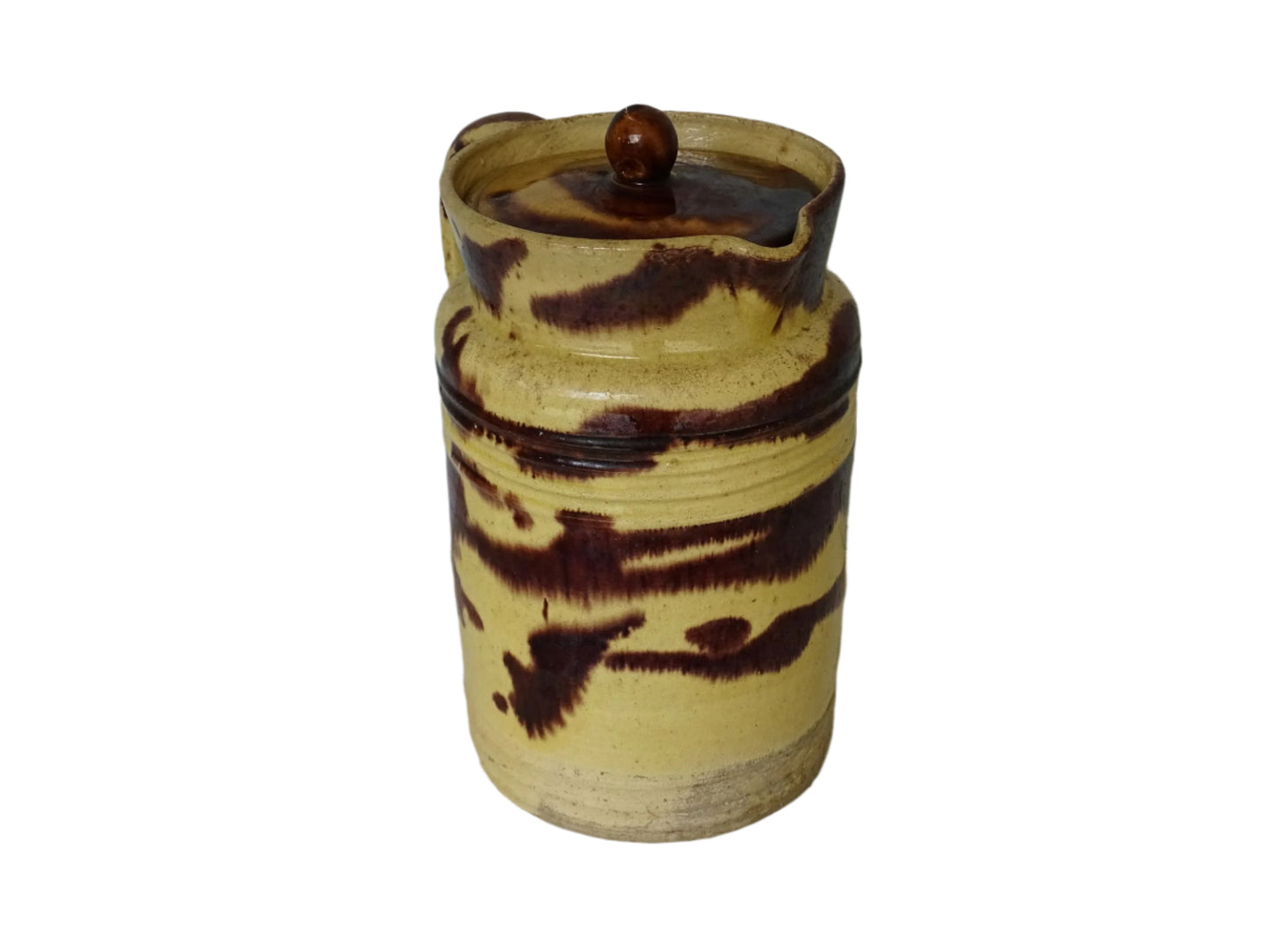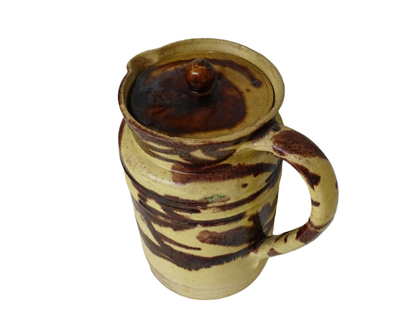 Large French antique ceramic pitcher with a lid. It has a gorgeous brown drip glaze on a yellow glazed background. This glazed pottery jug is from the town of Dieulefit in the department of Drôme. It has a wonderful shape and would look gorgeous combined with other rustic French ceramic pieces.