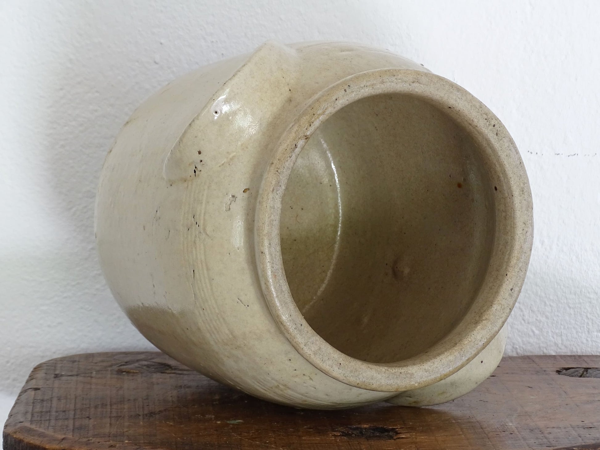 Magnifique pot à confit ou pot à conserves rustique de style français ancien avec deux poignées incurvées et un magnifique vernis de couleur avoine pâle. Le vieux pot à cache-pot en grès date du début du 20e siècle et constituerait un excellent ajout à une maison de style ferme française, peut-être dans le cadre d'une collection exposée sur une étagère ou comme pot à ustensiles pour la cuisine.