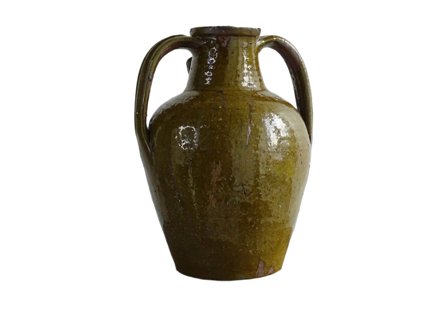 Ancienne cruche à huile en terre cuite française avec glaçure verte Détails :