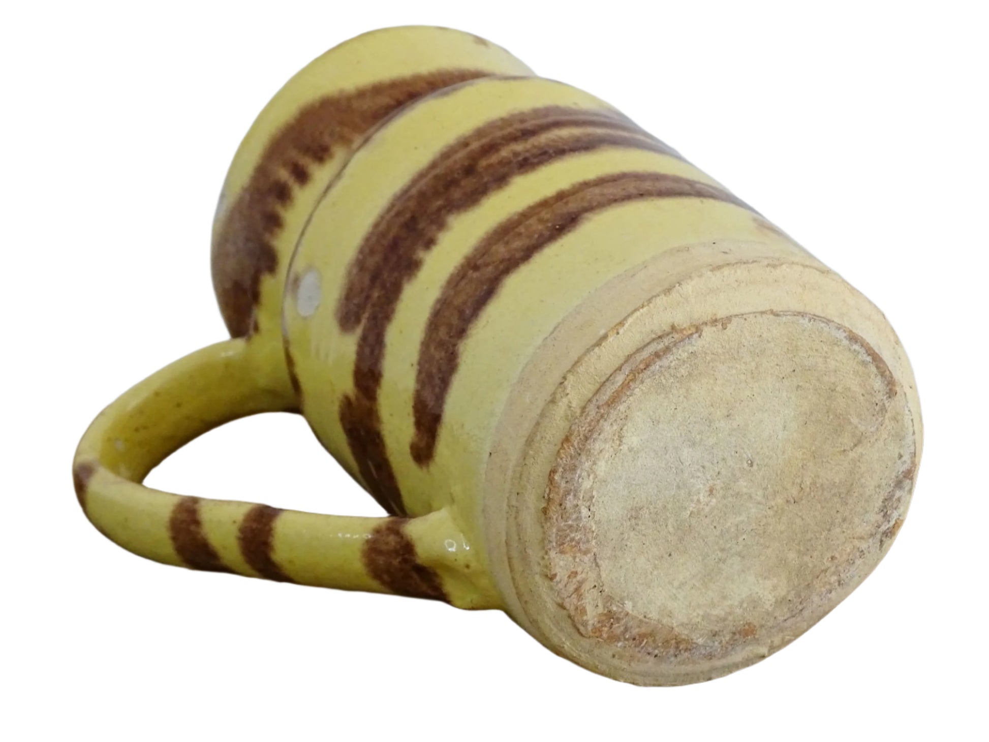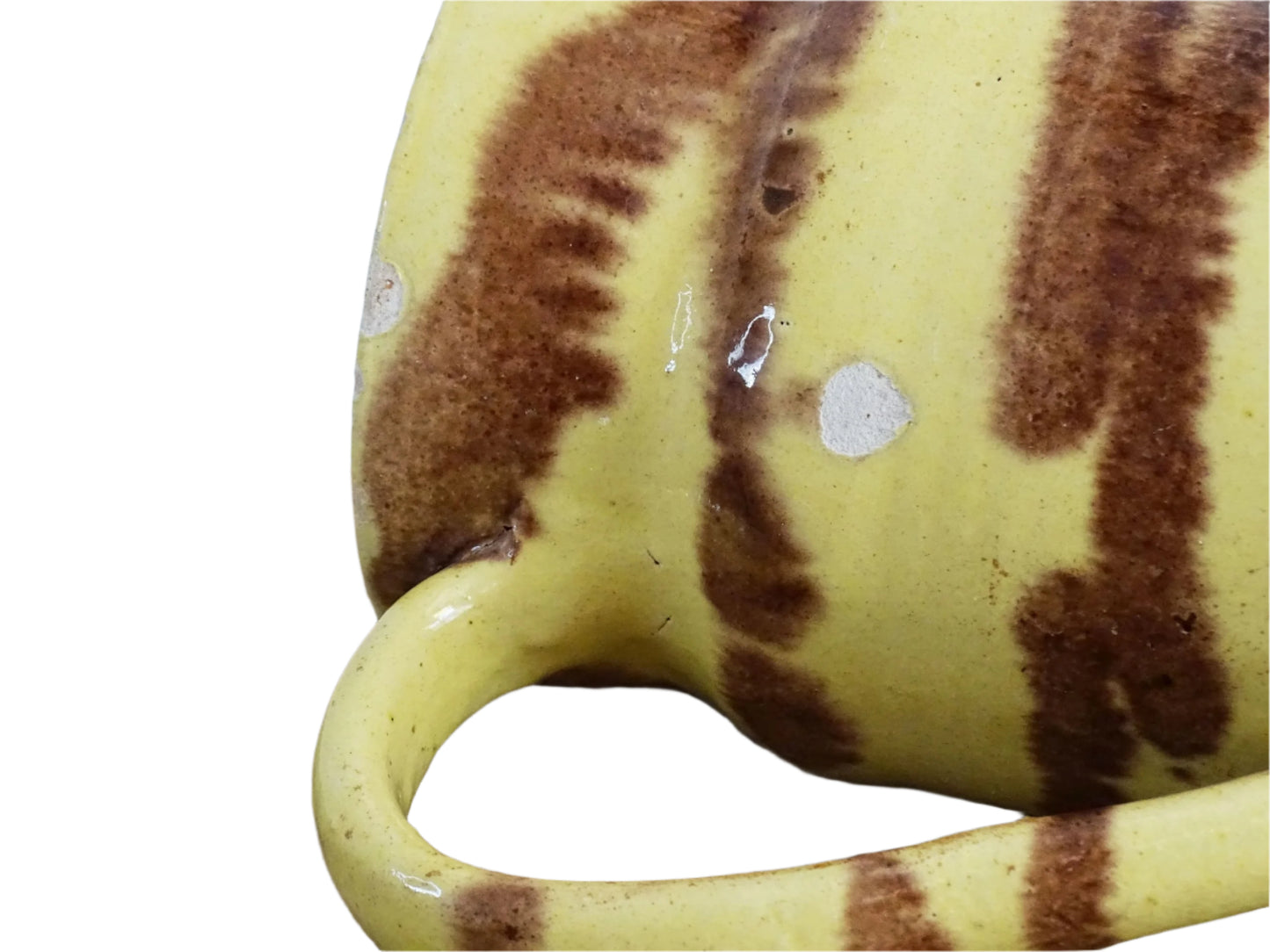Il y a une petite fissure du haut de la cruche à la deuxième bande, ainsi que quelques éraflures sur le bord et quelques pertes de glaçure. Ce pichet ancien fait à la main penche également légèrement d'un côté.