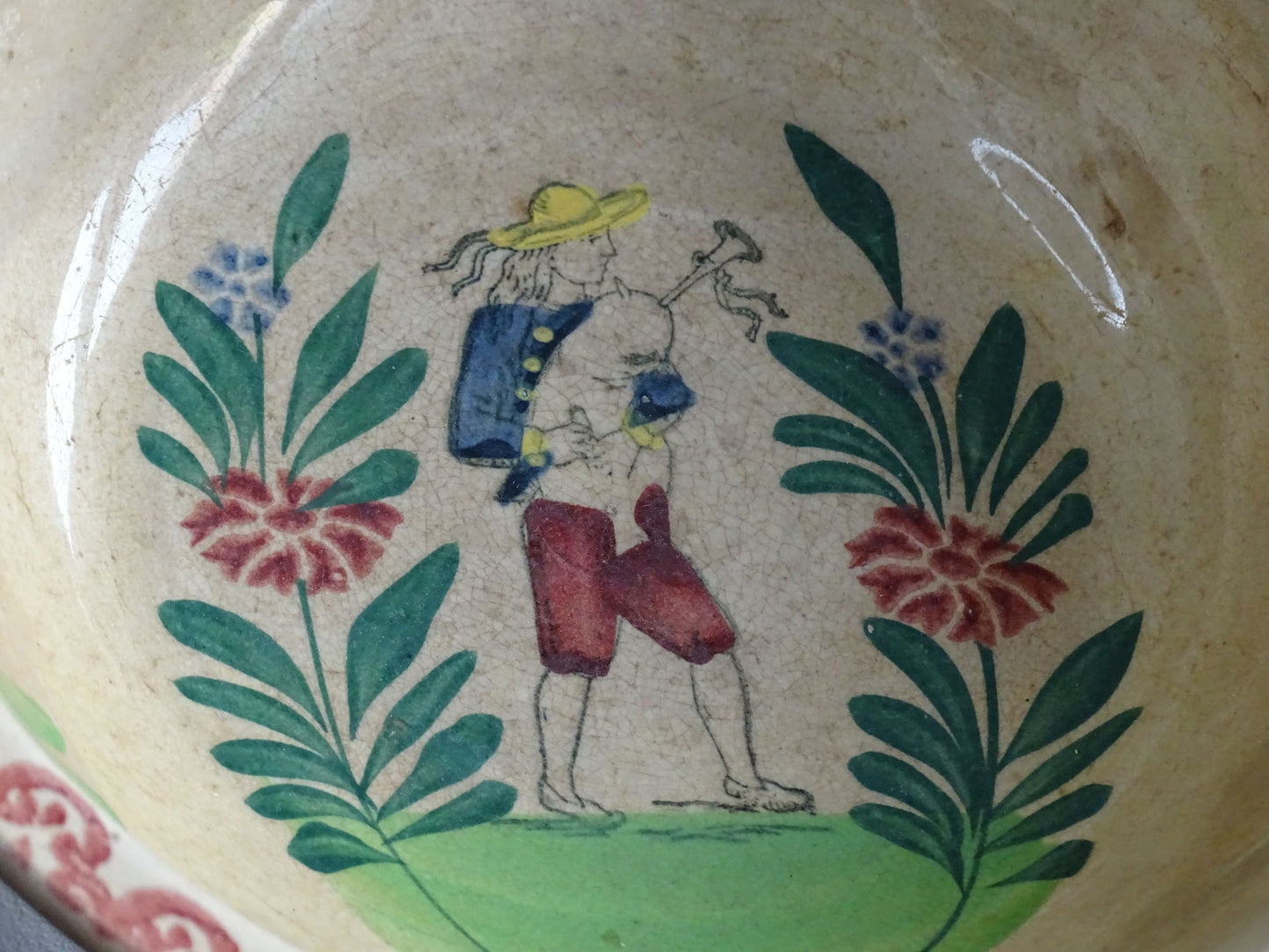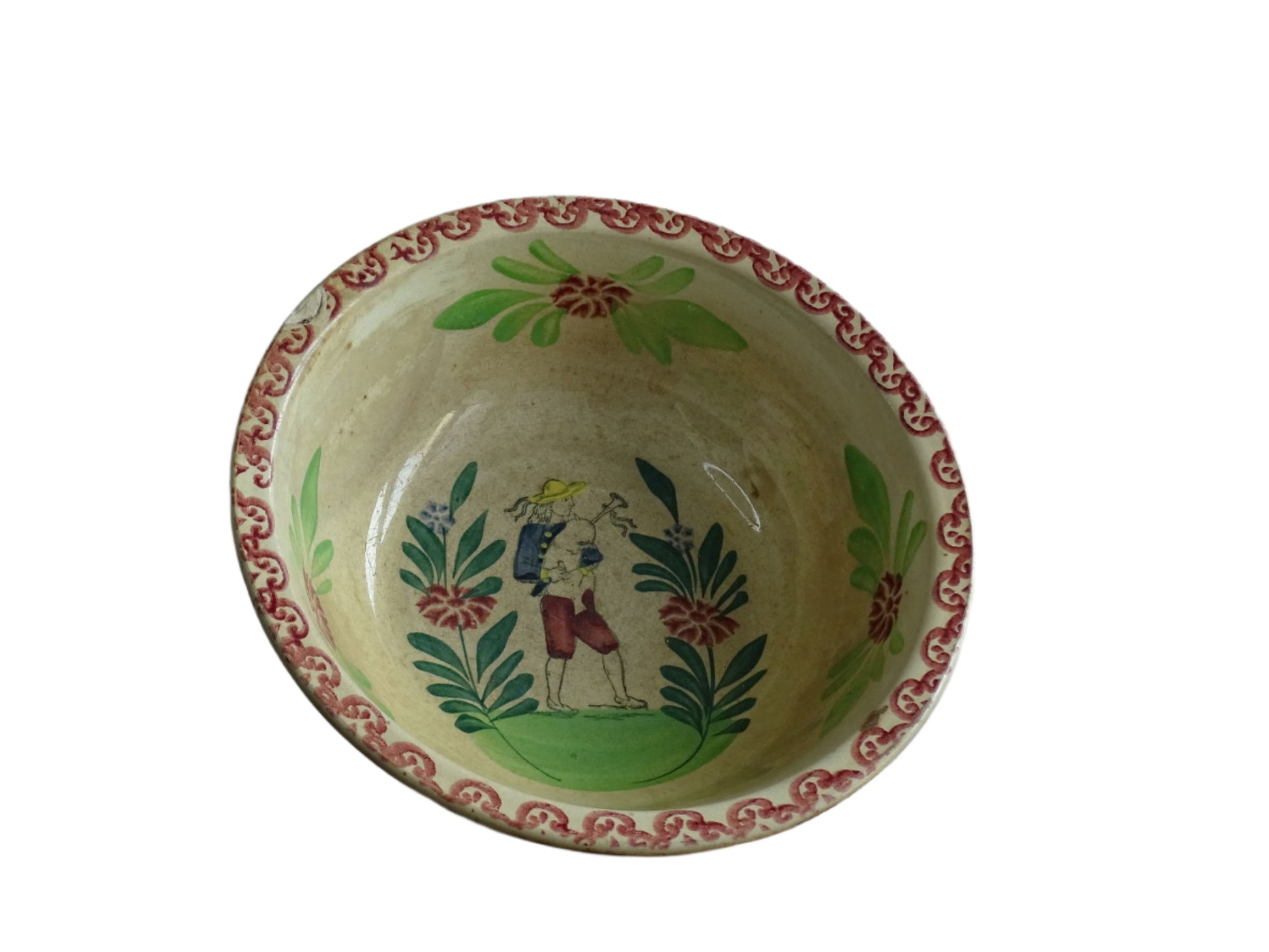 Saladier ancien en céramique française de Saint Amand, joliment décoré. Peint à la main avec un personnage et décoré de feuilles et de fleurs. Il ajoutera une magnifique touche de charme français à votre intérieur.