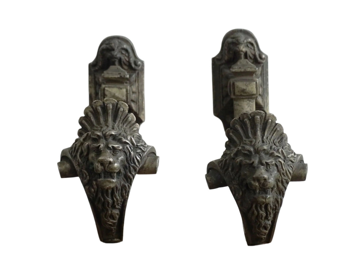 Magnifique paire d'embrasses à rideaux anciennes françaises à têtes de lion, datant de la seconde moitié du XIXe siècle. Très ornées, ces embrasses à rideaux décoratives feraient un merveilleux ajout à un salon ou une chambre, ajoutant une touche d'élégance française. Elles peuvent également être utilisées comme crochets dans un couloir ou une cuisine.