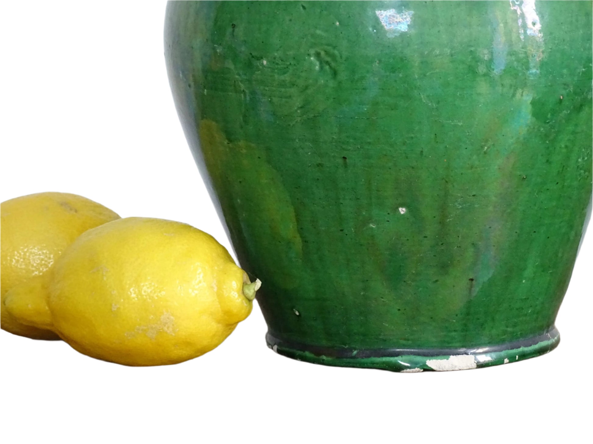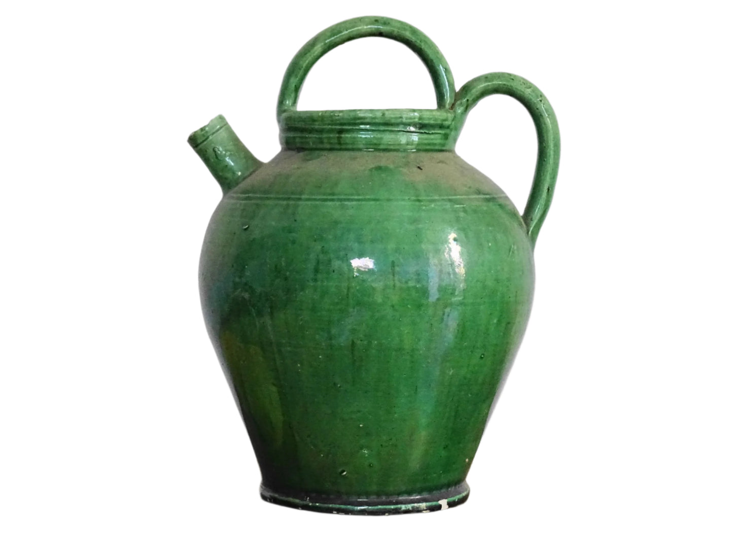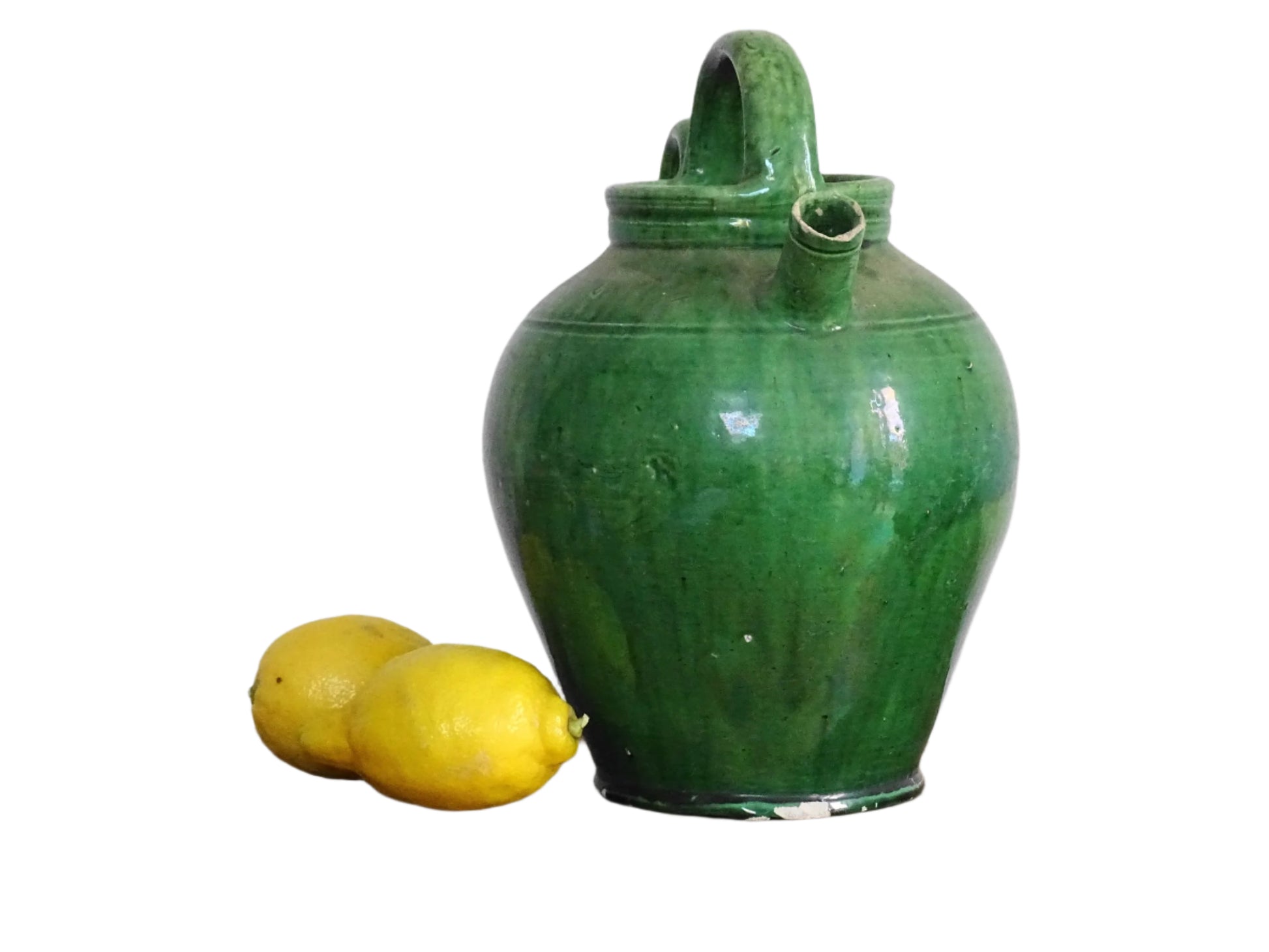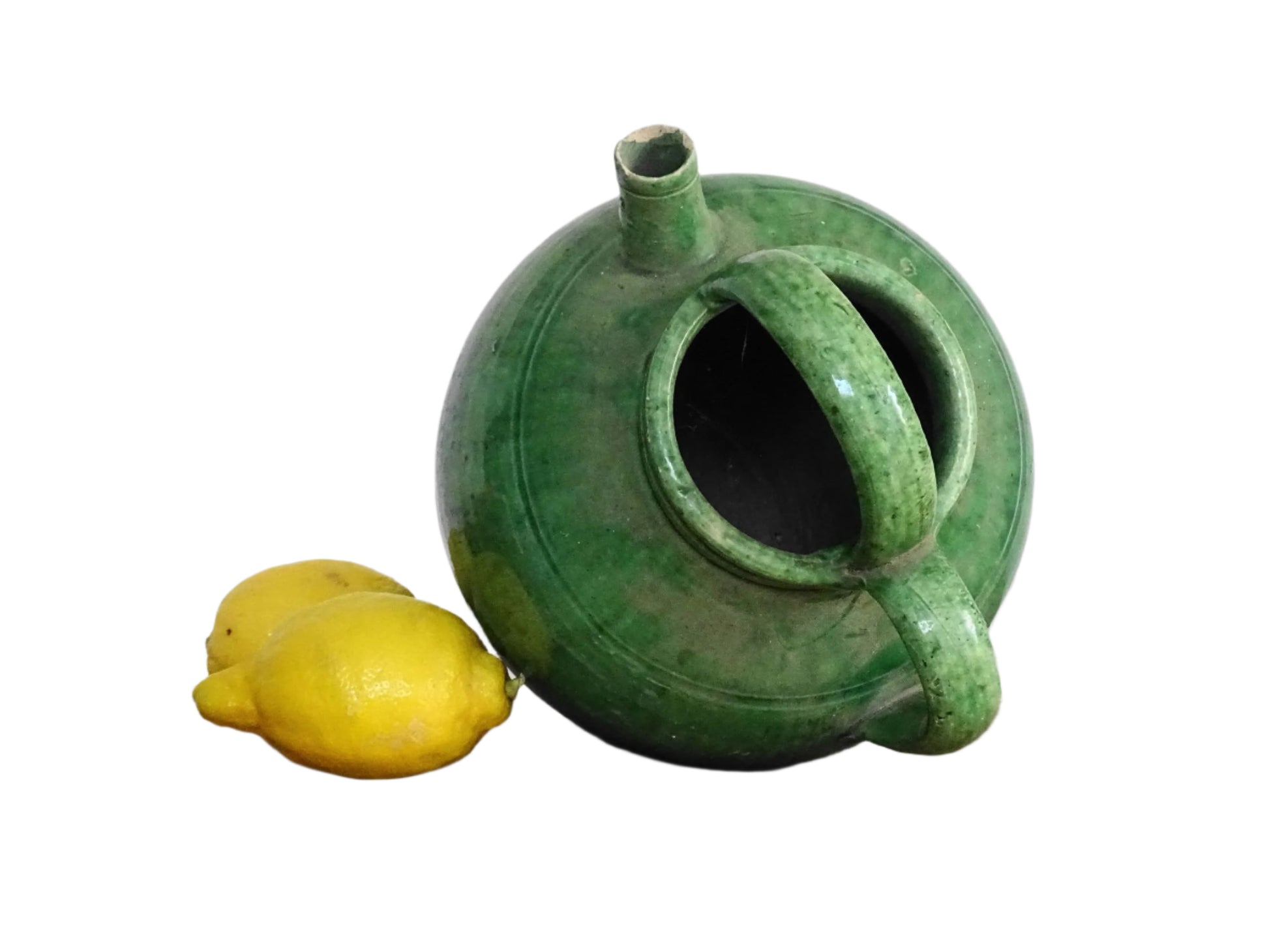 Superbe gargoulette ancienne française à glaçure verte. Originaire de la région de Provence, cette cruche à eau en poterie est dotée d'une belle glaçure verte vive. Elle est dotée d'une poignée sur le dessus et sur le côté, ainsi que d'un bec verseur. Cette magnifique pièce ferait une magnifique décoration dans la cuisine ou la salle à manger.