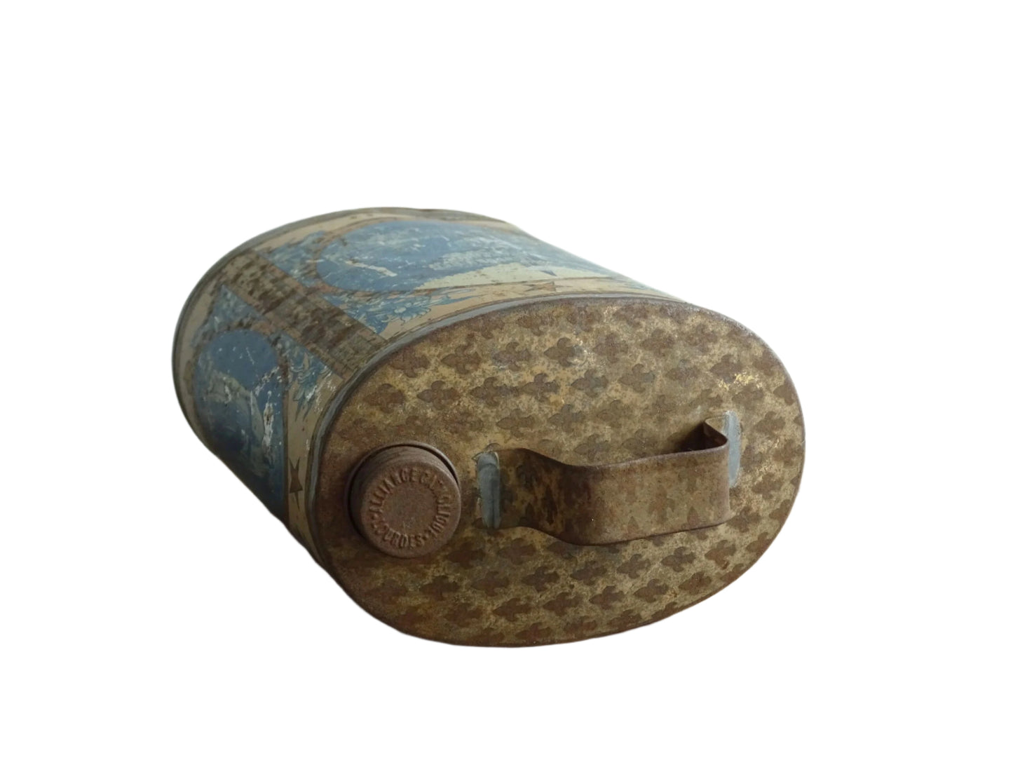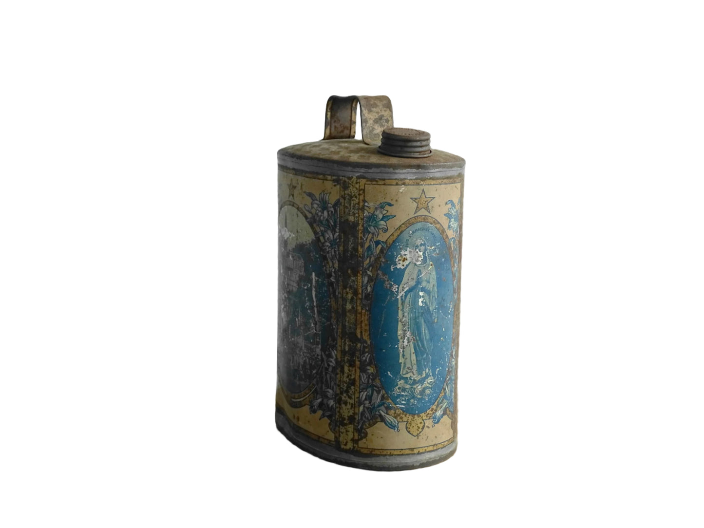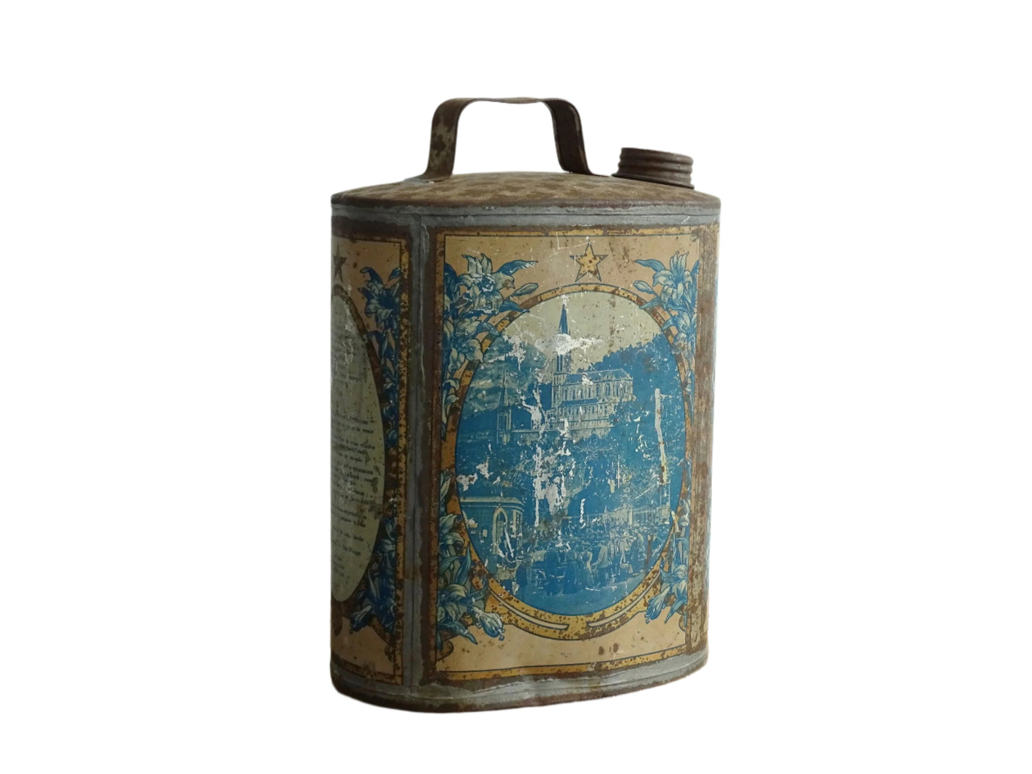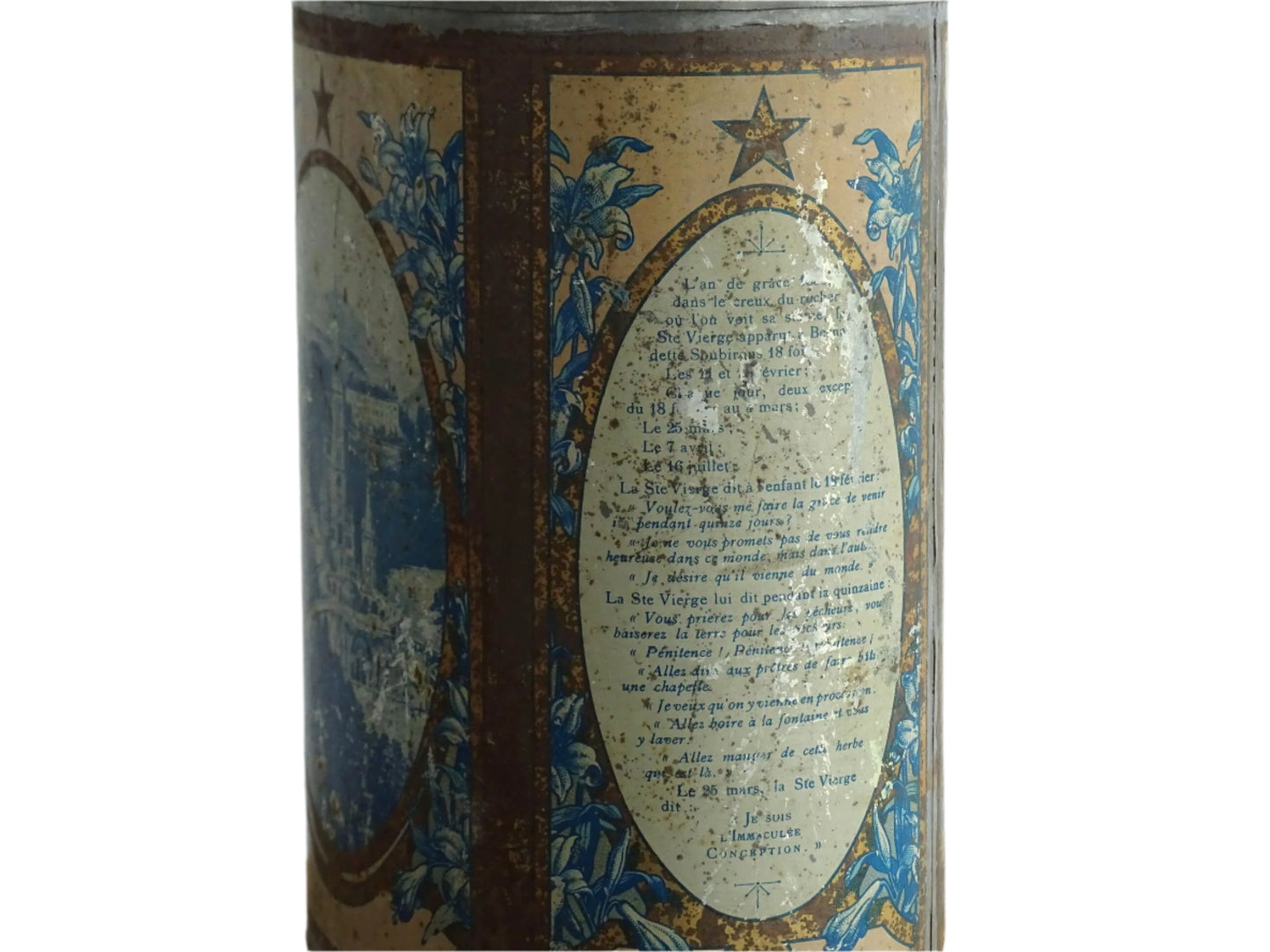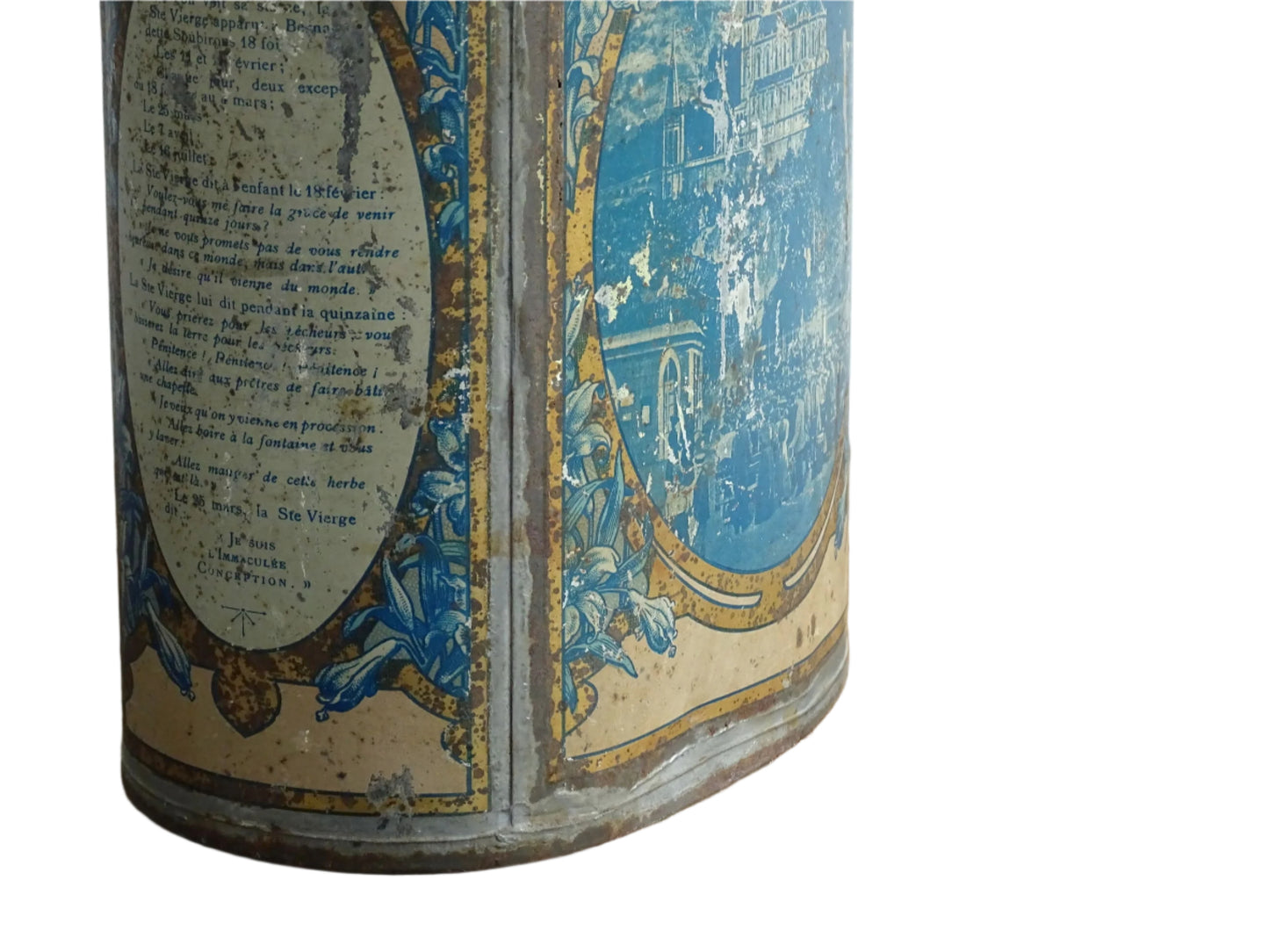 Flacon souvenir ancien français de Lourdes, datant du début du XXe siècle. Fabriqué en étain, le haut est décoré de fleurs de lys, un côté représente la cathédrale (Sanctuaire de Notre-Dame de Lourdes), l'autre montre une foule de personnes en tenue du début du XXe siècle attendant de se baigner ou de boire l'eau bénite. Sur le côté se trouve la Vierge Marie, au-dessus d'elle il est écrit "Je suis l'Immaculée Conception". Le flacon bleu antique aurait autrefois contenu de l'eau bénite de Lourdes et pourrait désormais servir de magnifique pièce de décoration religieuse.