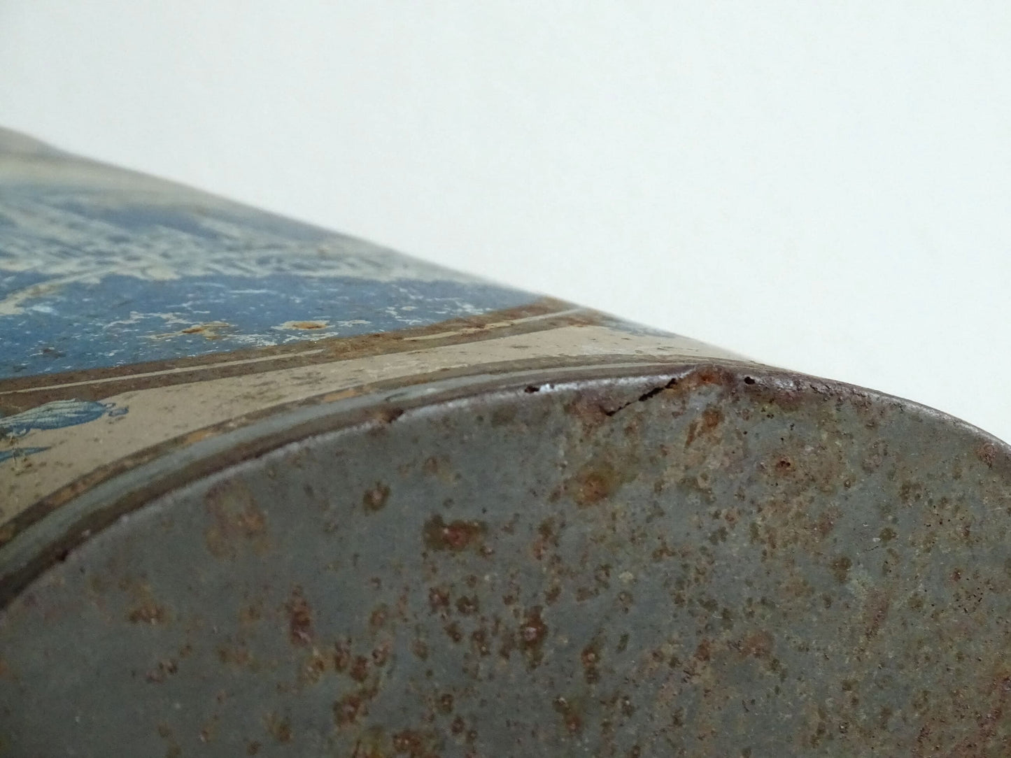 Le récipient présente des traces de rouille et d'usure, veuillez vous référer aux photos. Il y a également quelques petites fissures au fond.