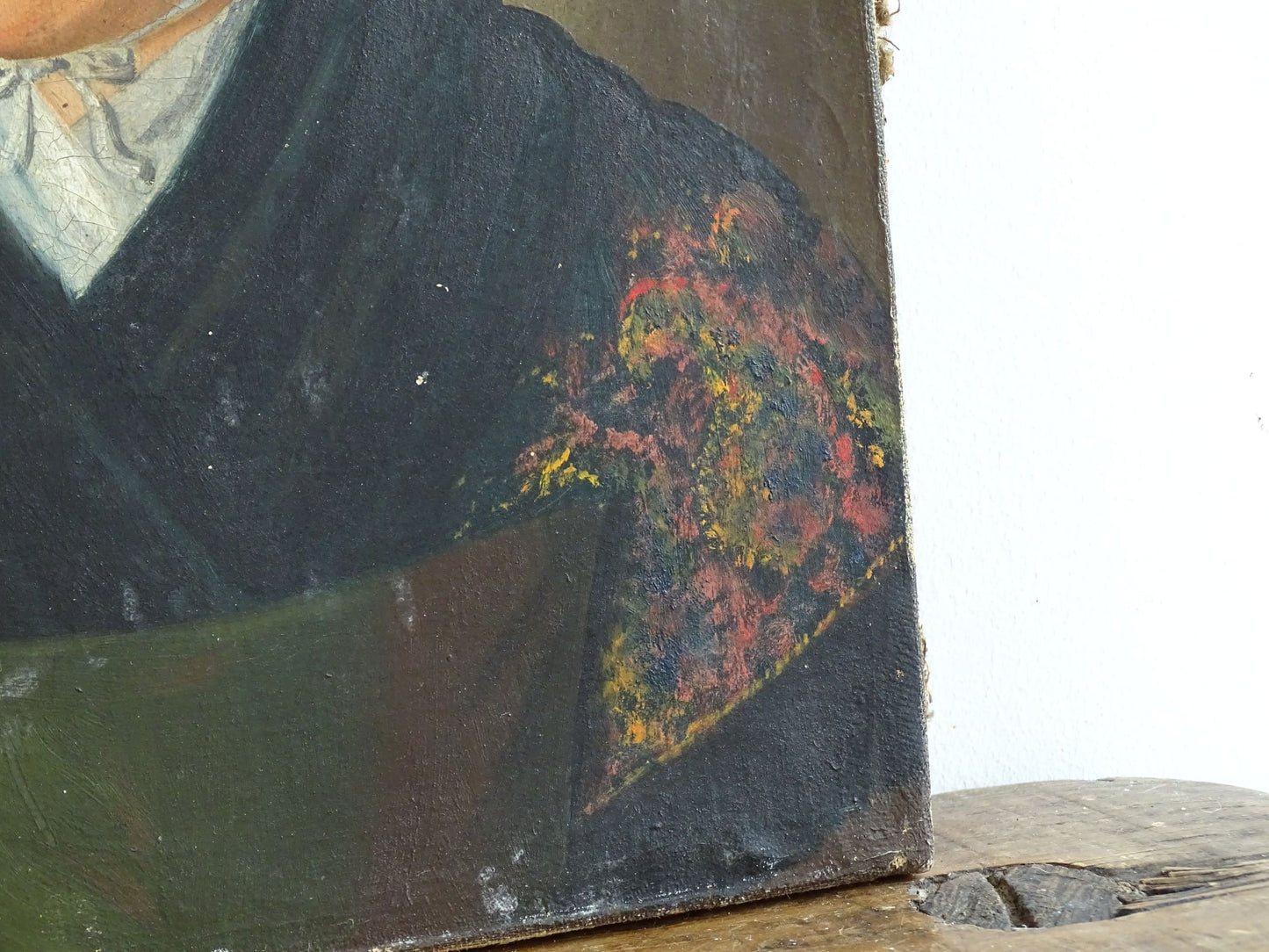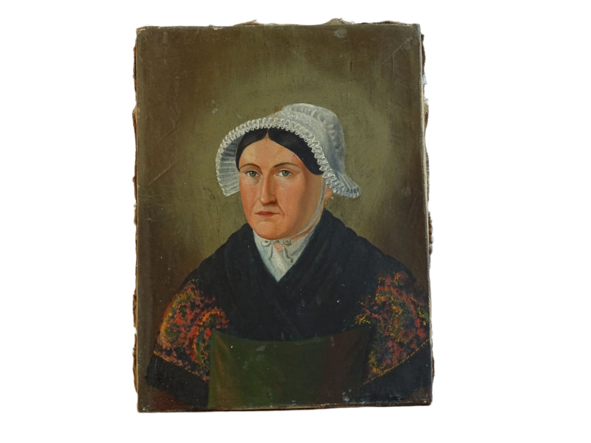 Portrait ancien français d'une dame, datant du début du XIXe siècle. Cette peinture d'art populaire capture l'image d'une femme en tenue traditionnelle, rendue à l'huile sur toile. Avec son bonnet et ses vêtements modestes, elle apparaît stoïque mais digne, incarnant la simplicité et la force souvent célébrées dans l'art populaire. L'approche de l'artiste est directe et sans fioritures, mettant l'accent sur le visage expressif du sujet plutôt que sur les détails fins. Cela donne au tableau une qualité intime et accessible.