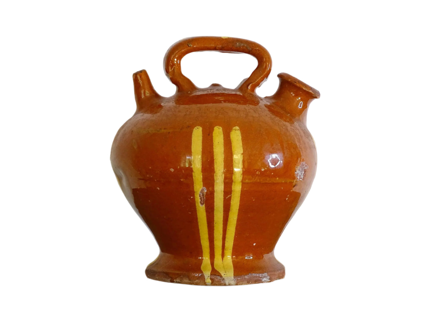 Cruche ou gargoulette en poterie ancienne française avec glaçure à rayures jaunes Détails :