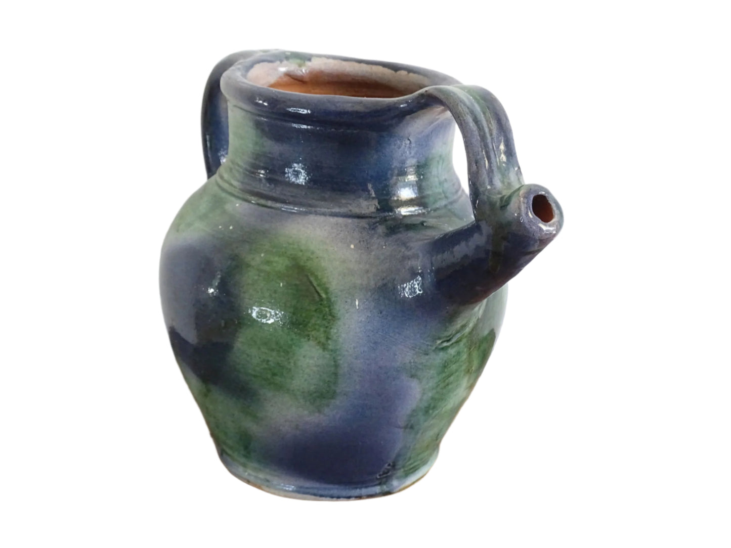 Pichet ou Orjol en poterie vintage française avec glaçure bleue et verte Détails :