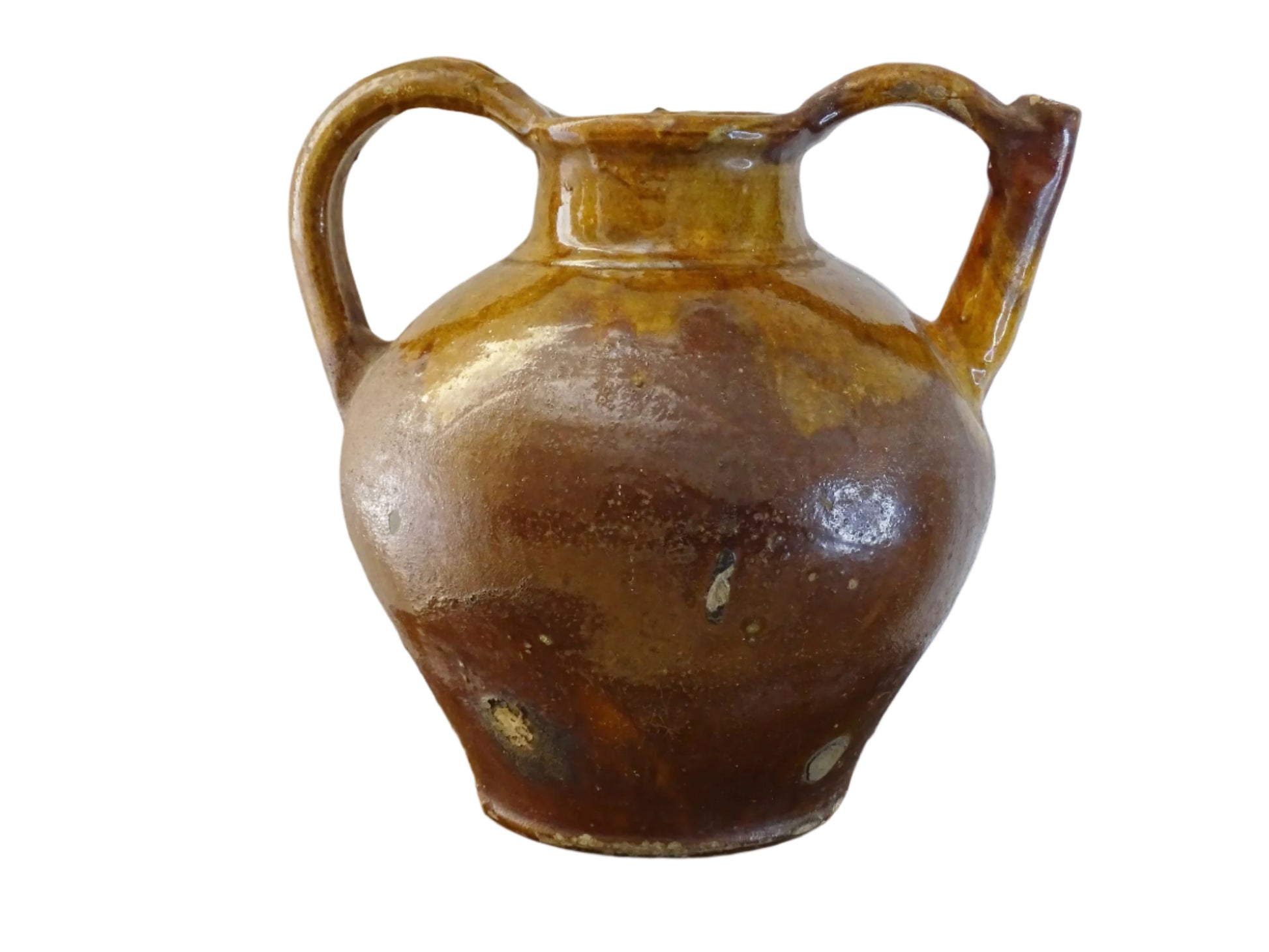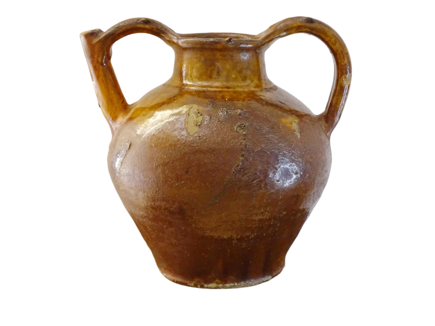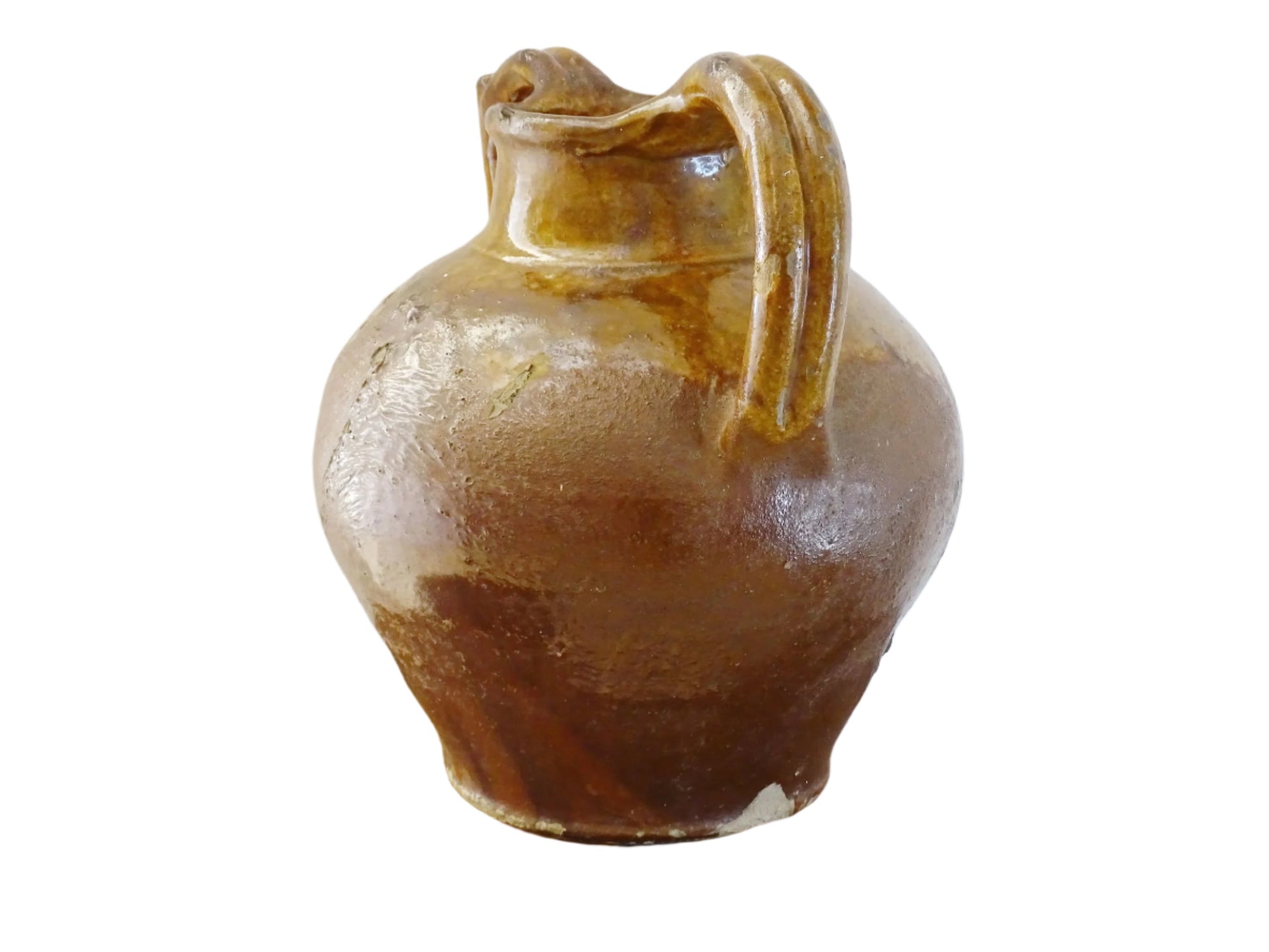 Magnifique cruche ou pichet ancien en terre cuite émaillée de couleur caramel doré et jaune. Ce pichet ancien en terre cuite émaillée provient de la région du Languedoc, dans le sud-ouest de la France.