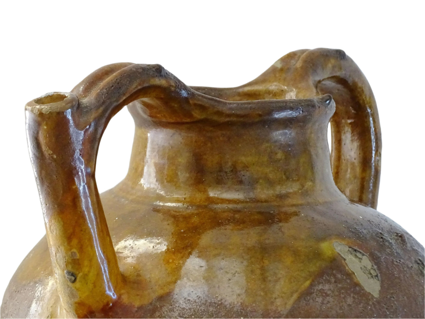 Poterie ancienne française Orjol ou Cruche à glaçure rouge et jaune du Languedoc Détails :