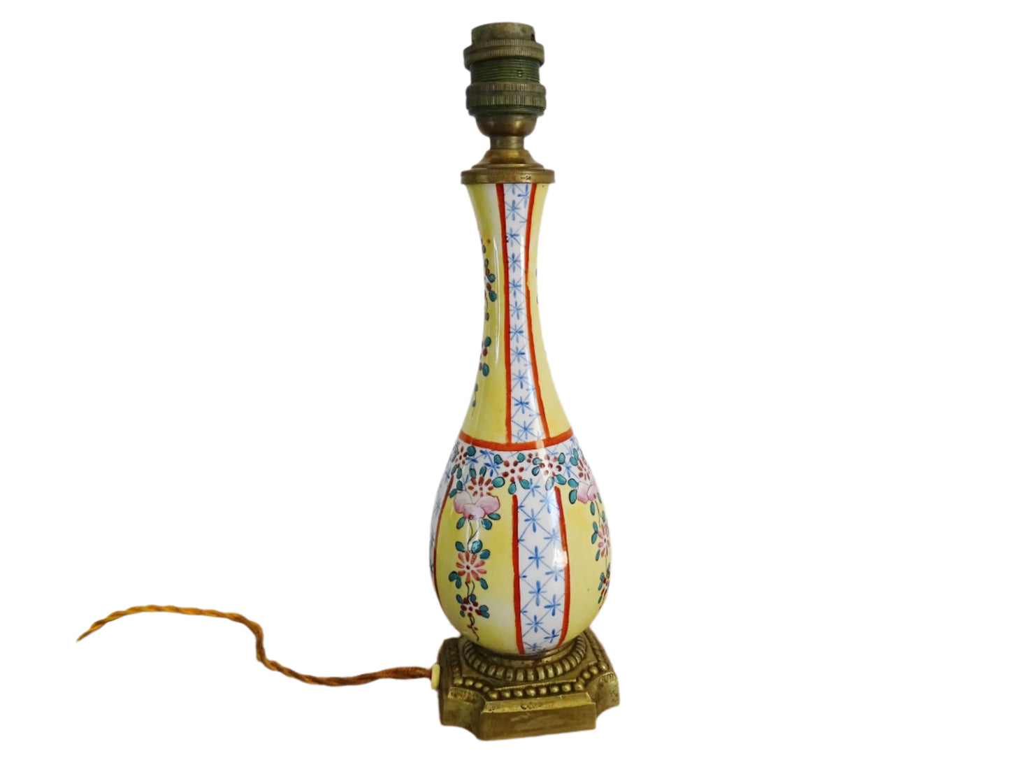 Pied de lampe vintage en porcelaine française, magnifiquement peint à la main dans un style chinoiserie, orné de délicats motifs floraux et de motifs géométriques complexes sur un fond jaune doux. Sa forme élancée et allongée se termine par un sommet évasé, complété par un socle décoratif en laiton.
