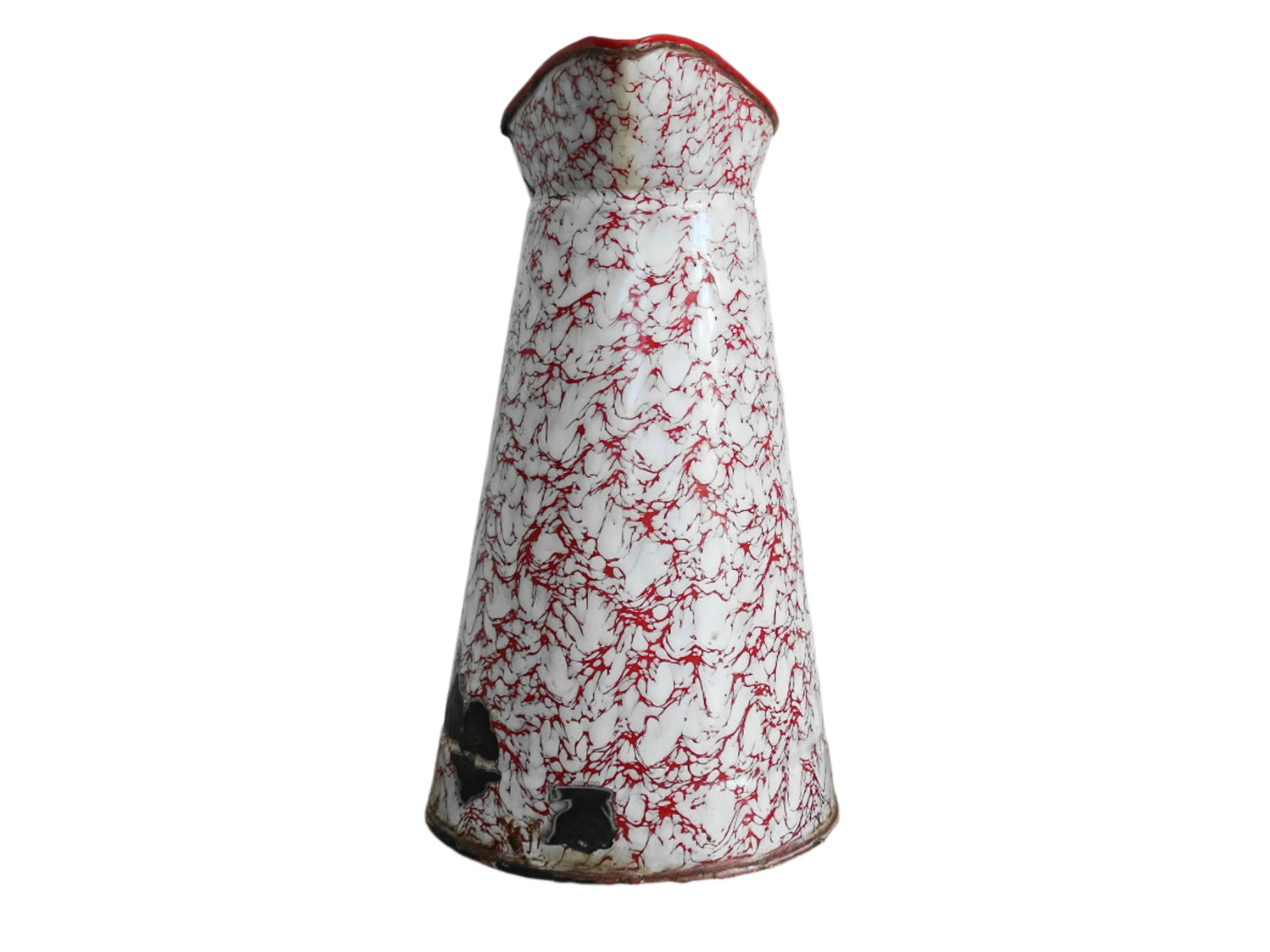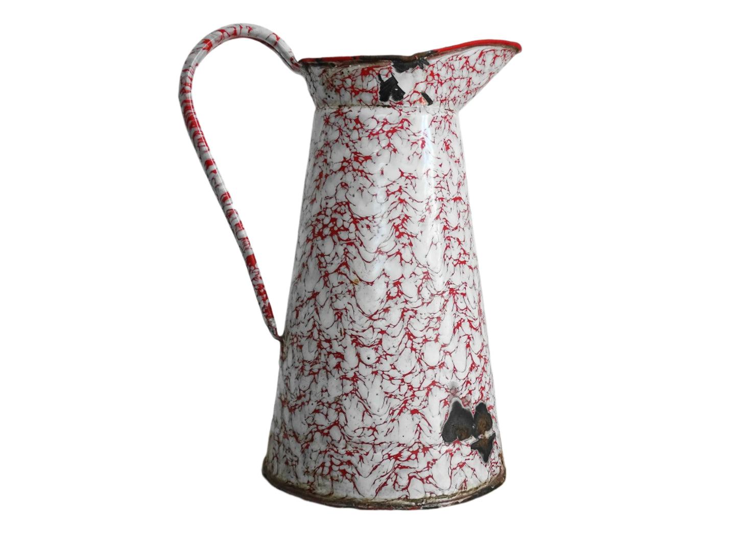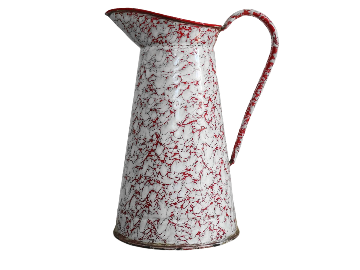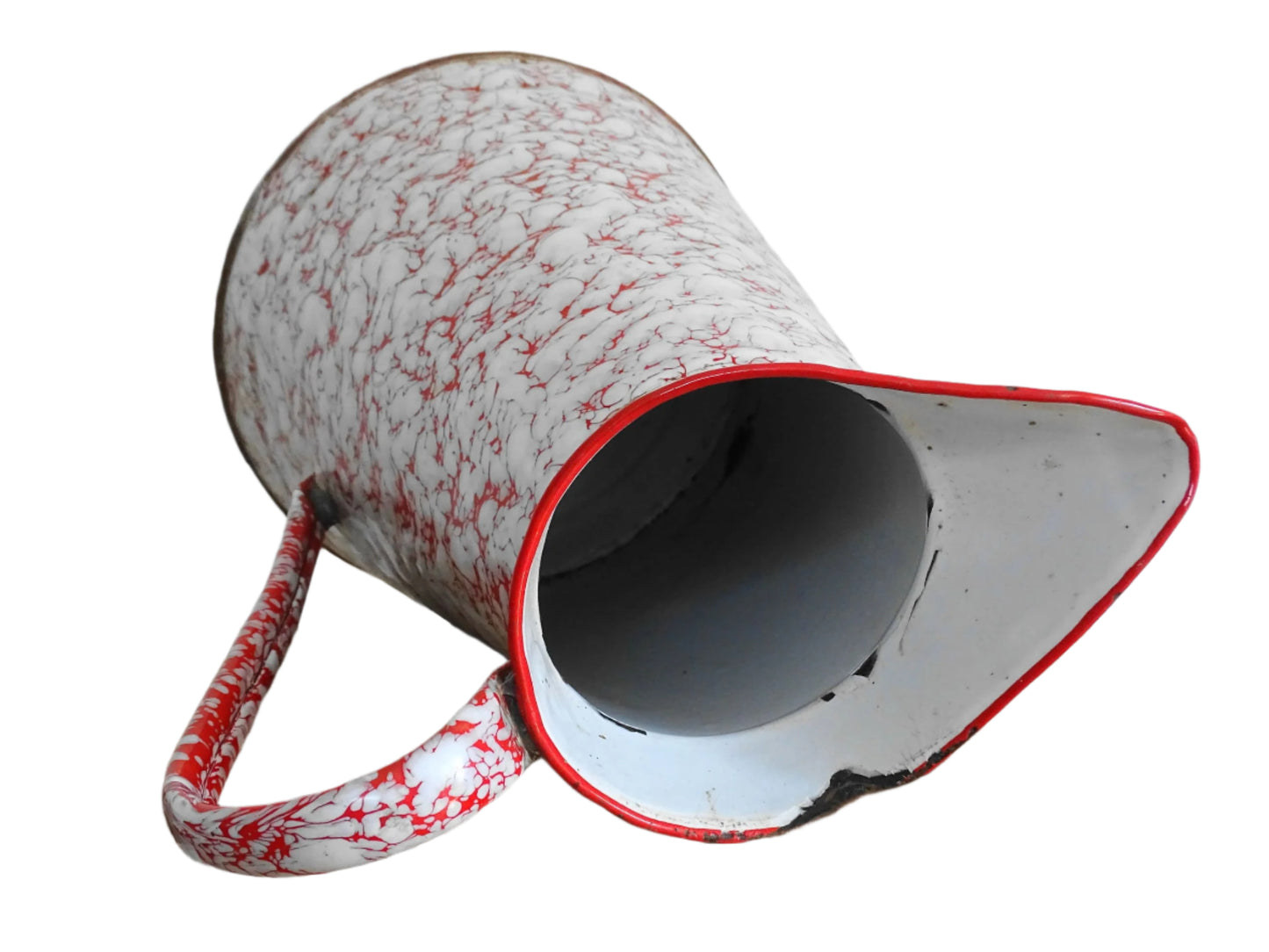 Grand pichet vintage français en émail rouge et blanc Détails :