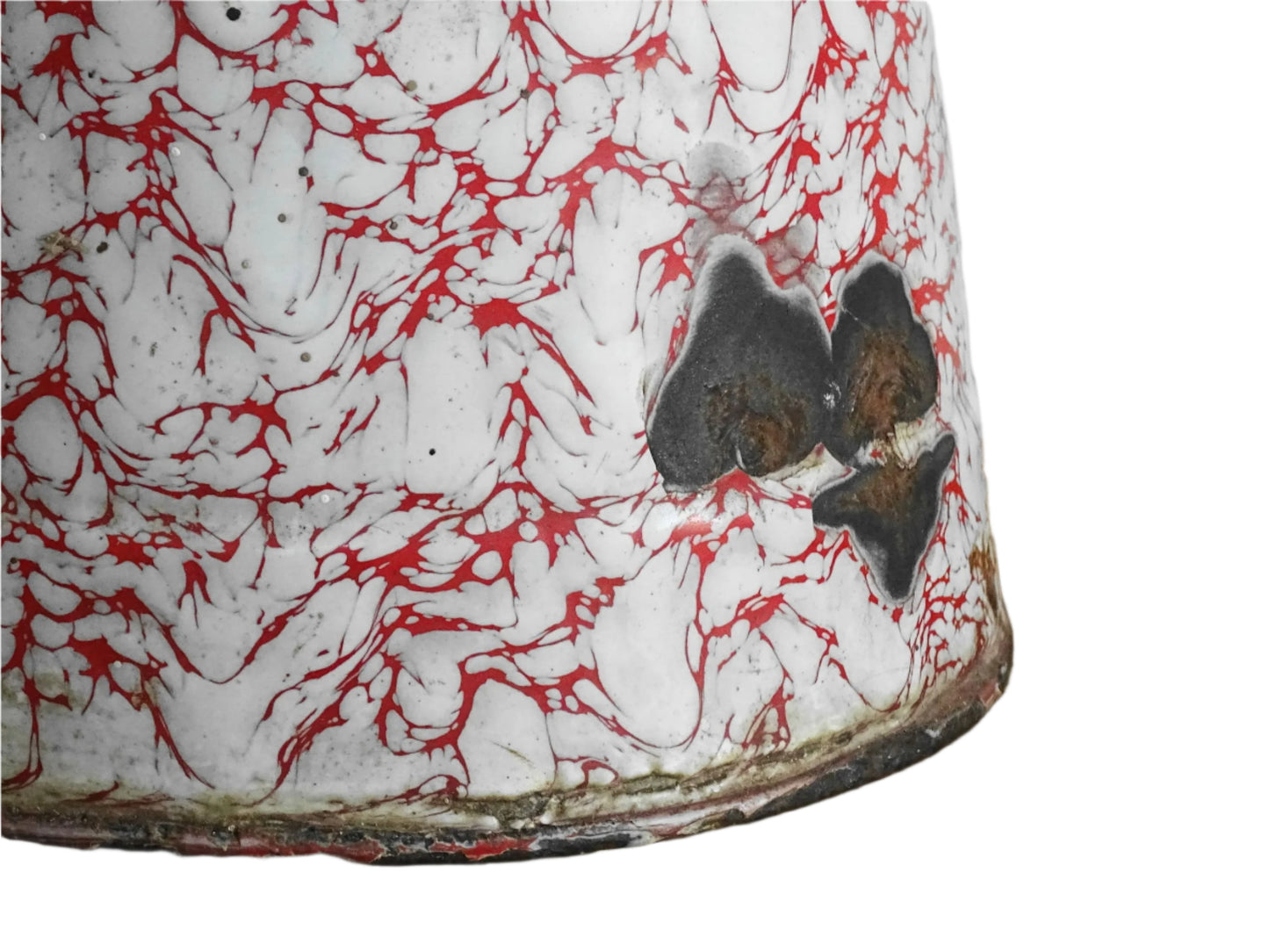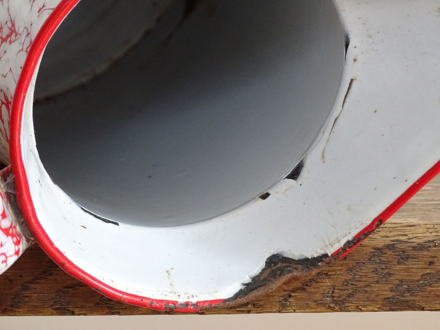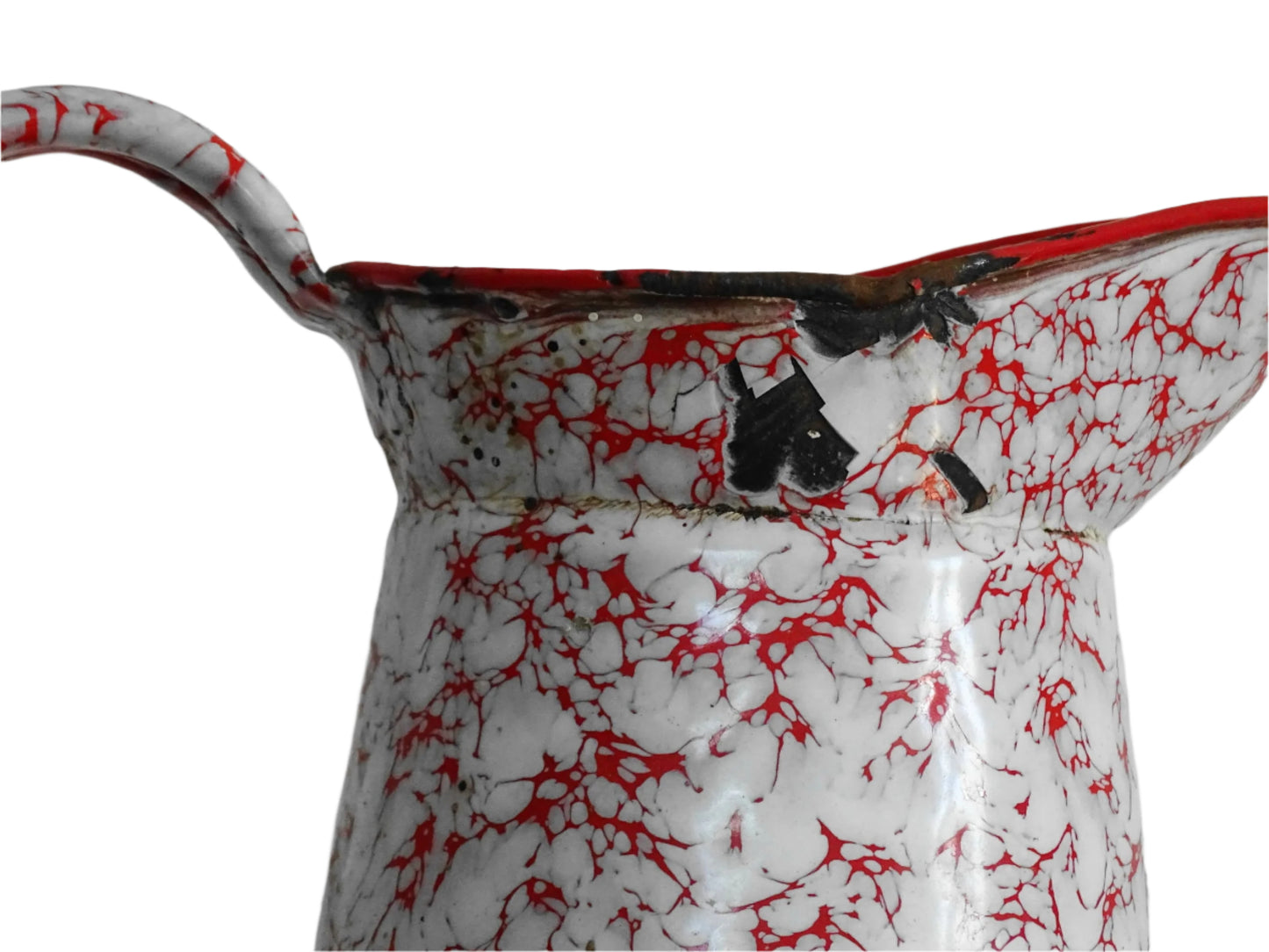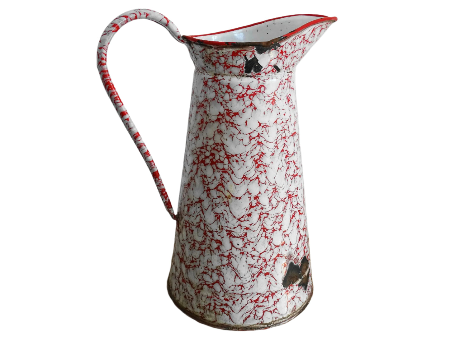 Grand pichet vintage français en émail rouge et blanc Détails :