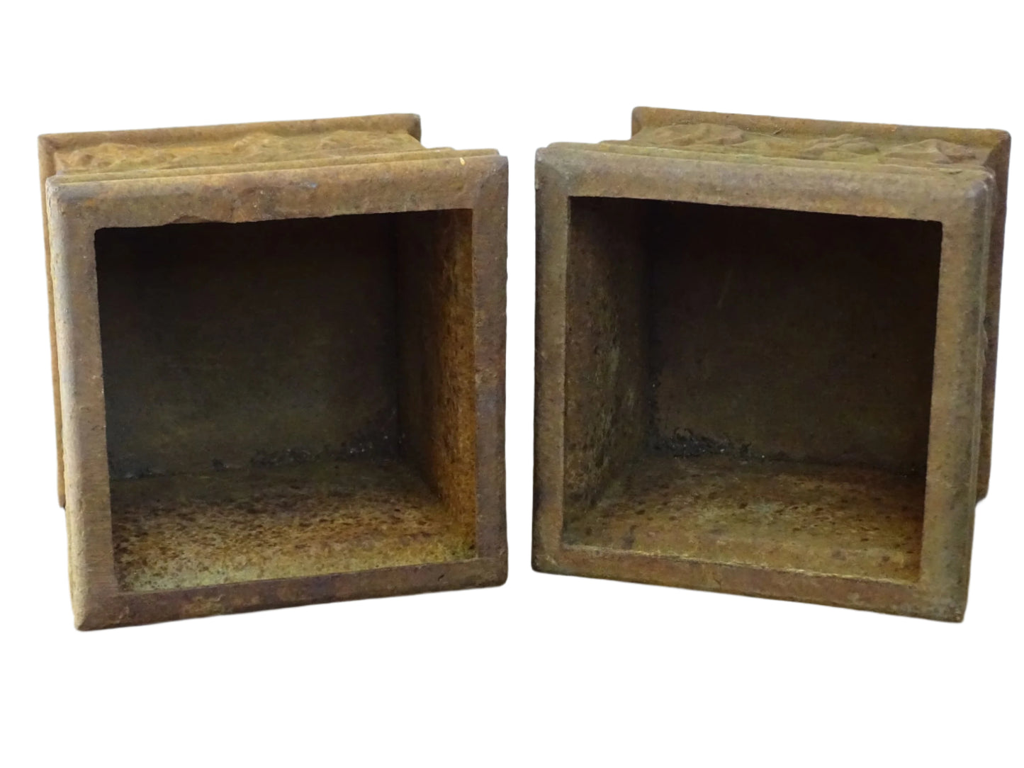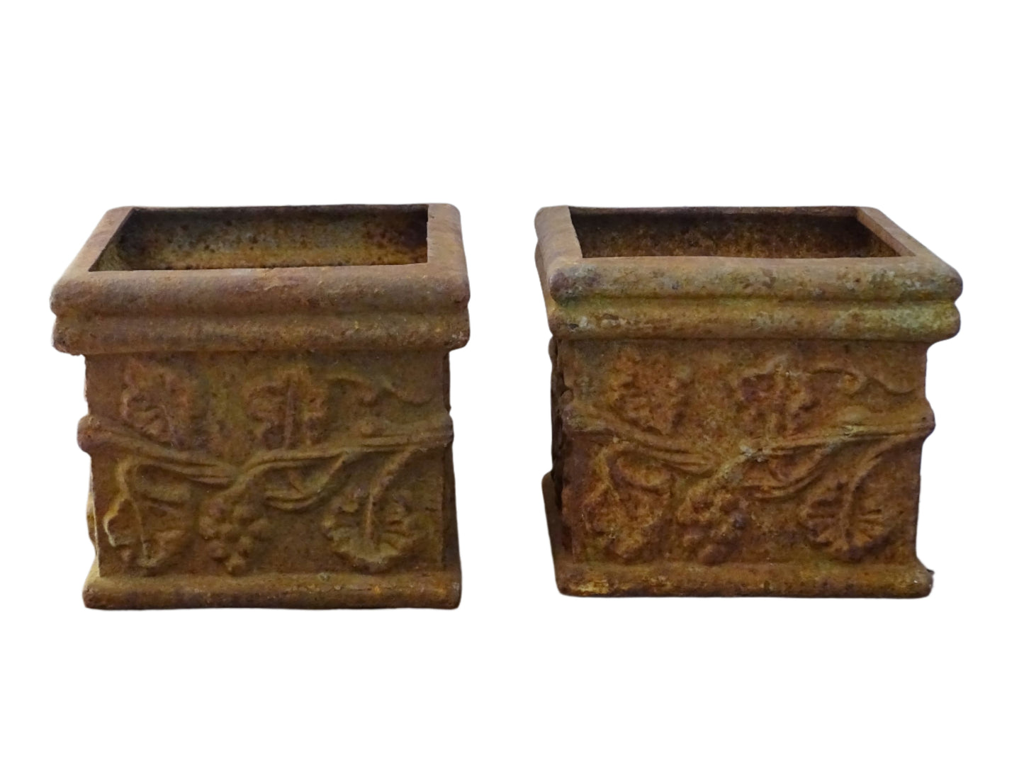 Paire de jardinières anciennes en fonte française. Ces petits pots de fleurs carrés sont décorés sur chaque panneau de raisins et de vignes, si typiquement français. La fonte vieillie et usée par le temps contrasterait à merveille avec de somptueuses plantes vertes. Ils feraient une superbe décoration d'intérieur ou de jardin.