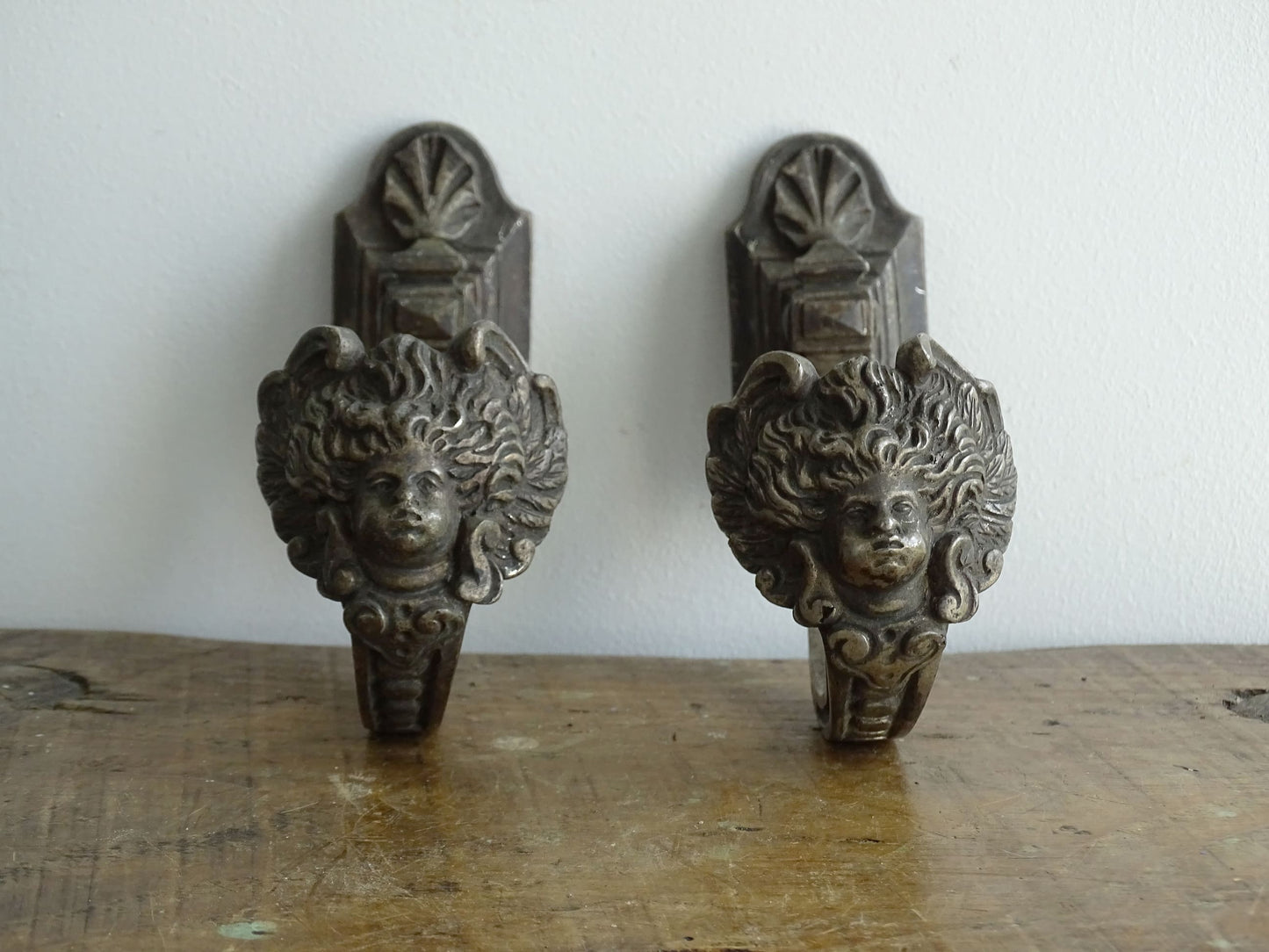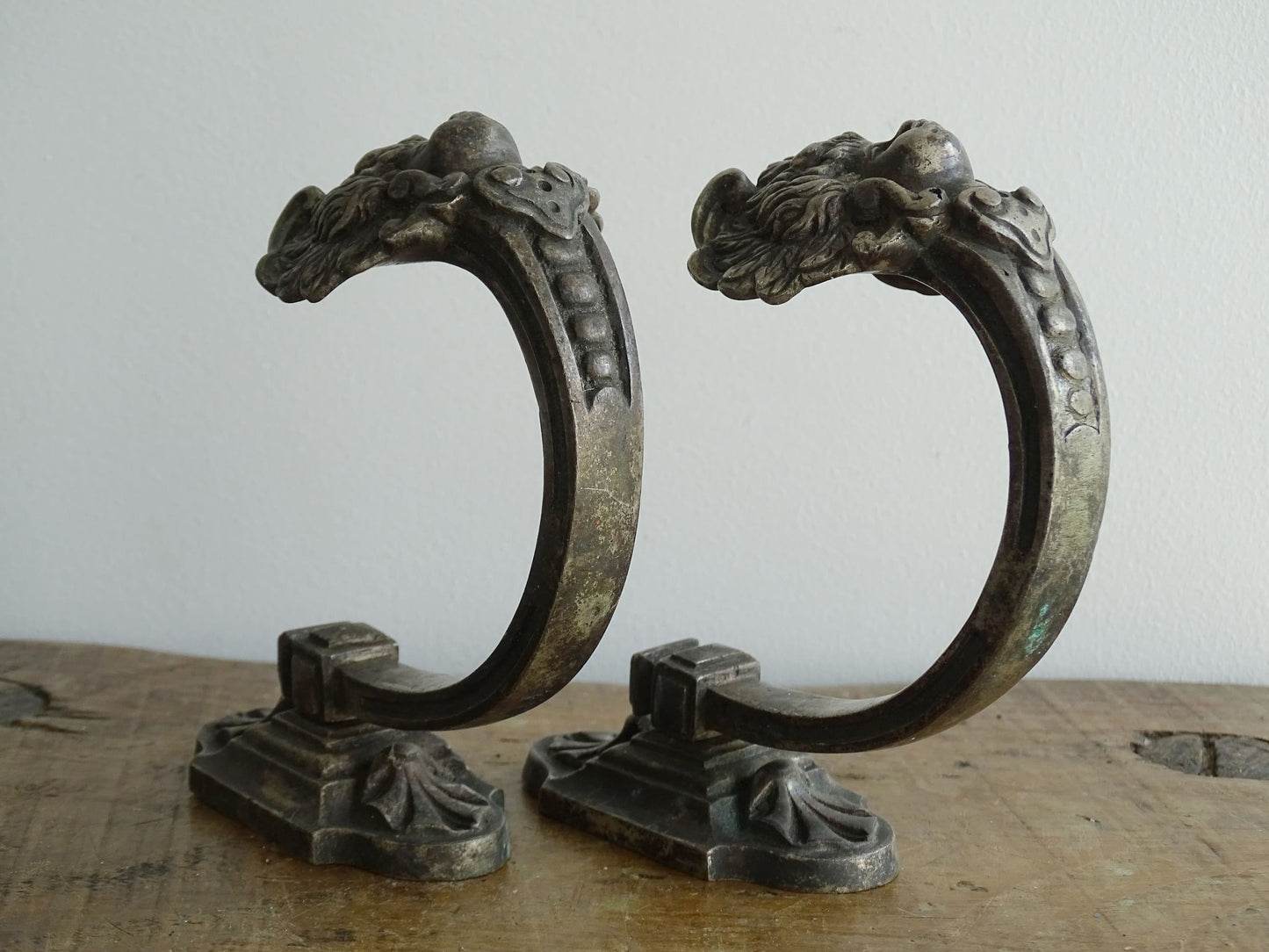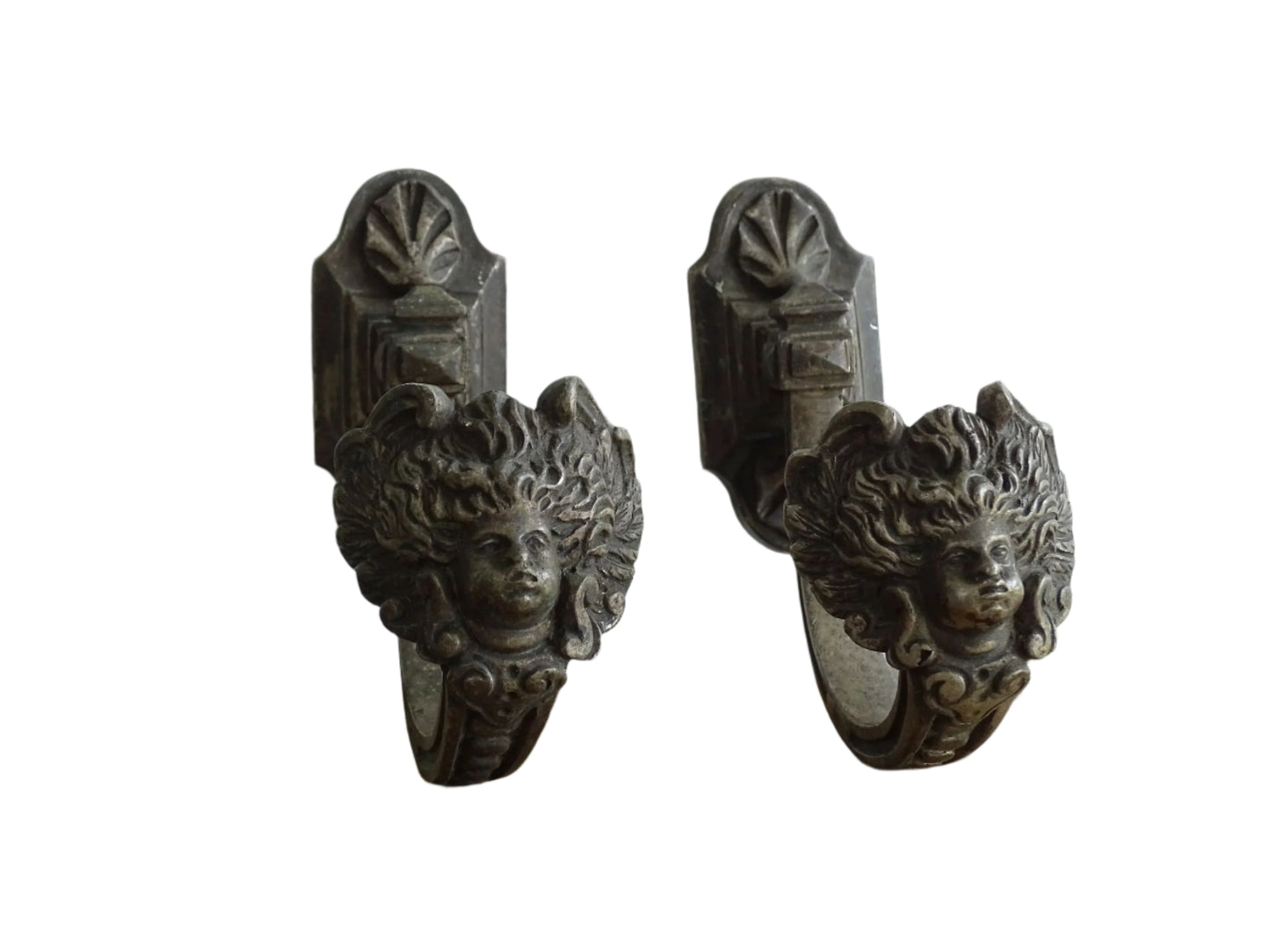 Belle paire d'embrasses à rideaux anciennes françaises marquées L.Dromard. Datant de la seconde moitié du XIXe siècle, elles sont très décorées et ornées de visages (peut-être d'Eole). Ces crochets à rideaux anciens feraient un merveilleux ajout à un salon ou une chambre, ajoutant une touche d'élégance française. Ils pourraient également être utilisés comme crochets dans un couloir ou une cuisine.