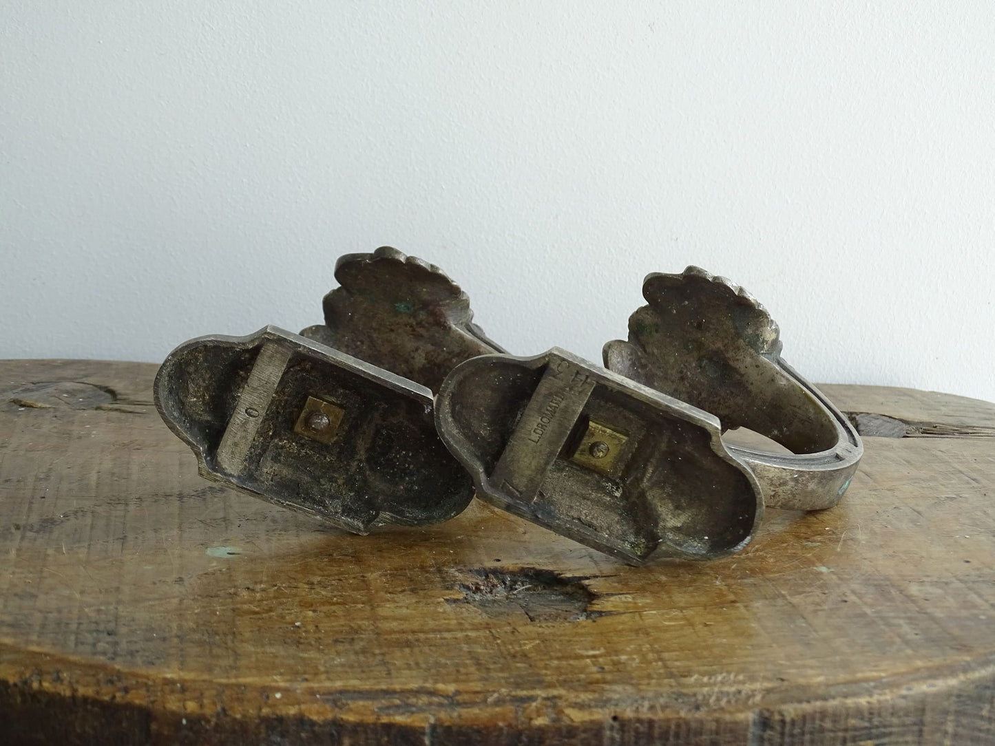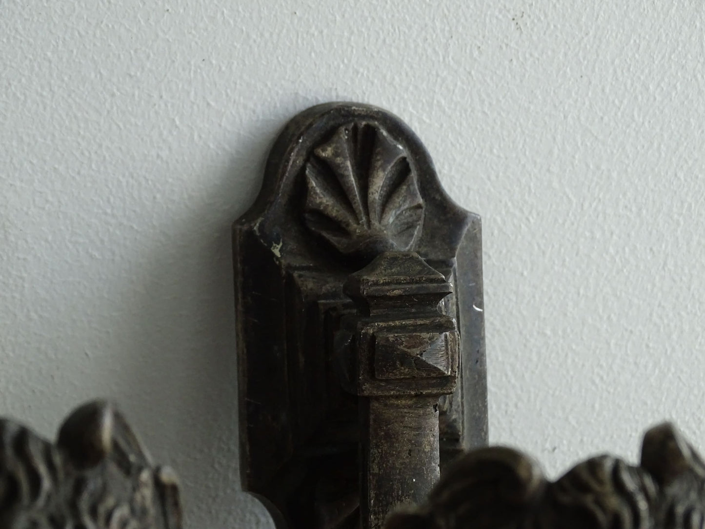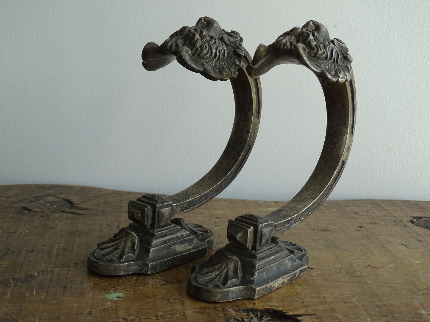Belle paire d'embrasses à rideaux anciennes françaises marquées L.Dromard. Datant de la seconde moitié du XIXe siècle, elles sont très décorées et ornées de visages (peut-être d'Eole). Ces crochets à rideaux anciens feraient un merveilleux ajout à un salon ou une chambre, ajoutant une touche d'élégance française. Ils pourraient également être utilisés comme crochets dans un couloir ou une cuisine.