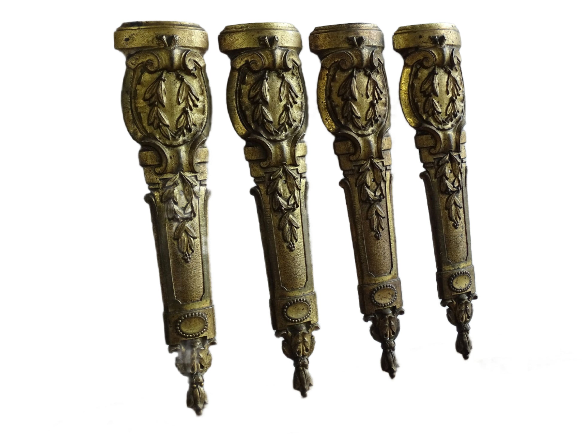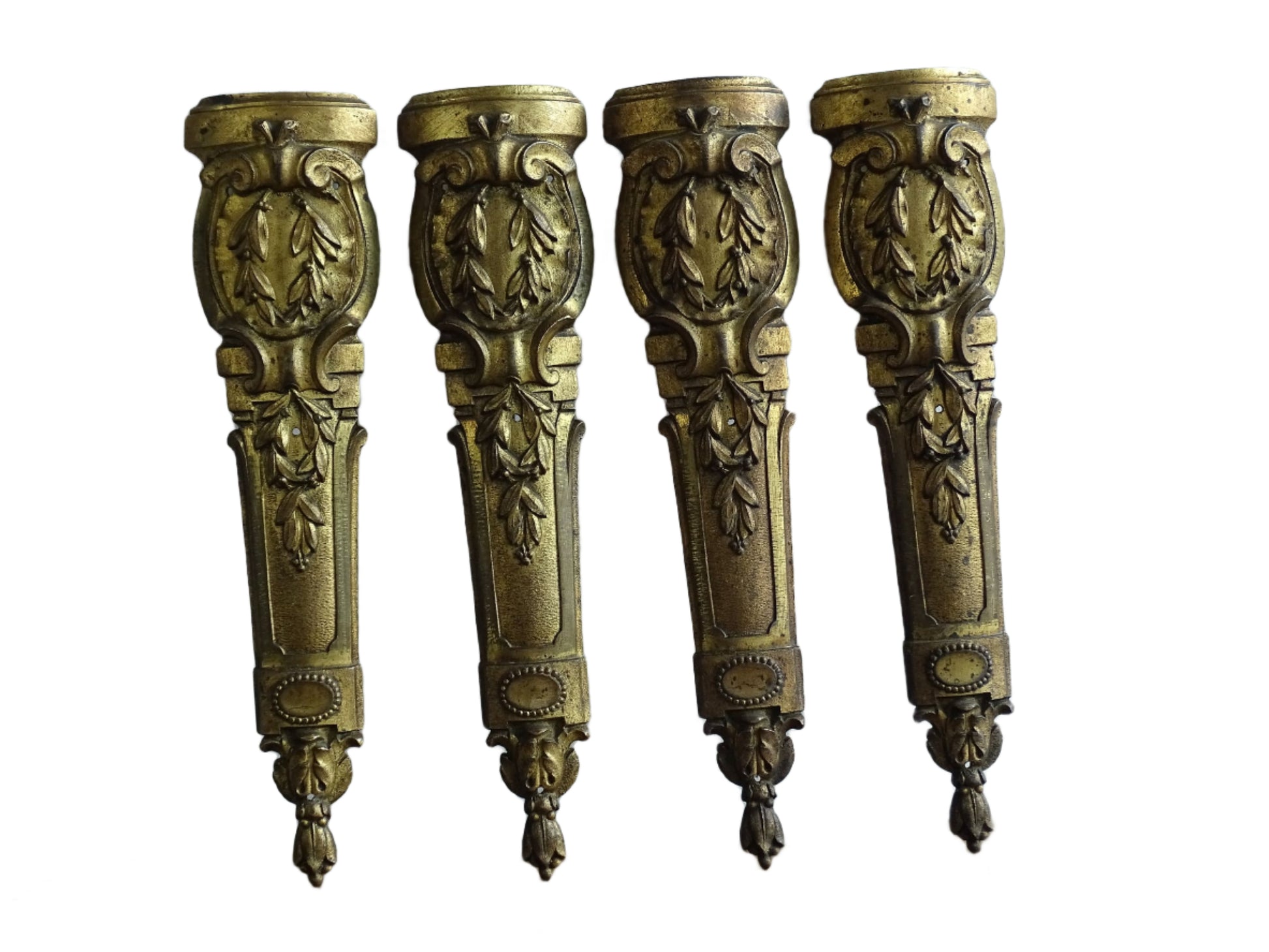 Magnifique ensemble de quatre frontons de meubles anciens français en bronze doré. Ces ornements, ornés de feuilles et de volutes, sont très décoratifs et auraient été utilisés pour décorer les pieds des meubles. Aujourd'hui, ces décorations en bronze doré pourraient encore être utilisées comme prévu à l'origine, ou peut-être exposées sur une console à côté d'autres pièces anciennes.