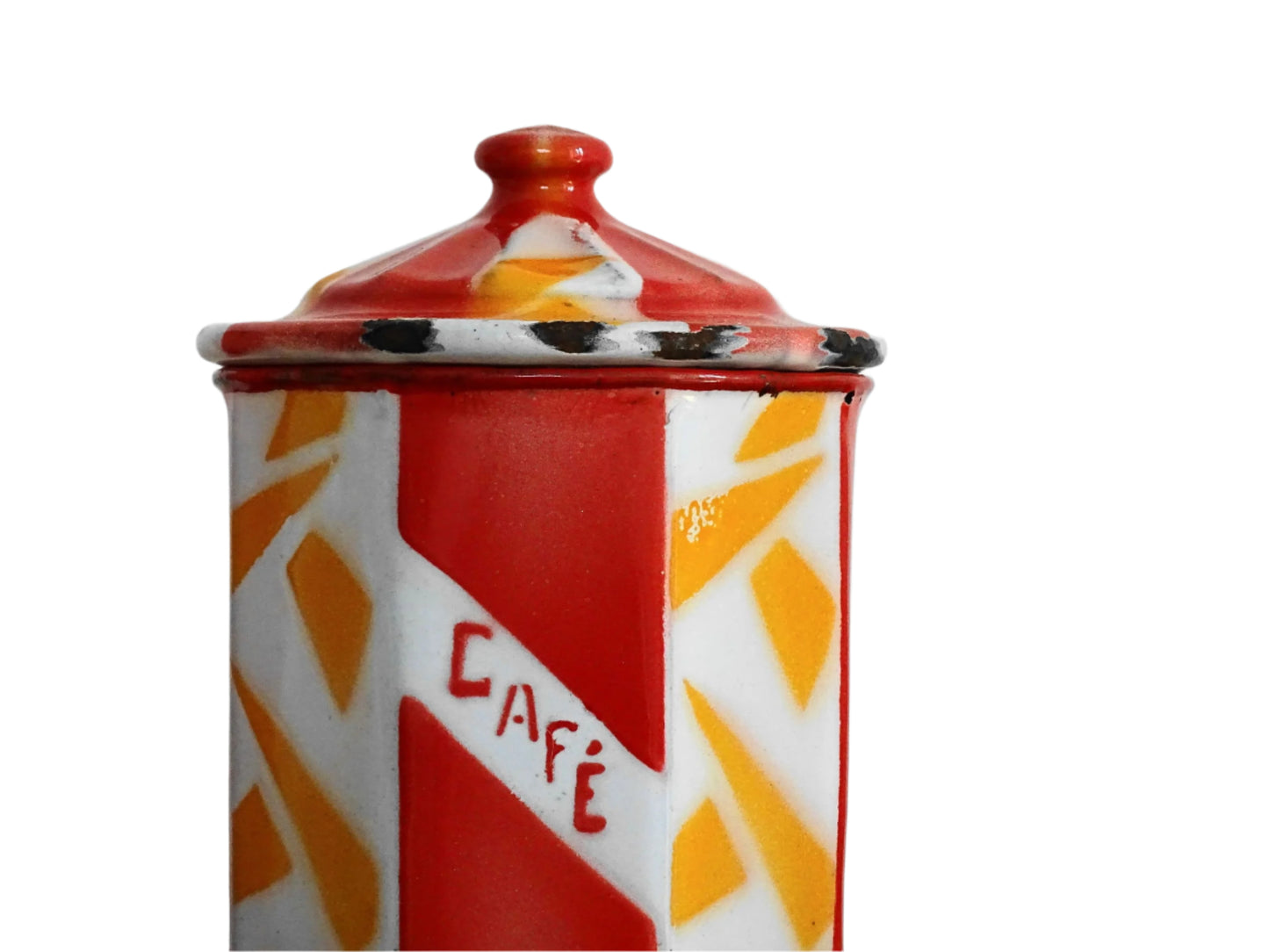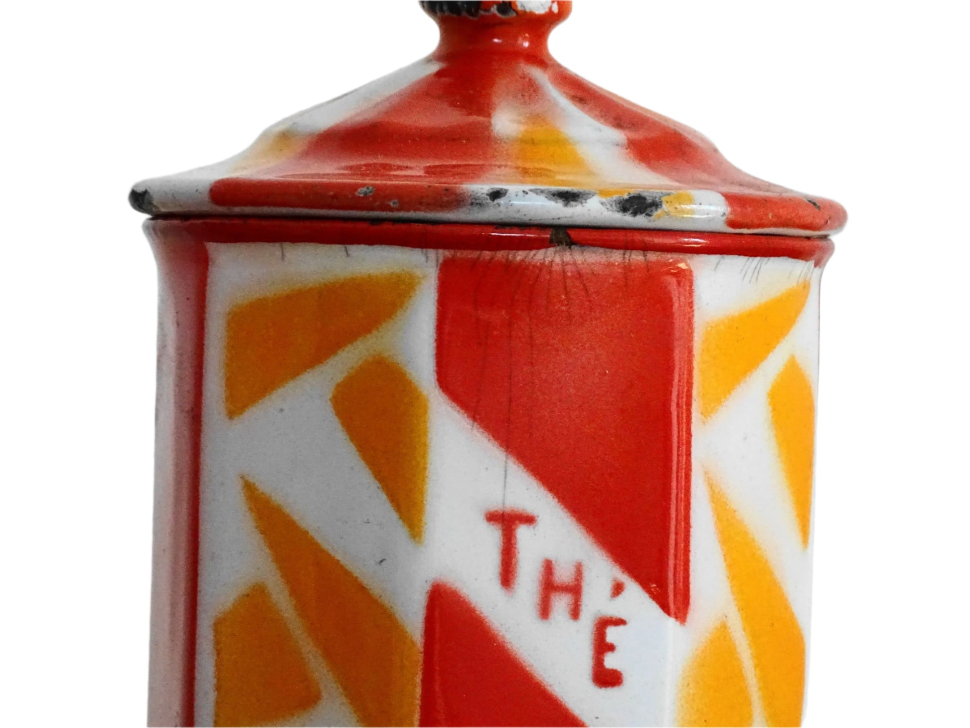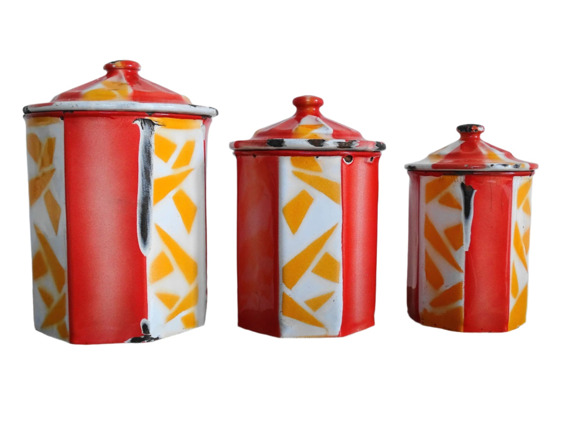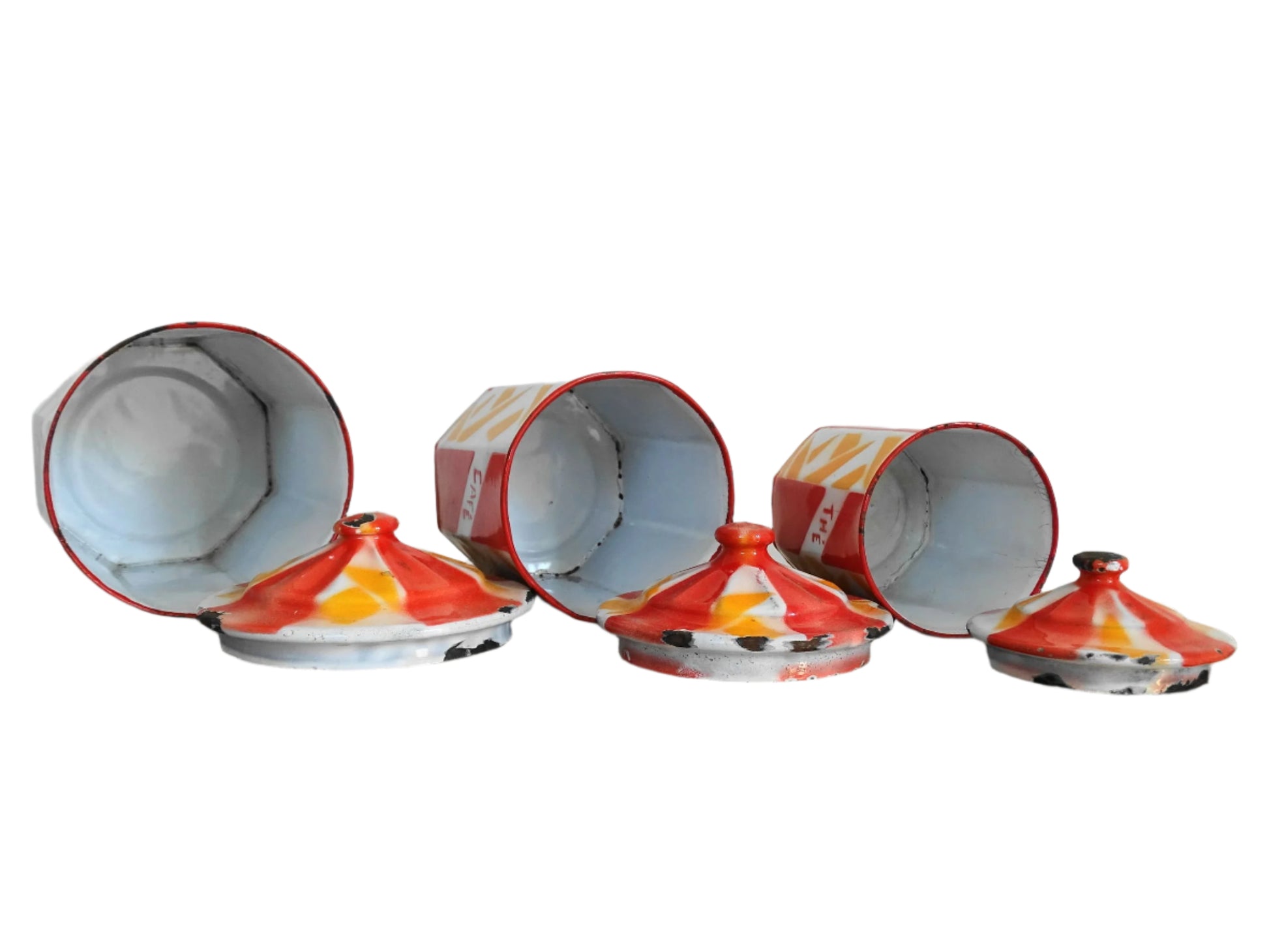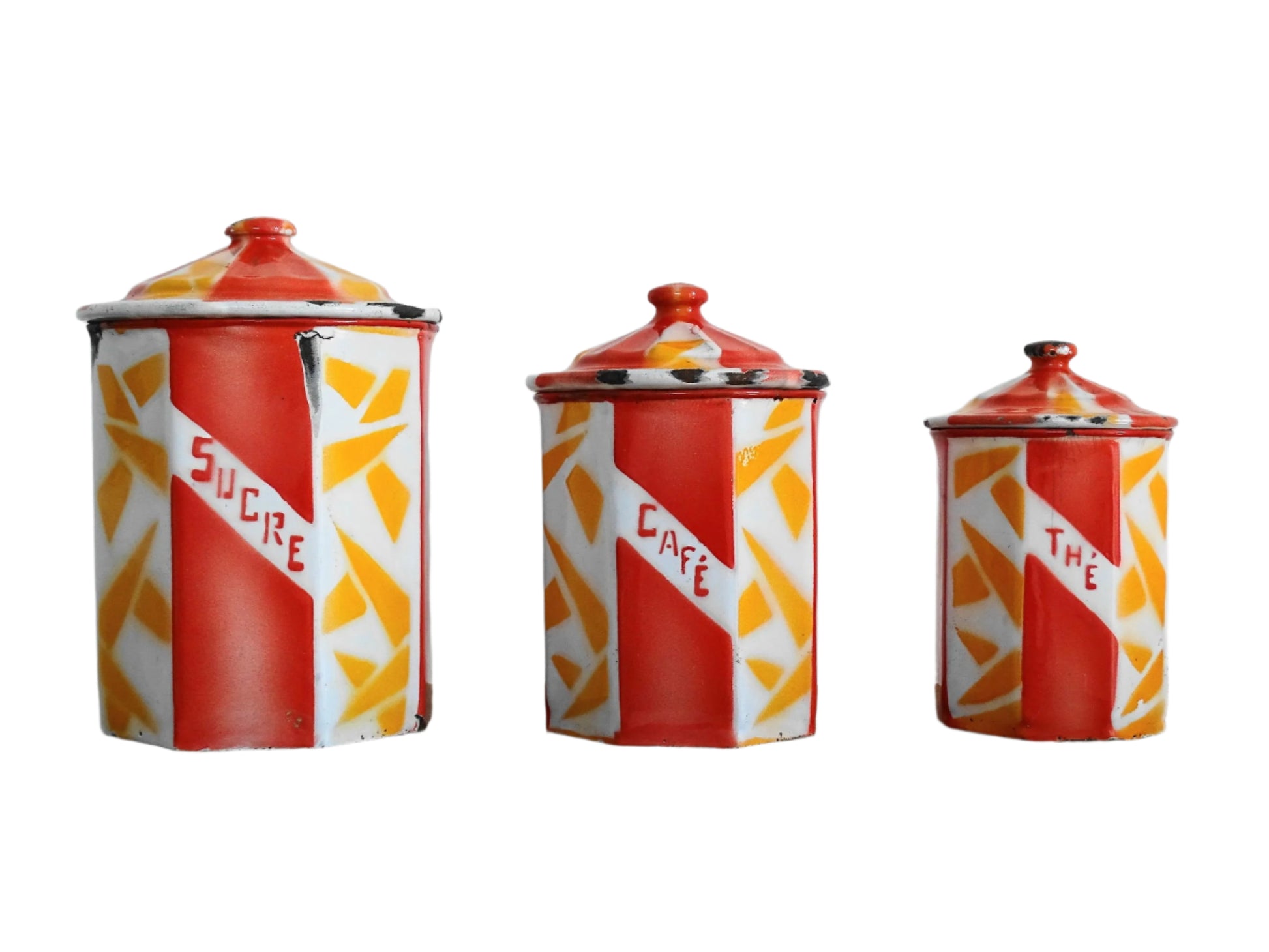 Ensemble de boîtes en émail vintage français en rouge et orange. Ces boîtes de cuisine vintage ajouteront une touche de dynamisme à votre décor. Comprend : Sucre, Café et Thé (sucre, café et thé). Une combinaison parfaite ! Exposez cette vaisselle en émail français sur votre comptoir de cuisine ou sur une étagère pour ajouter une touche de couleur.