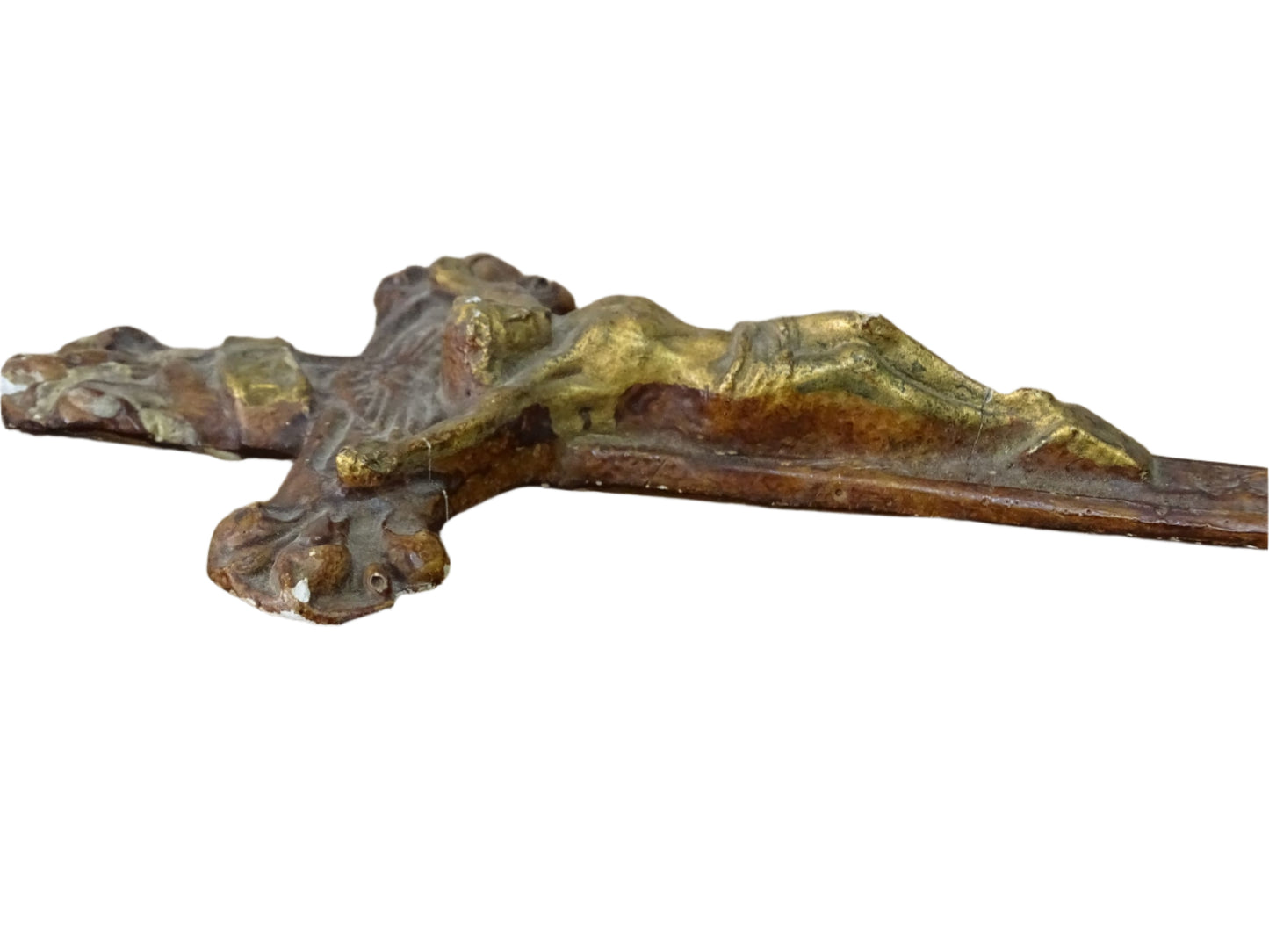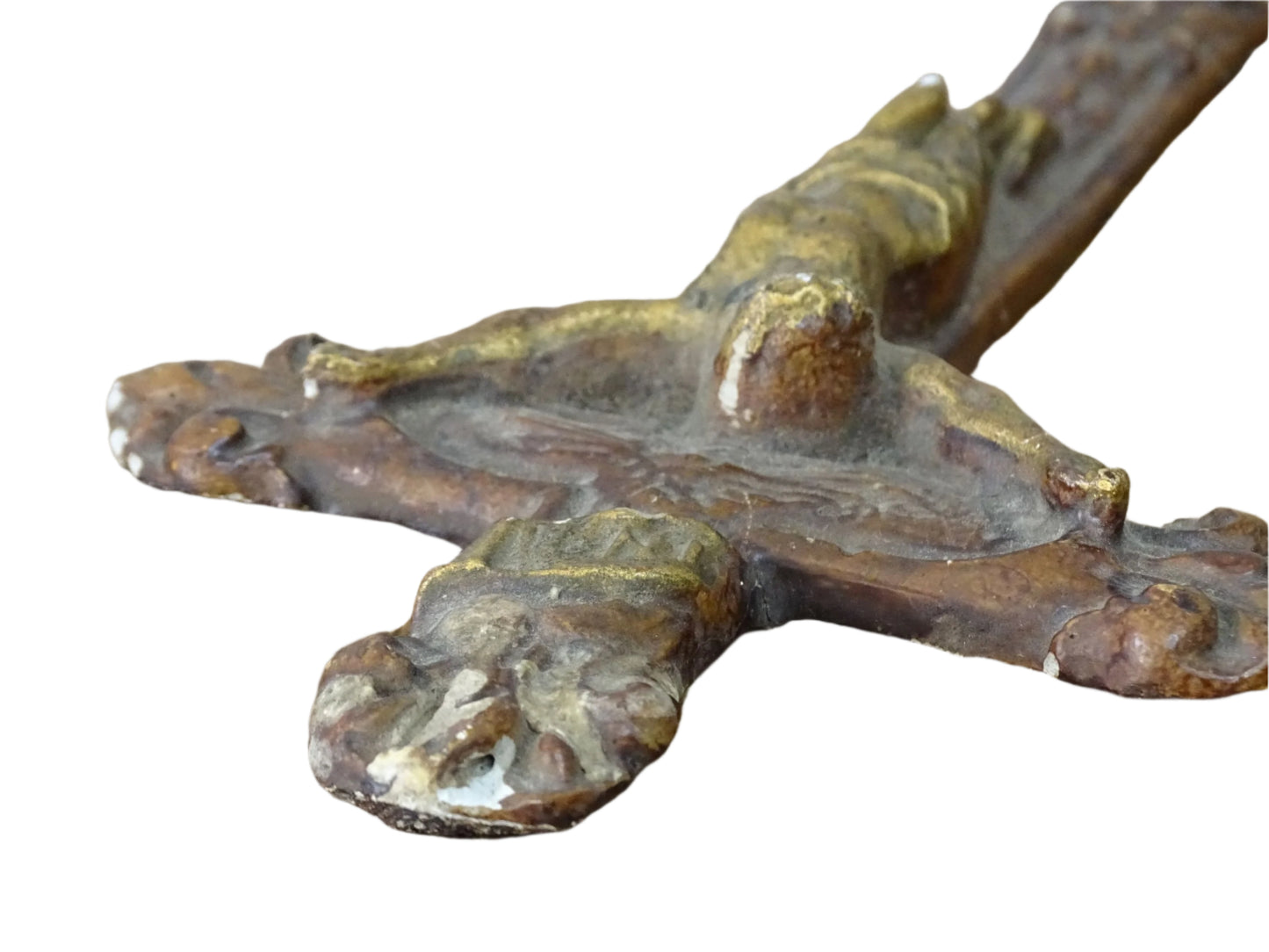 Petit crucifix ancien français orné en bois et plâtre avec le Christ peint en or. C'est une pièce très décorative avec une belle patine. Exposez cette croix ancienne parmi une collection de décoration religieuse.