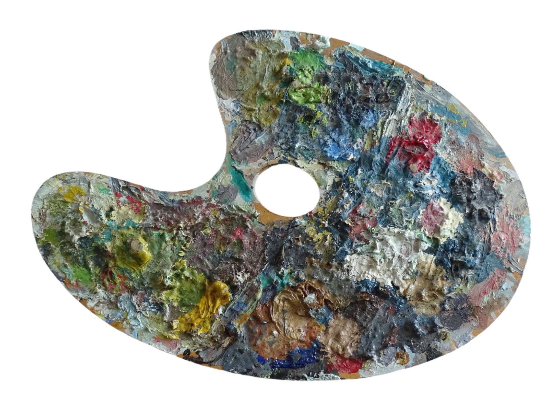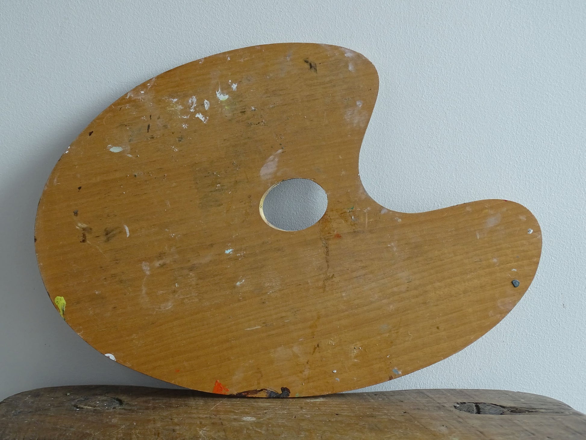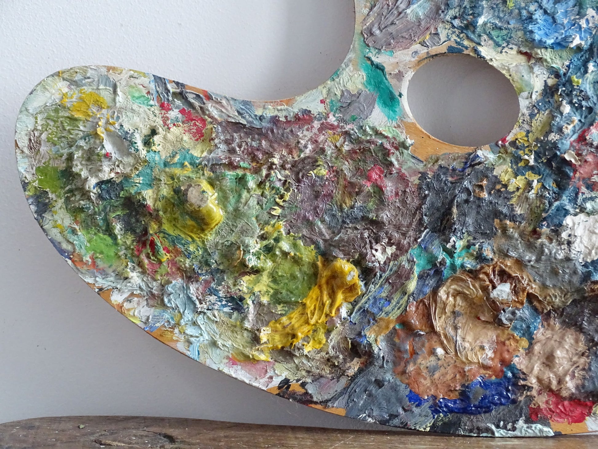 Palette d'artiste française vintage avec de belles couches de peinture de différentes couleurs. Elle date du milieu du XXe siècle et ferait une superbe pièce d'exposition.