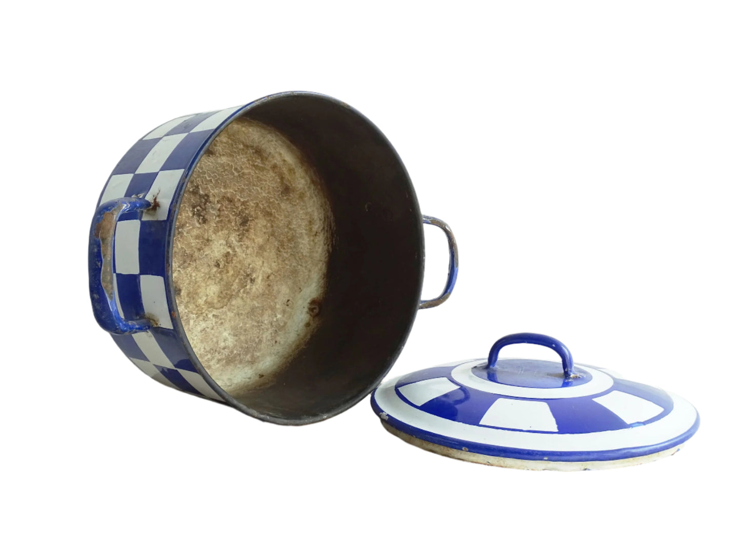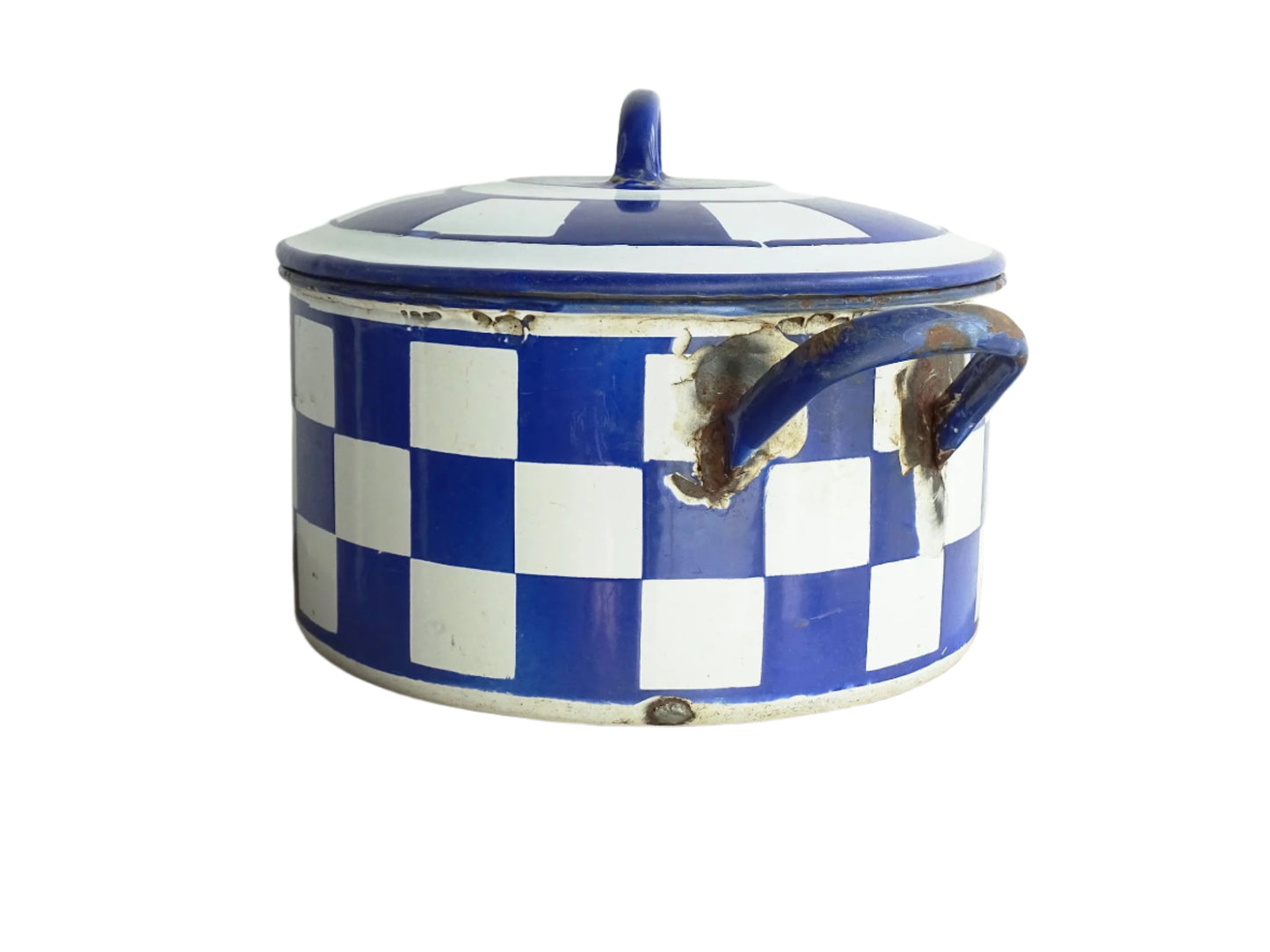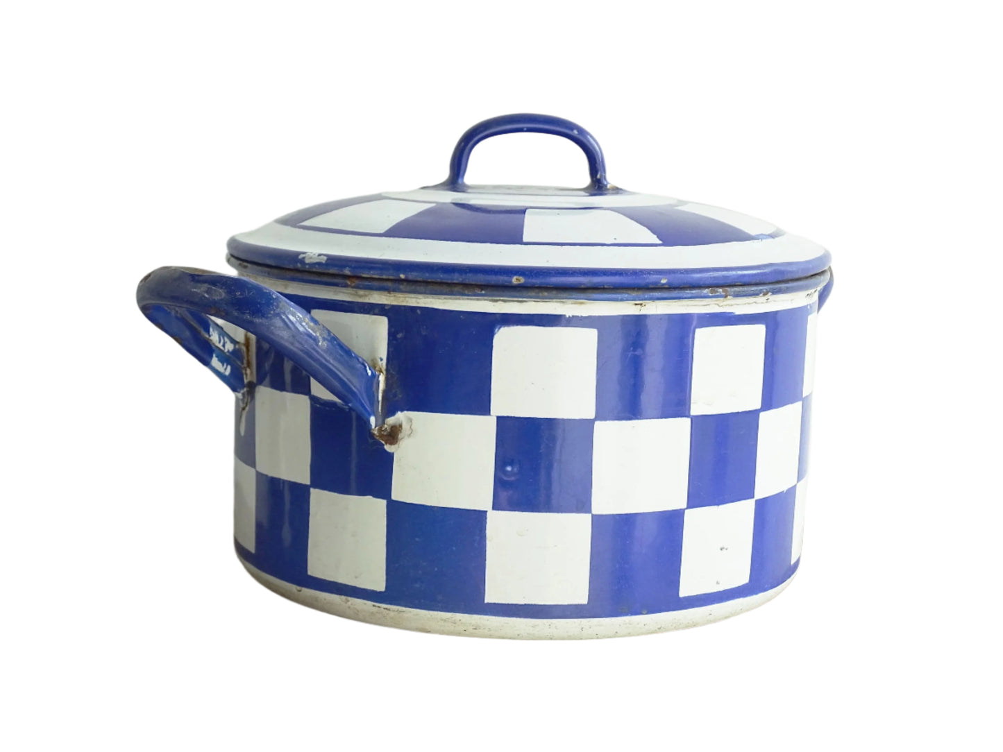 Cocotte en émail bleu et blanc typiquement française au motif à carreaux. Elle serait superbe posée sur une étagère de cuisine avec cette touche de charme français vintage.