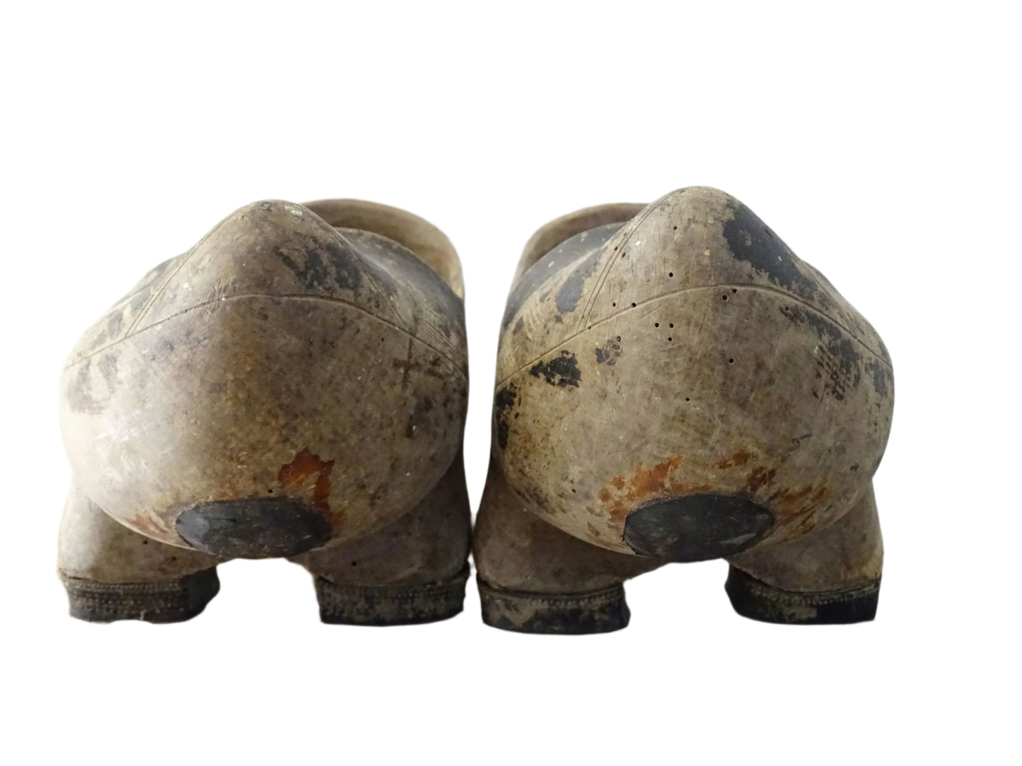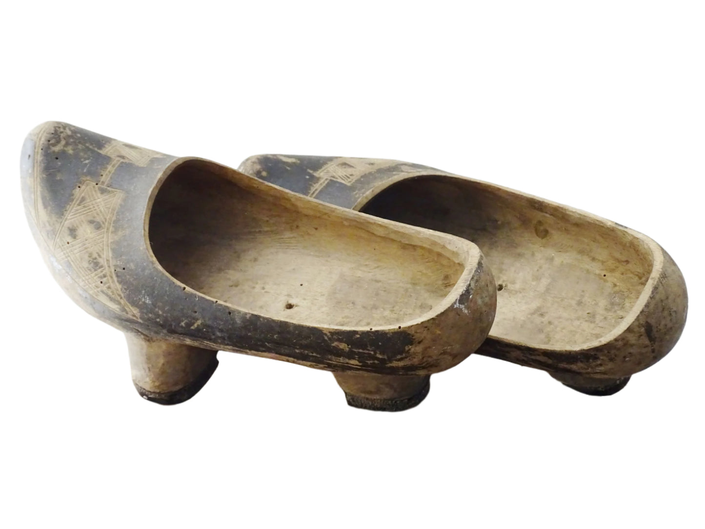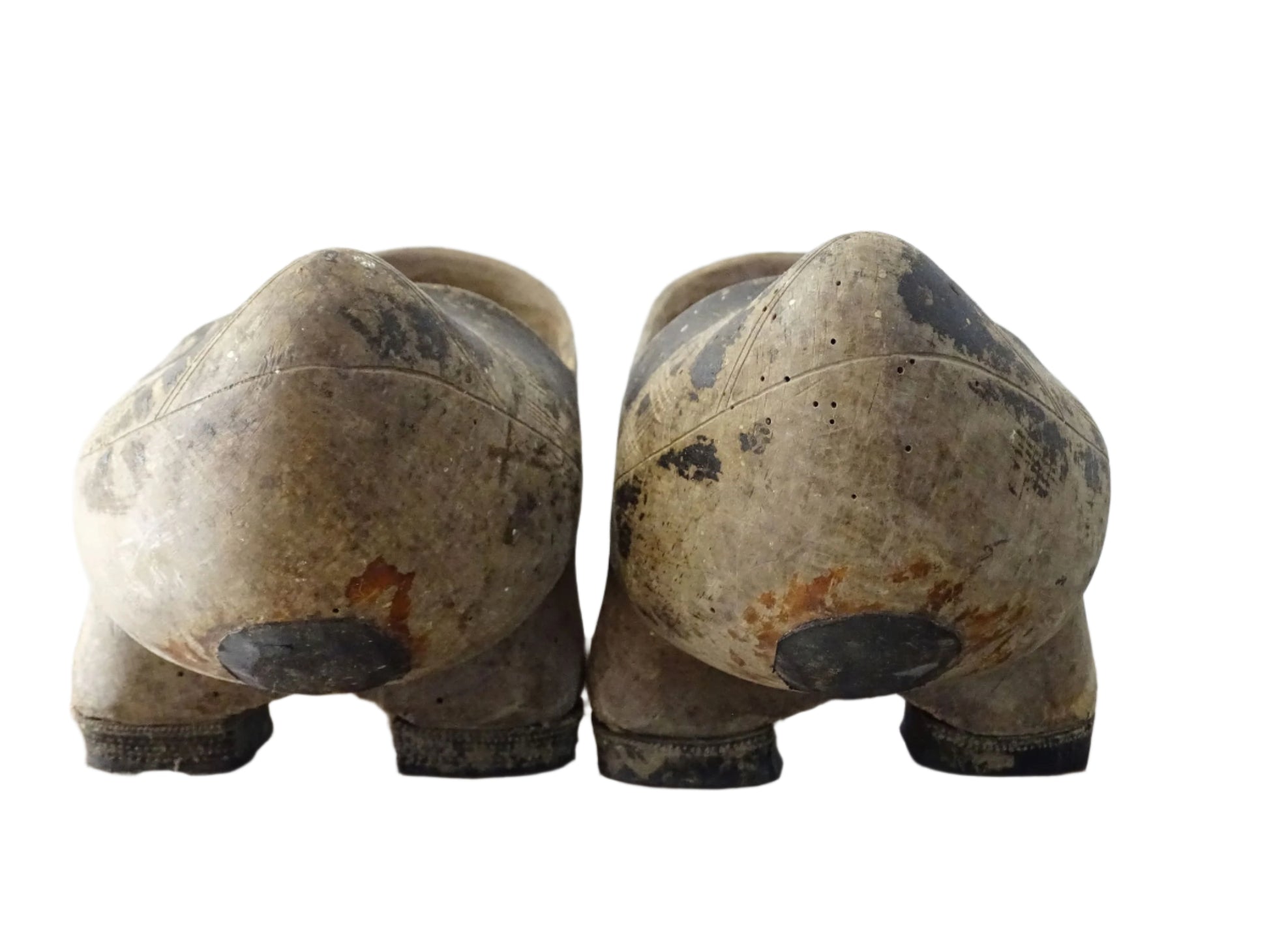 Sabots en bois de style cantabrique, originaires des zones rurales de Cantabrie, dans le nord de l'Espagne. Fabriqués chacun à partir d'une seule pièce de bois, ils sont dotés de trois échasses sur la partie inférieure. Ces pièces usées par le temps feraient une merveilleuse curiosité décorative.