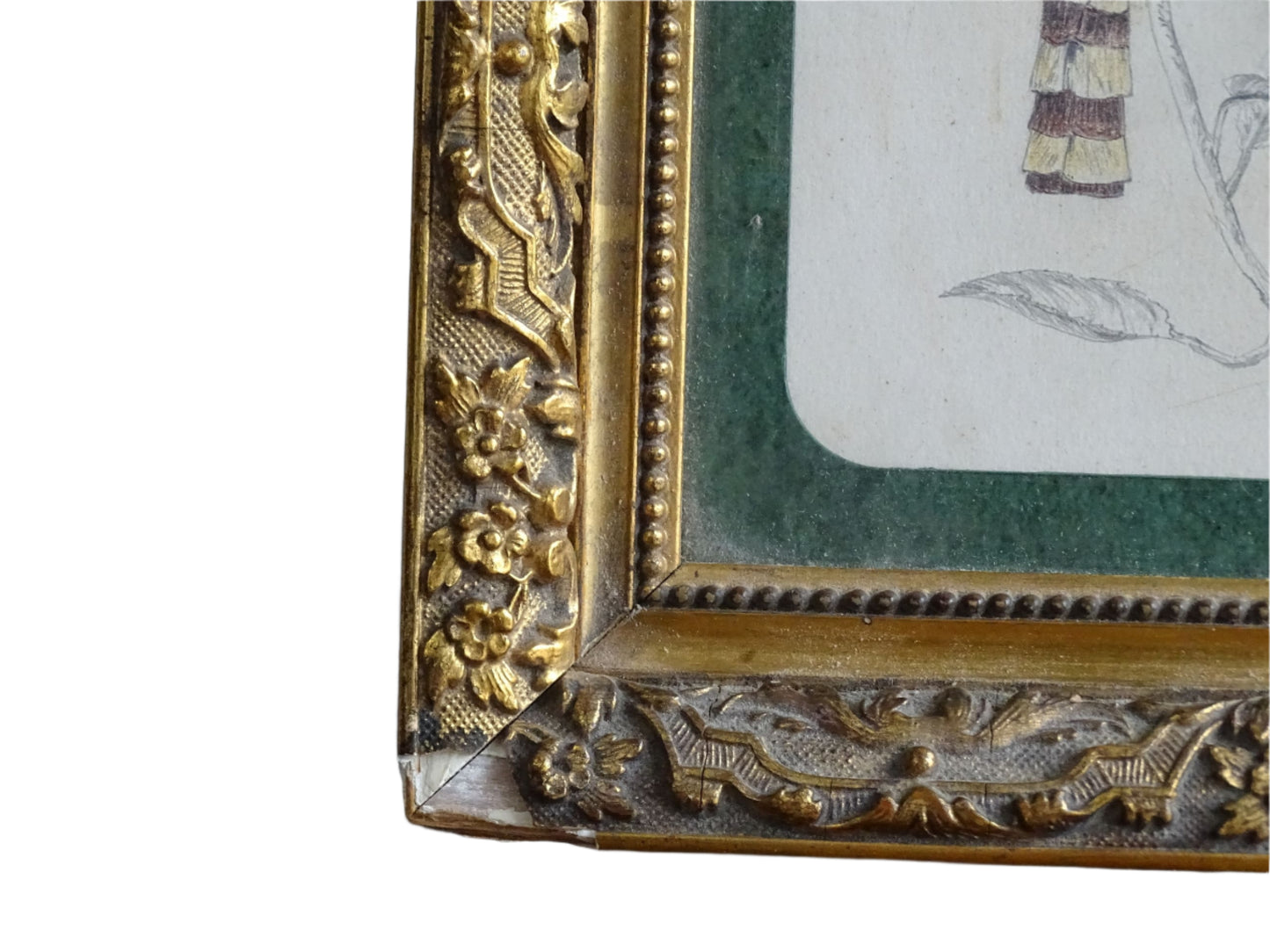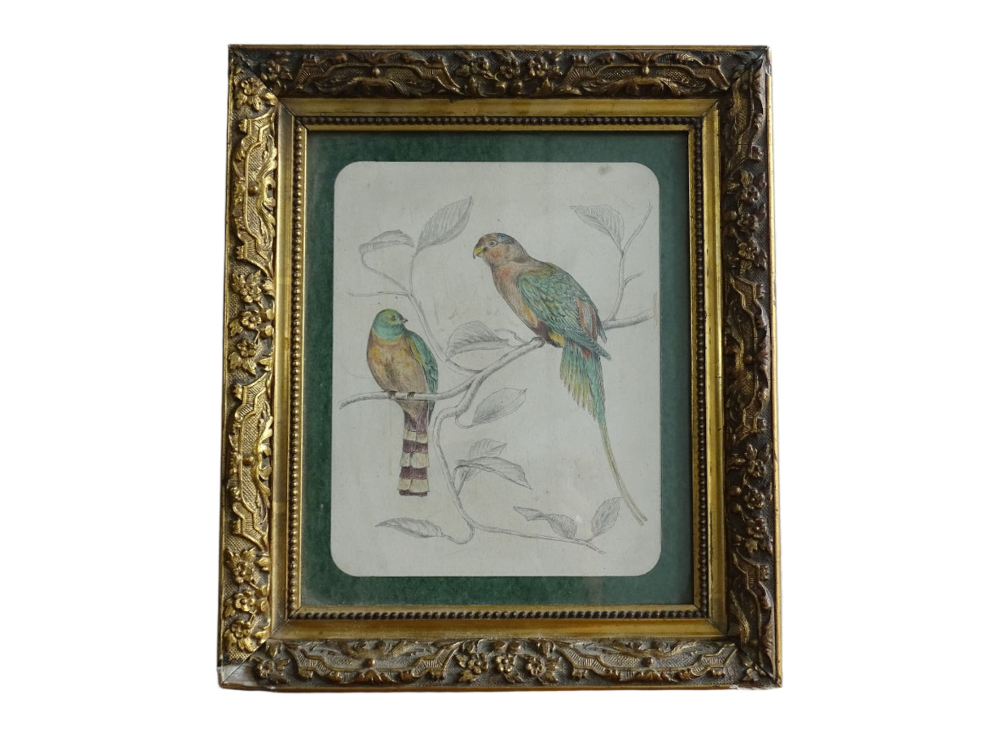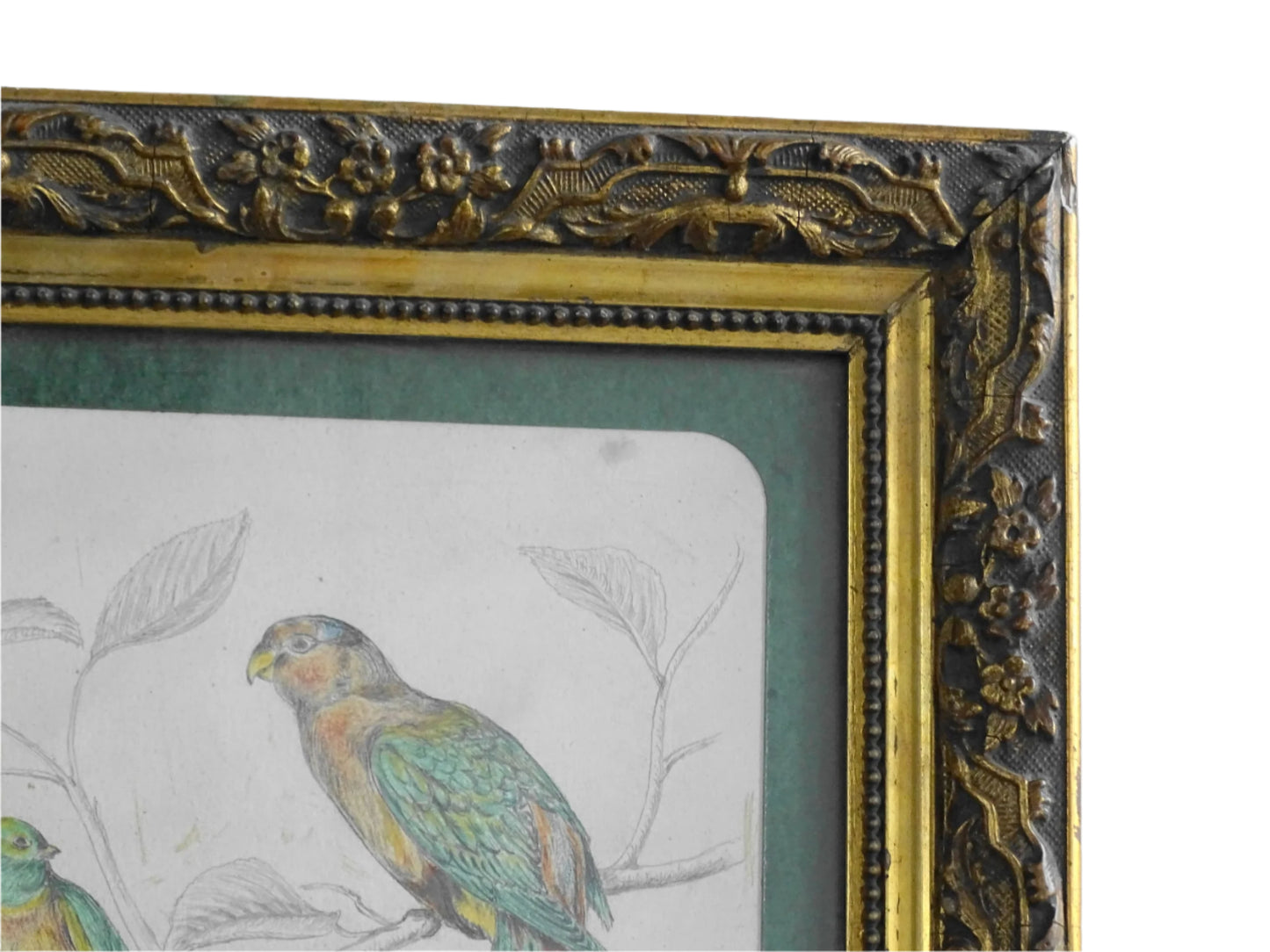 Beautiful French antique drawing of birds in coloured pencil dating to the late 19th century. This original bird study is framed in a gorgeous, highly decorative, gilt frame. The birds are beautifully detailed and it would make a wonderful decorative accent.