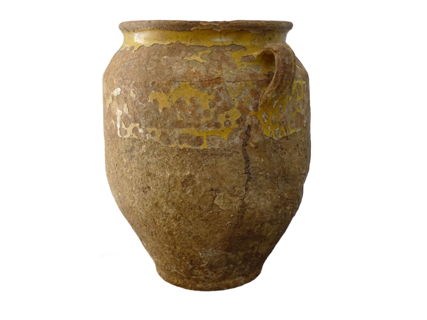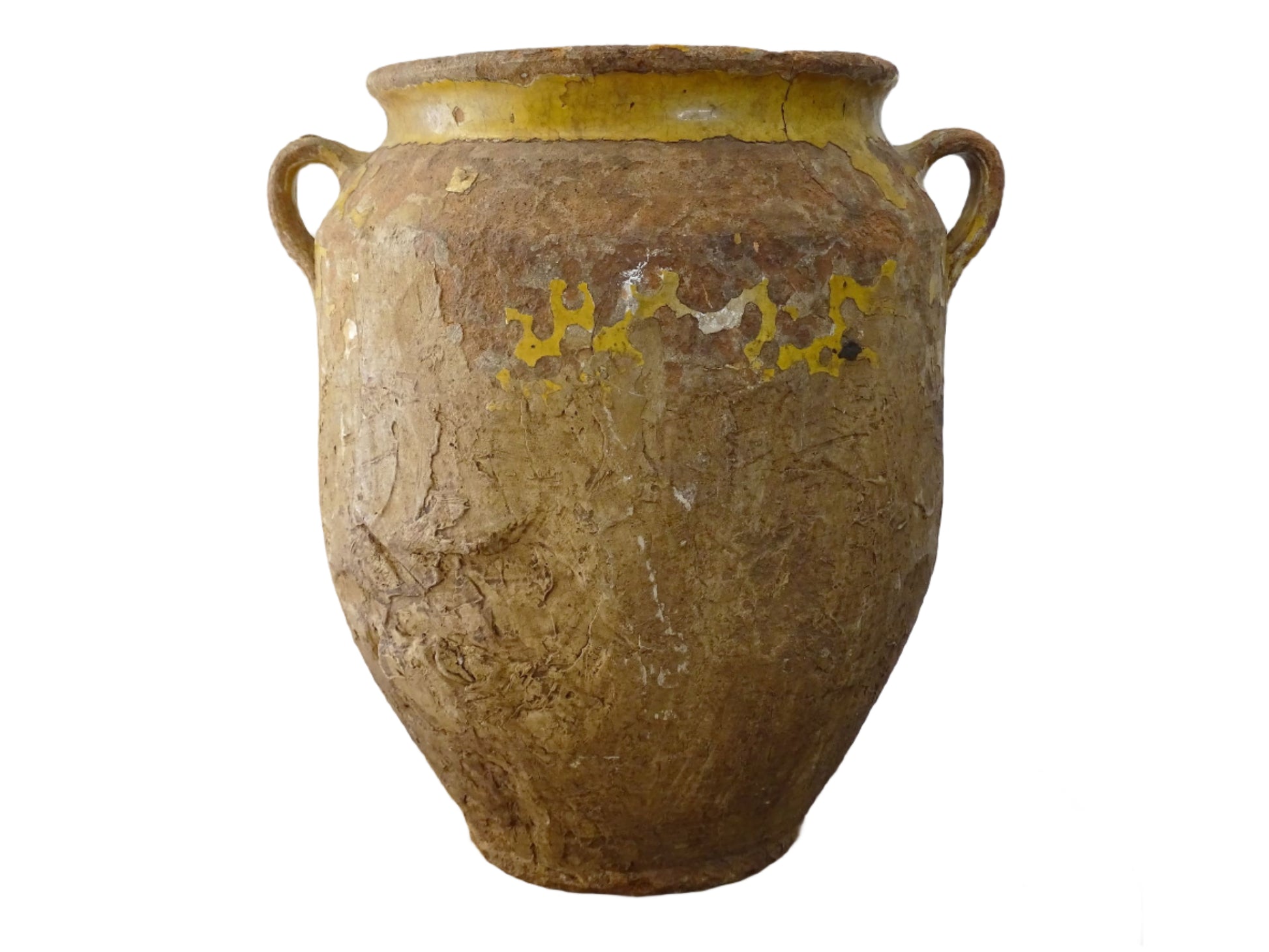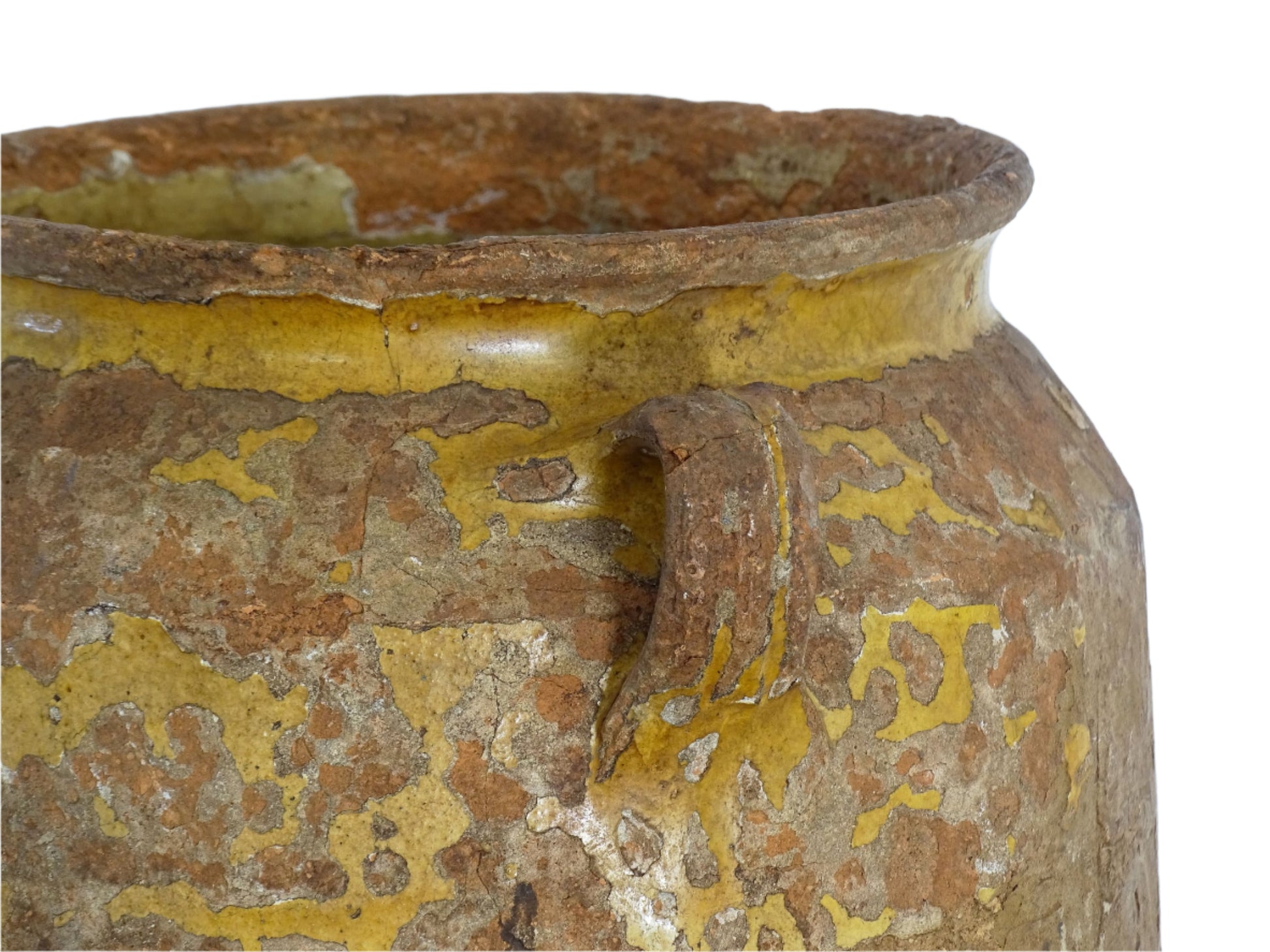 Antique French confit pot with yellow glaze, dating to the eighteenth century. Originally used to preserve meats in the South of France, the terracotta has an incredibly rich patina. This confit jar would look beautiful as a piece of statement decor on a console table or kitchen counter, fill it with dried lavender for that extra touch of French charm.