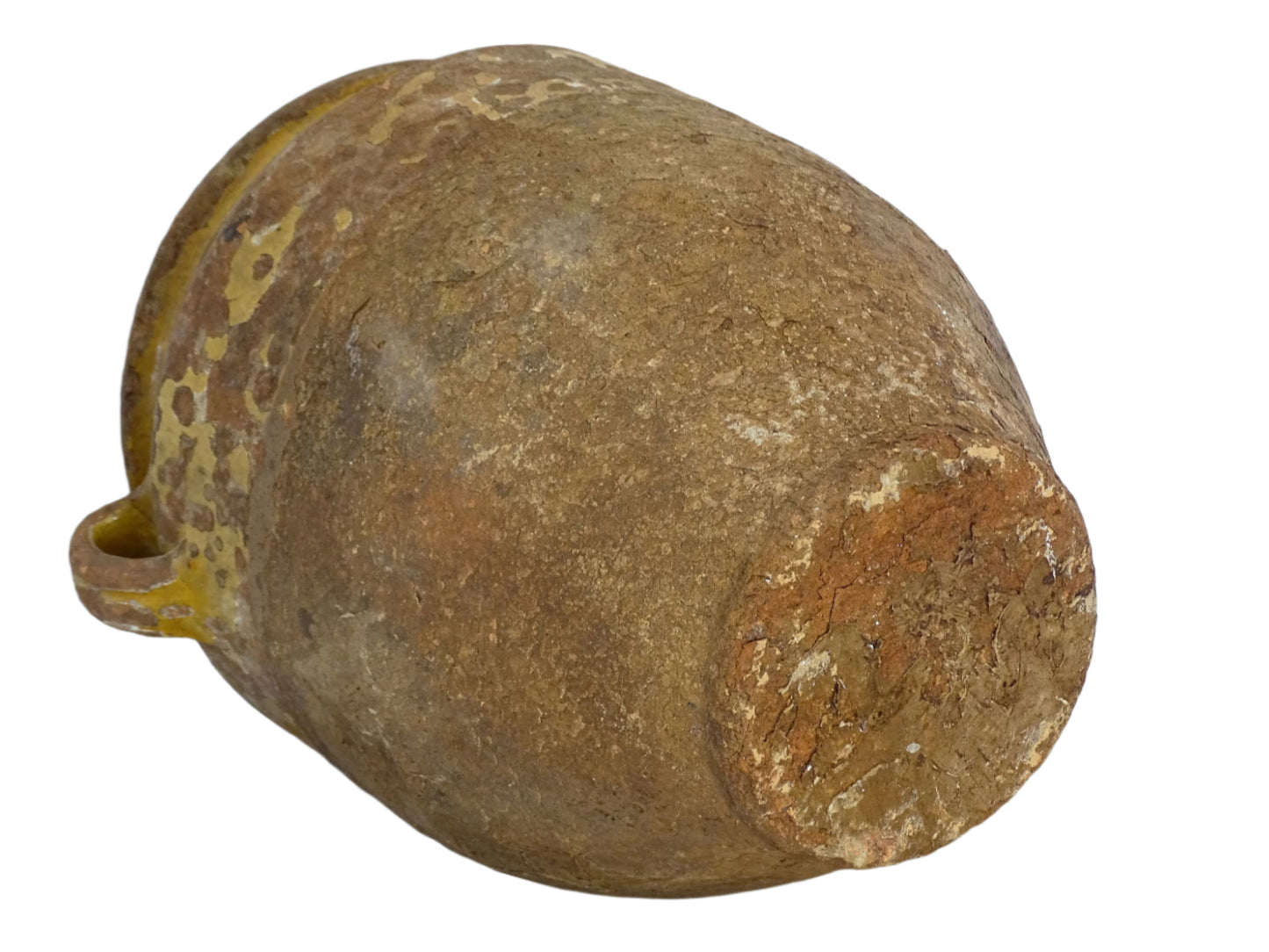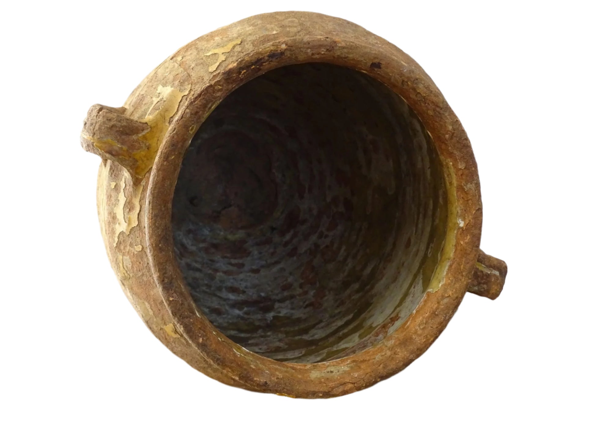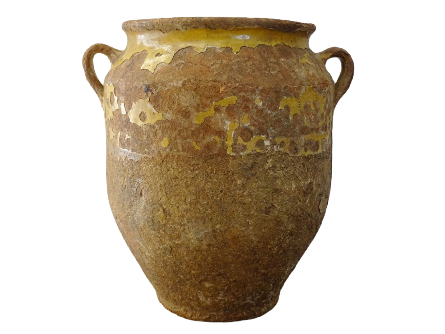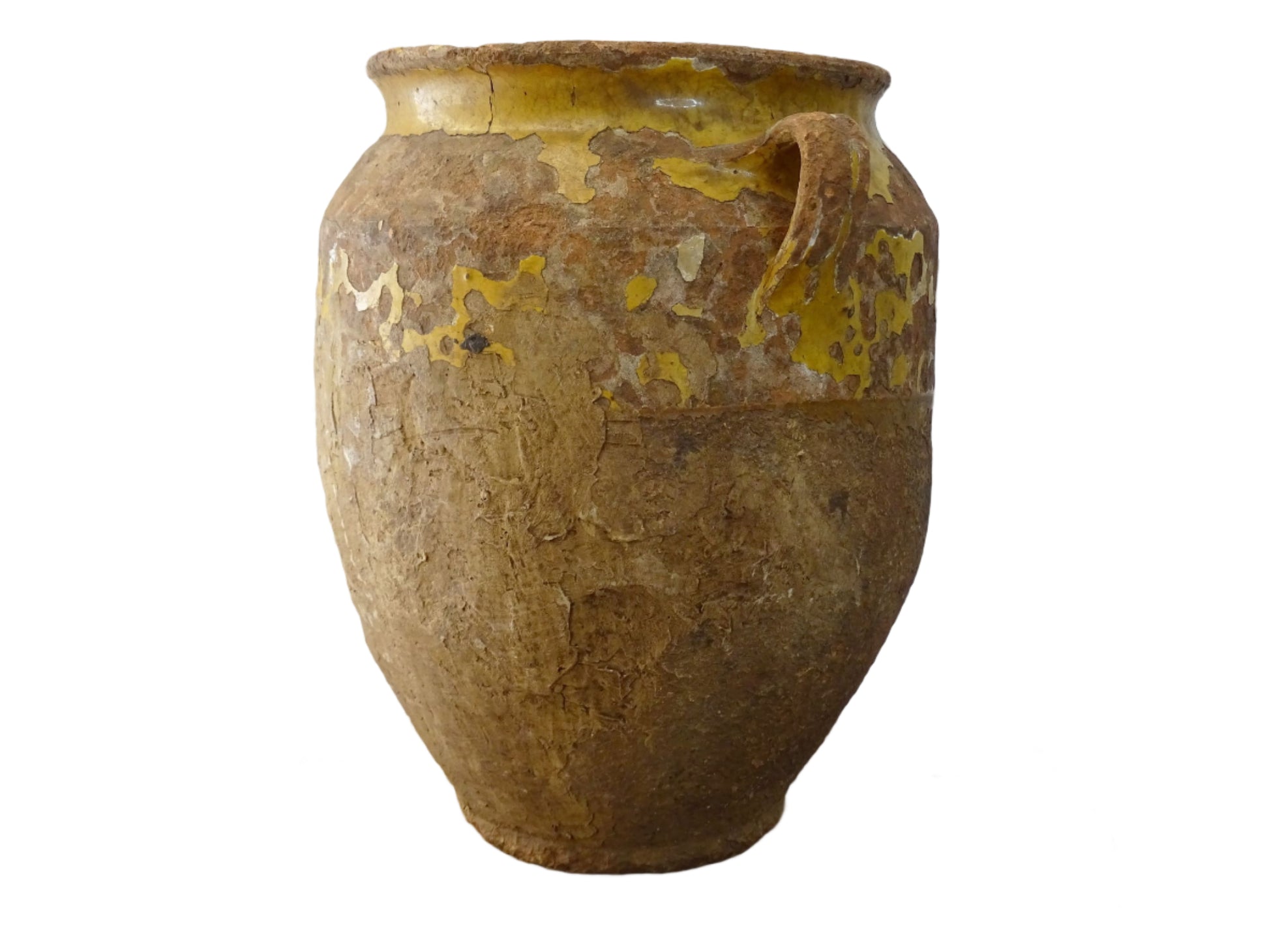 Antique French confit pot with yellow glaze, dating to the eighteenth century. Originally used to preserve meats in the South of France, the terracotta has an incredibly rich patina. This confit jar would look beautiful as a piece of statement decor on a console table or kitchen counter, fill it with dried lavender for that extra touch of French charm.