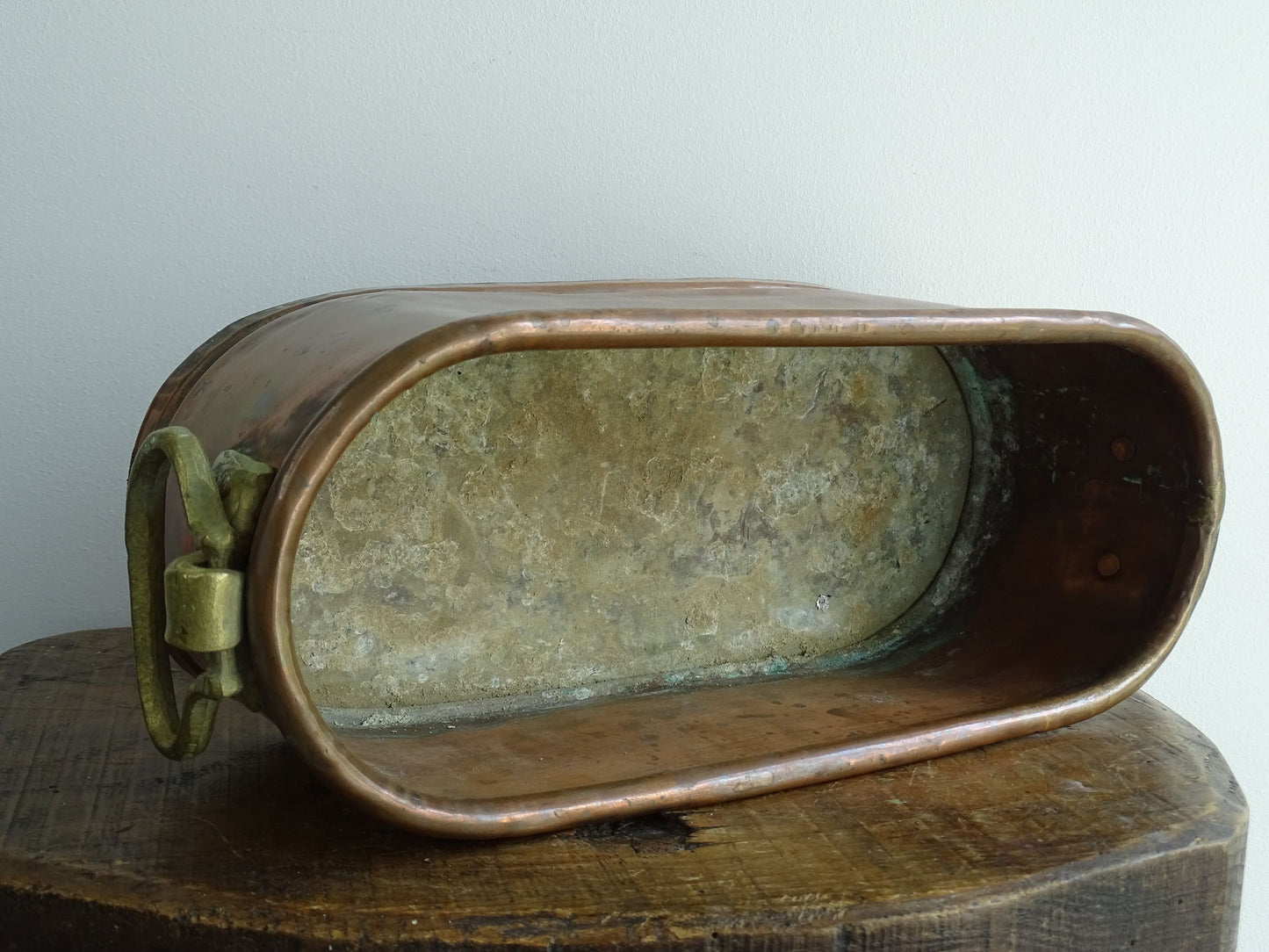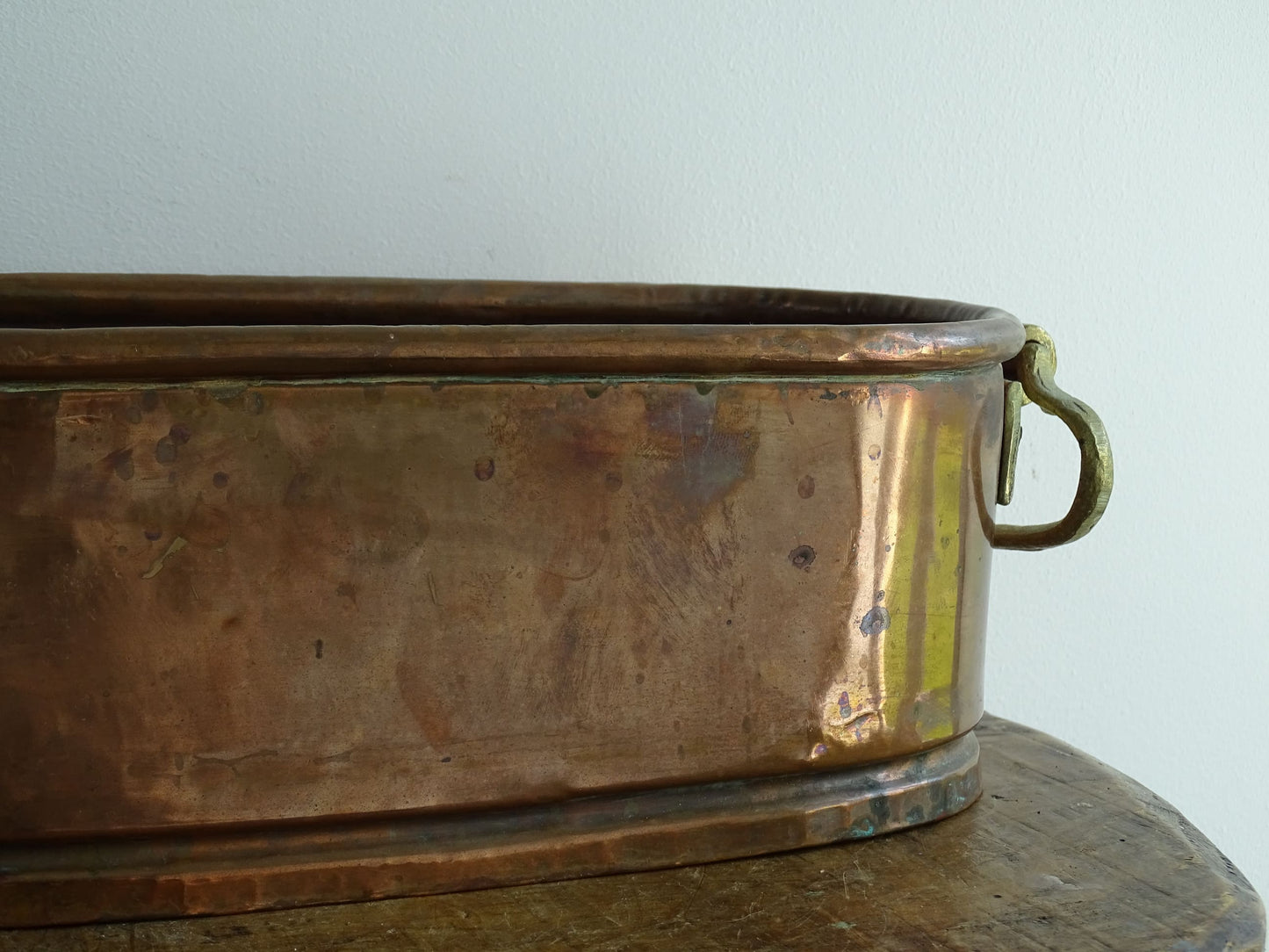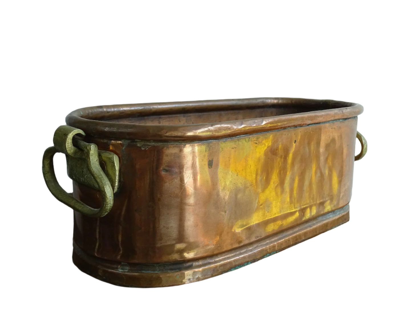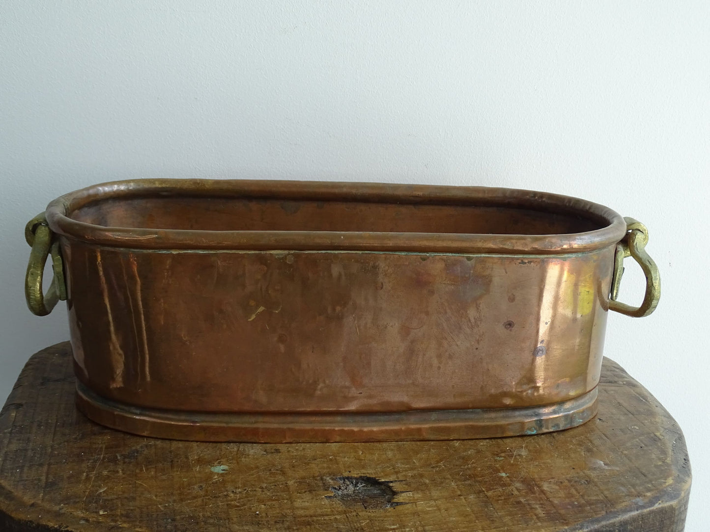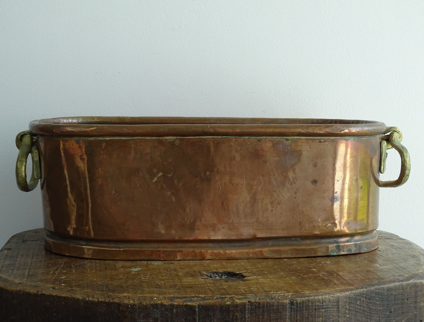 Antique French copper planter with brass handles. It would make a great decoration filled with luscious green plants.