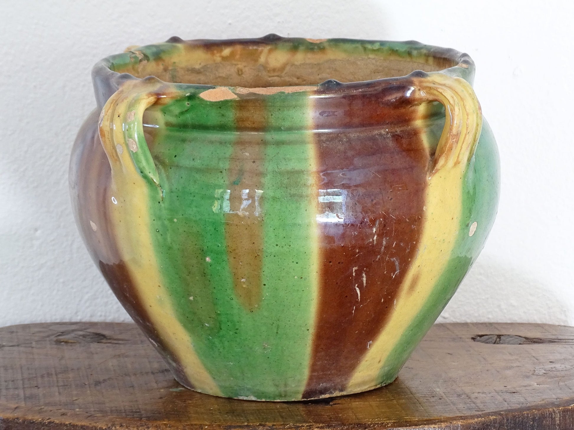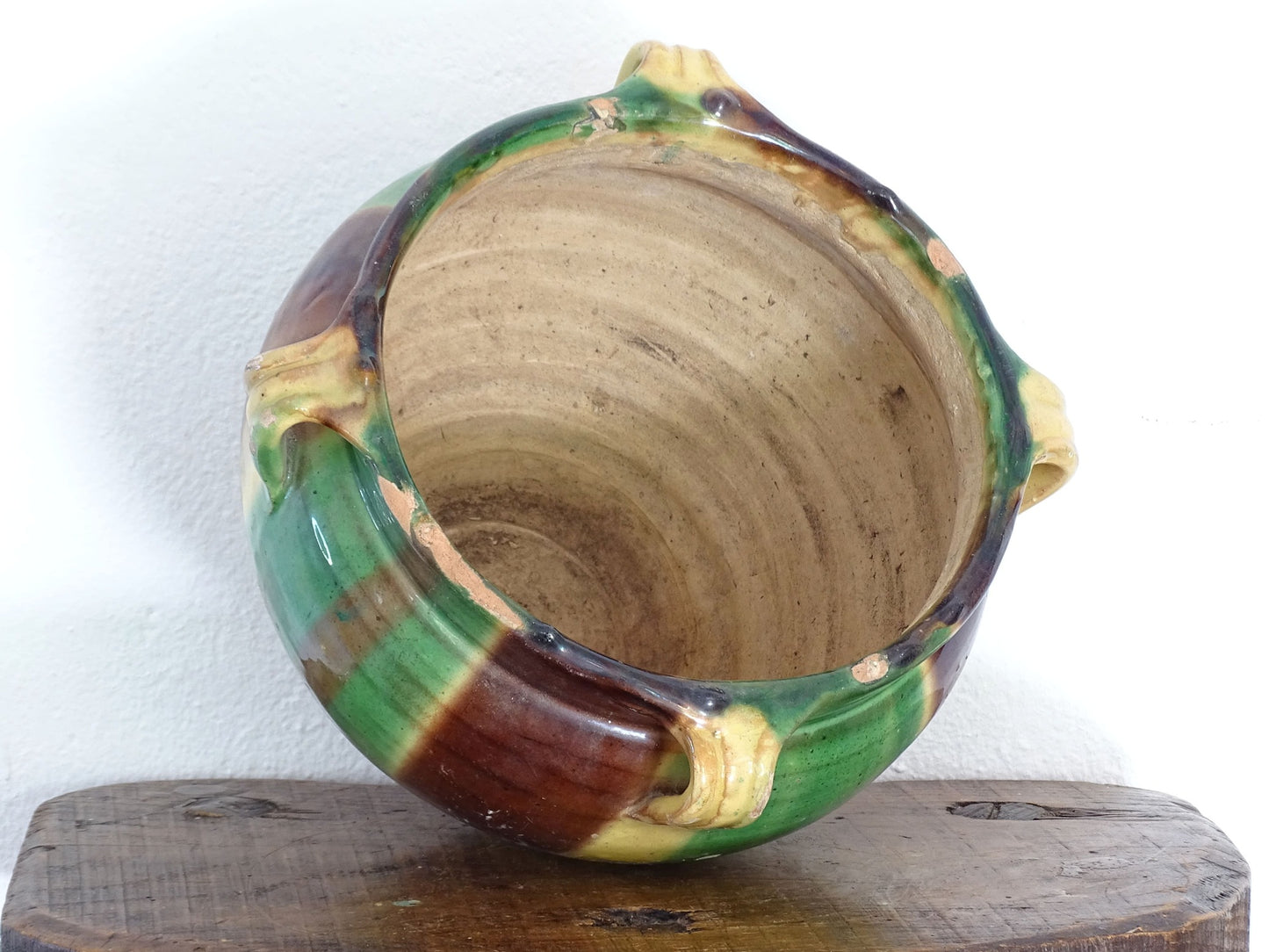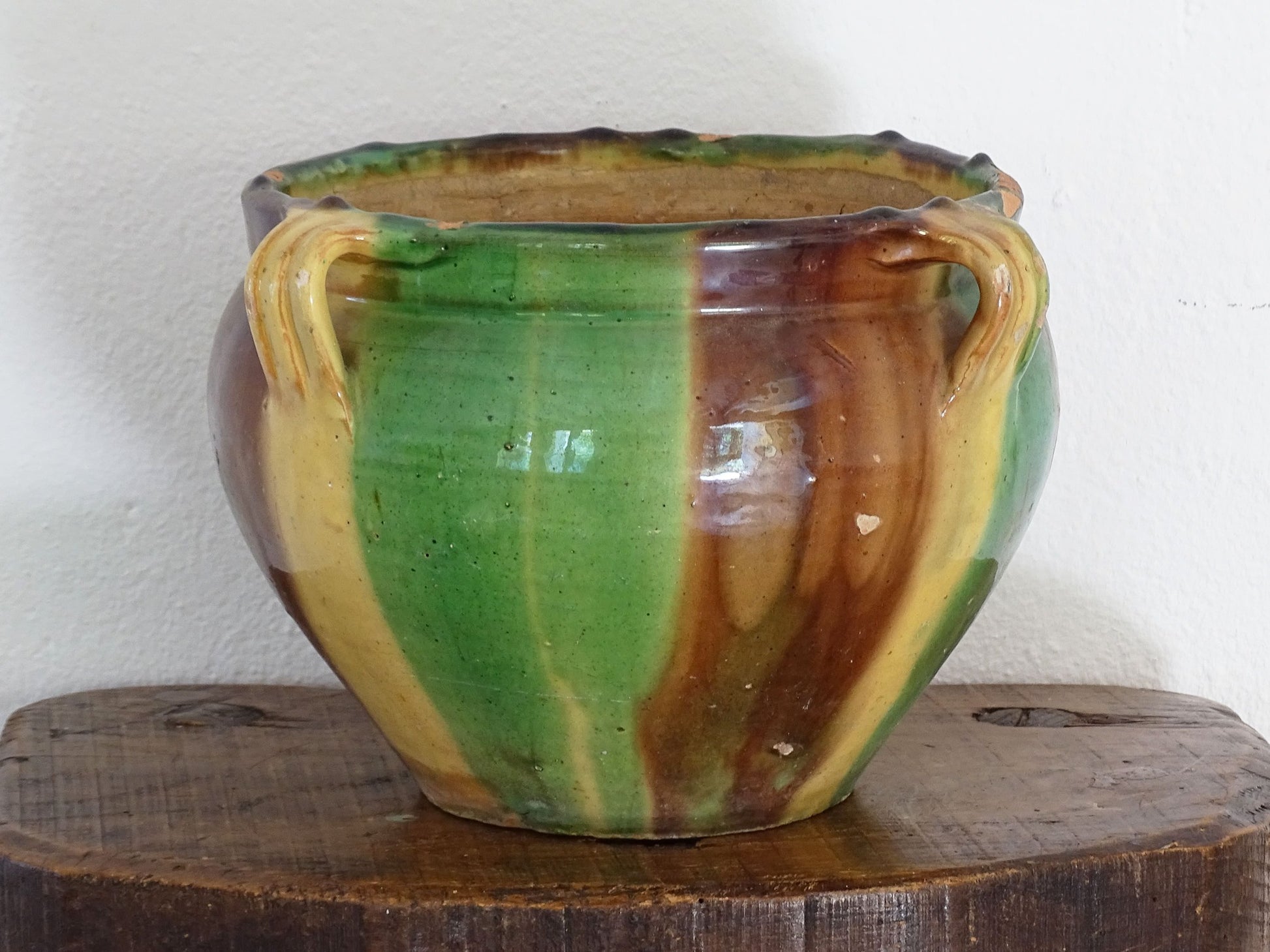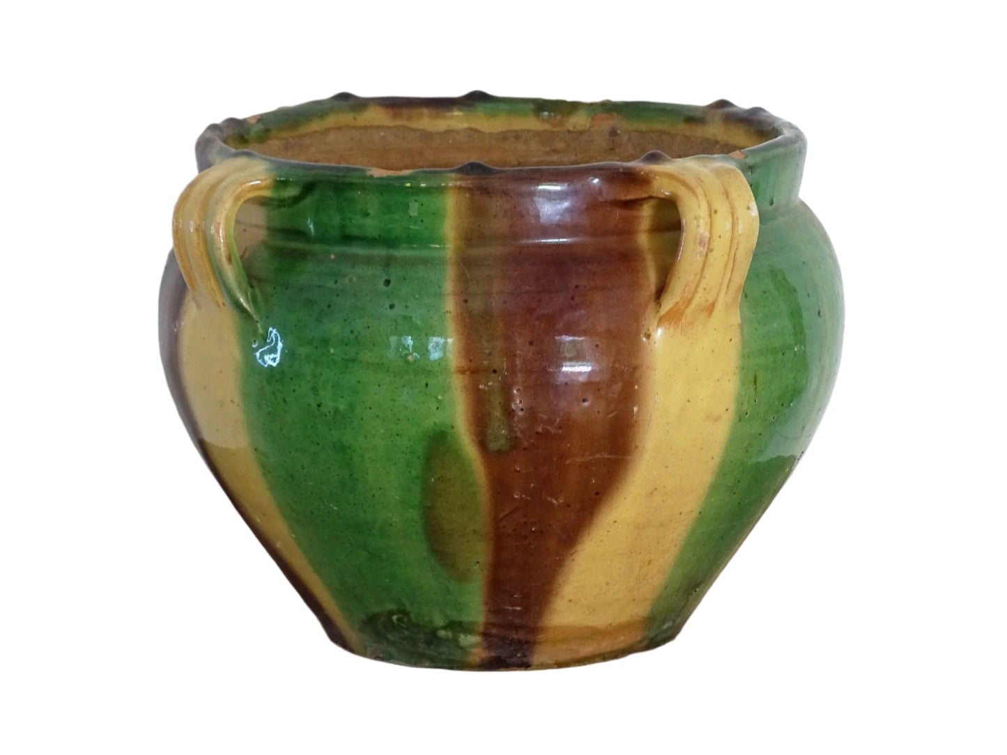 Antique French pottery planter with a striped drip glaze in yellow, brown and green. This beautiful French terracotta pot originates from the town of Castelnaudary in the Languedoc region of South West France. Dating to the 19th century, this glazed earthenware pot exudes the charm of the South of France and would make a gorgeous decorative accent.
