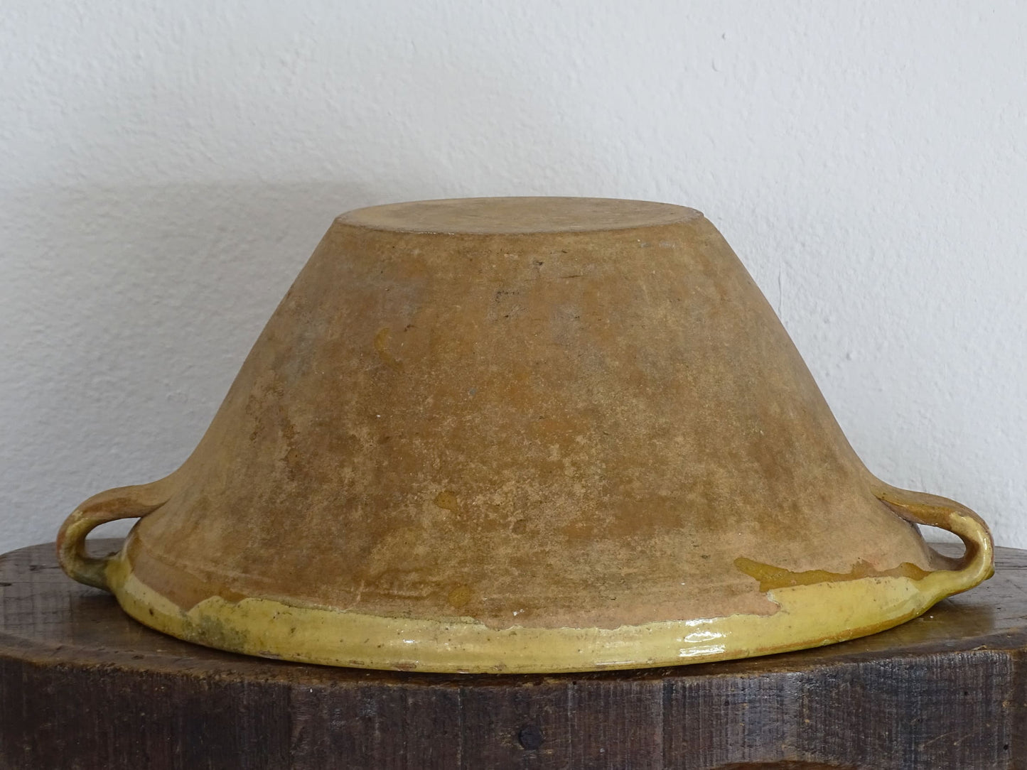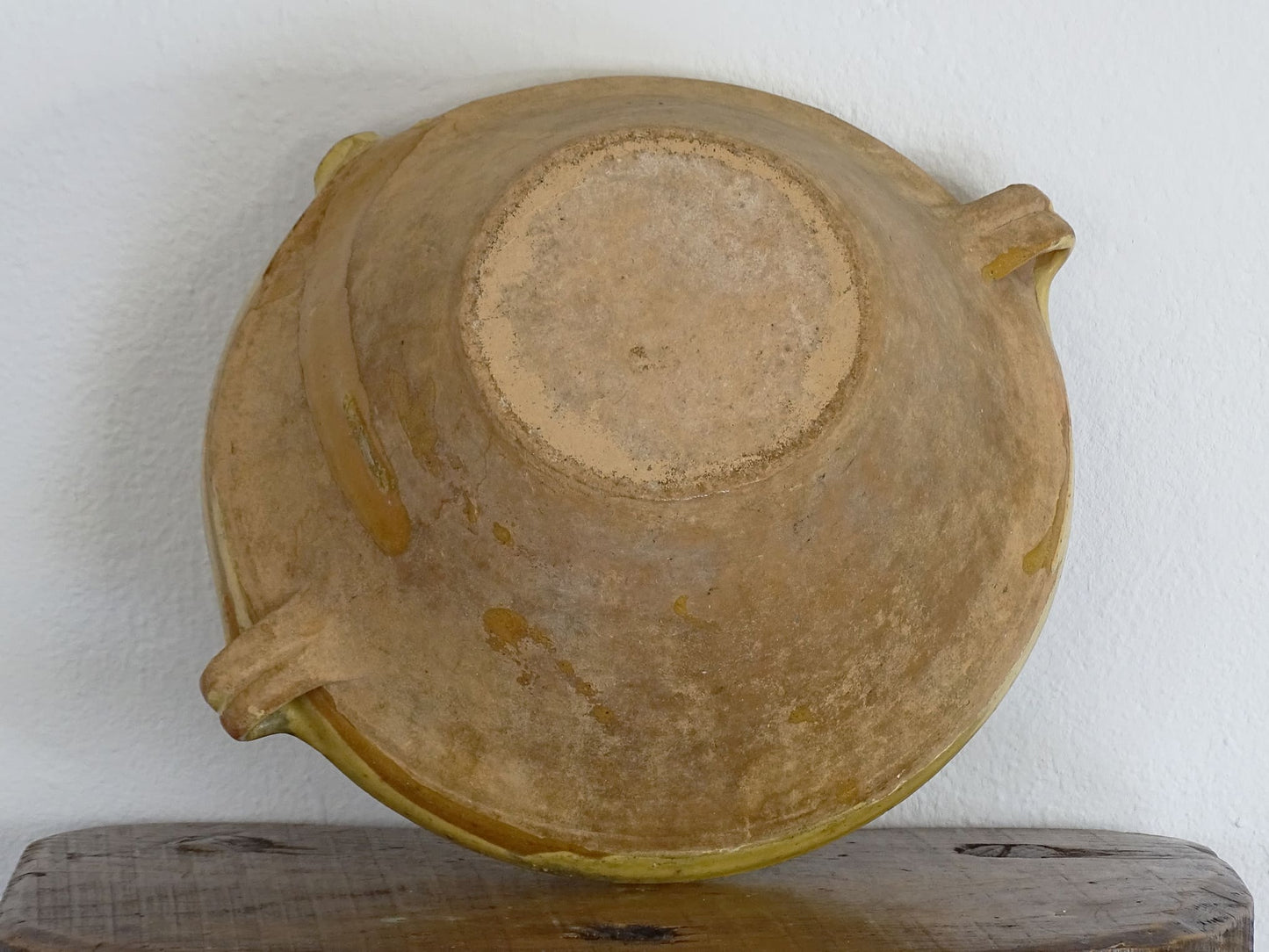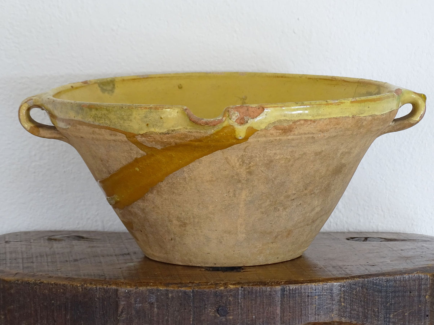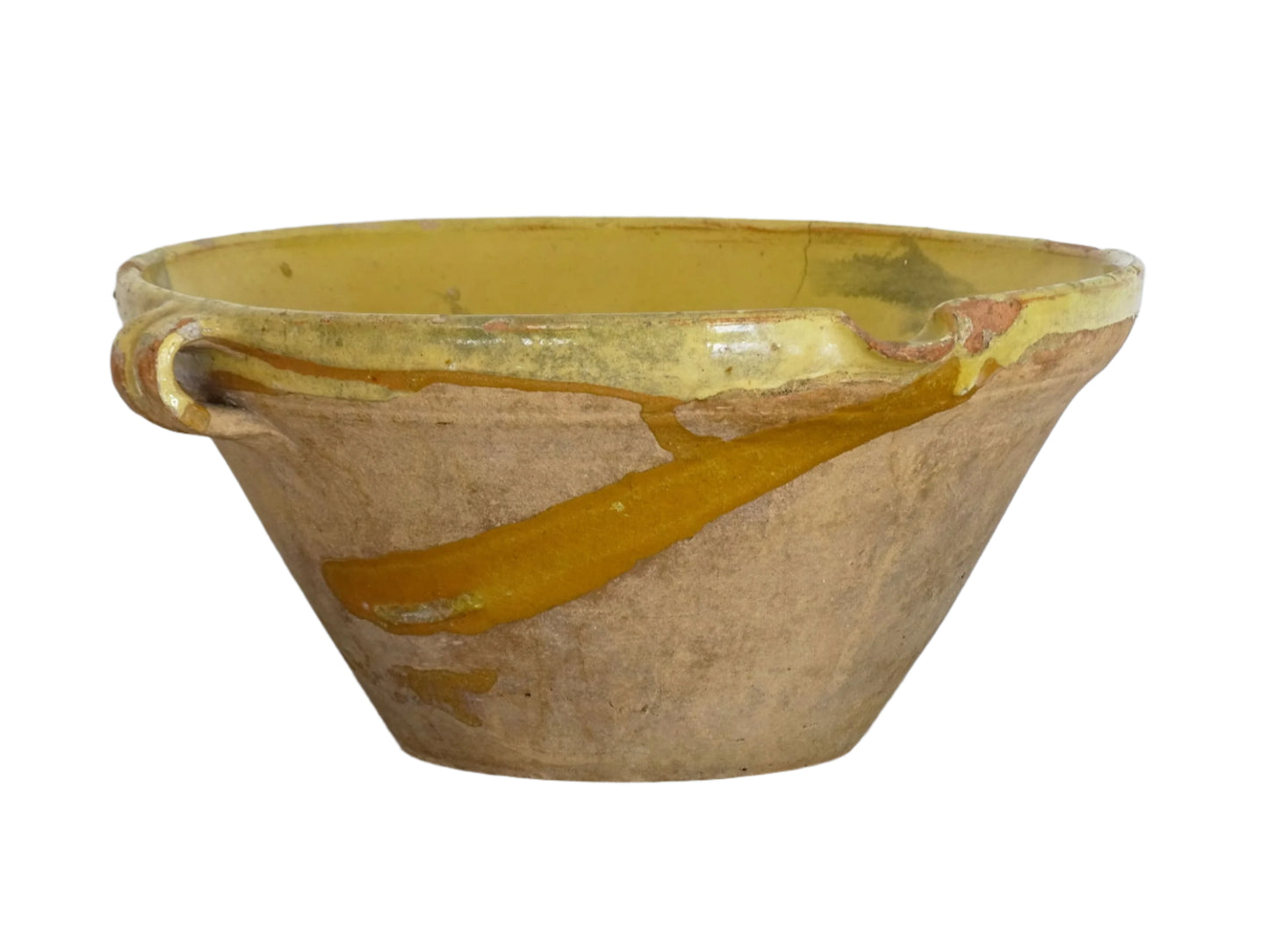 Antique French tian bowl with a yellow glaze to the inside. This terracotta bowl, also known as a confit bowl, has a beautiful patina and originates from the Narbonne area on the Mediterranean coast of South West France. This stunning piece, so typically French, would have been used to prepare confit. It would make a beautiful French farmhouse style decor.