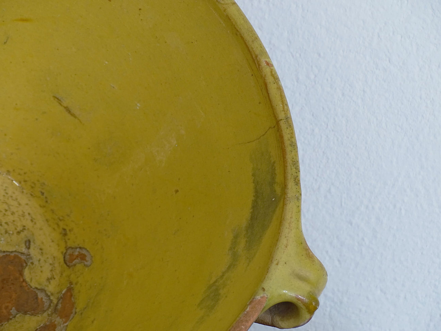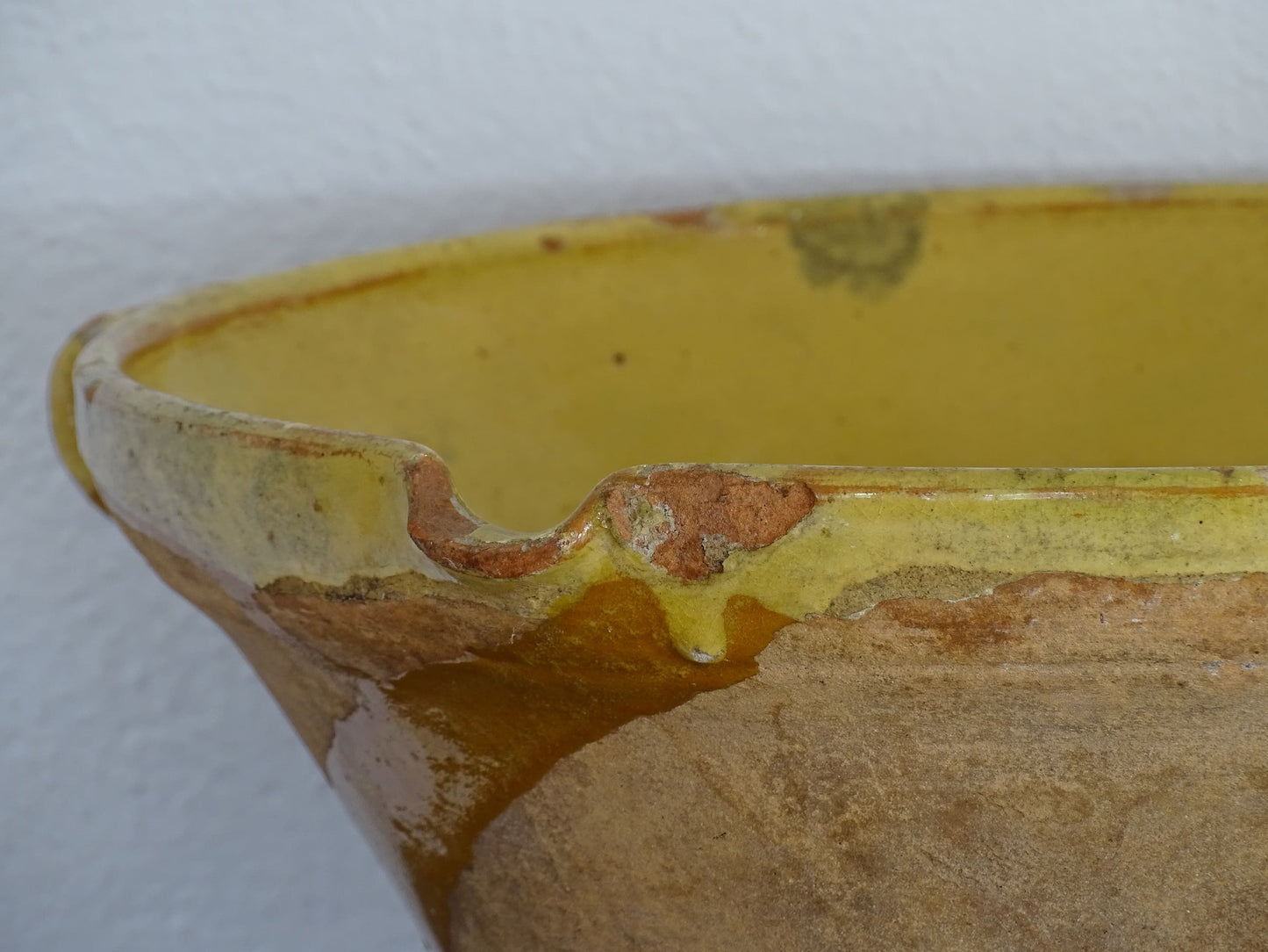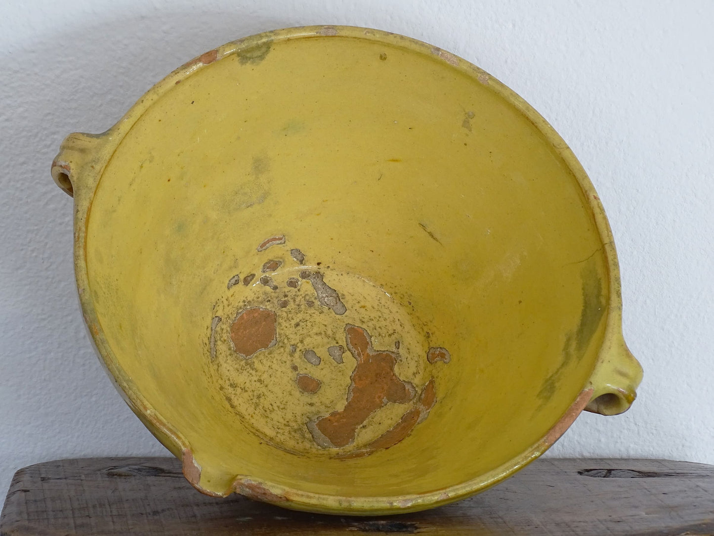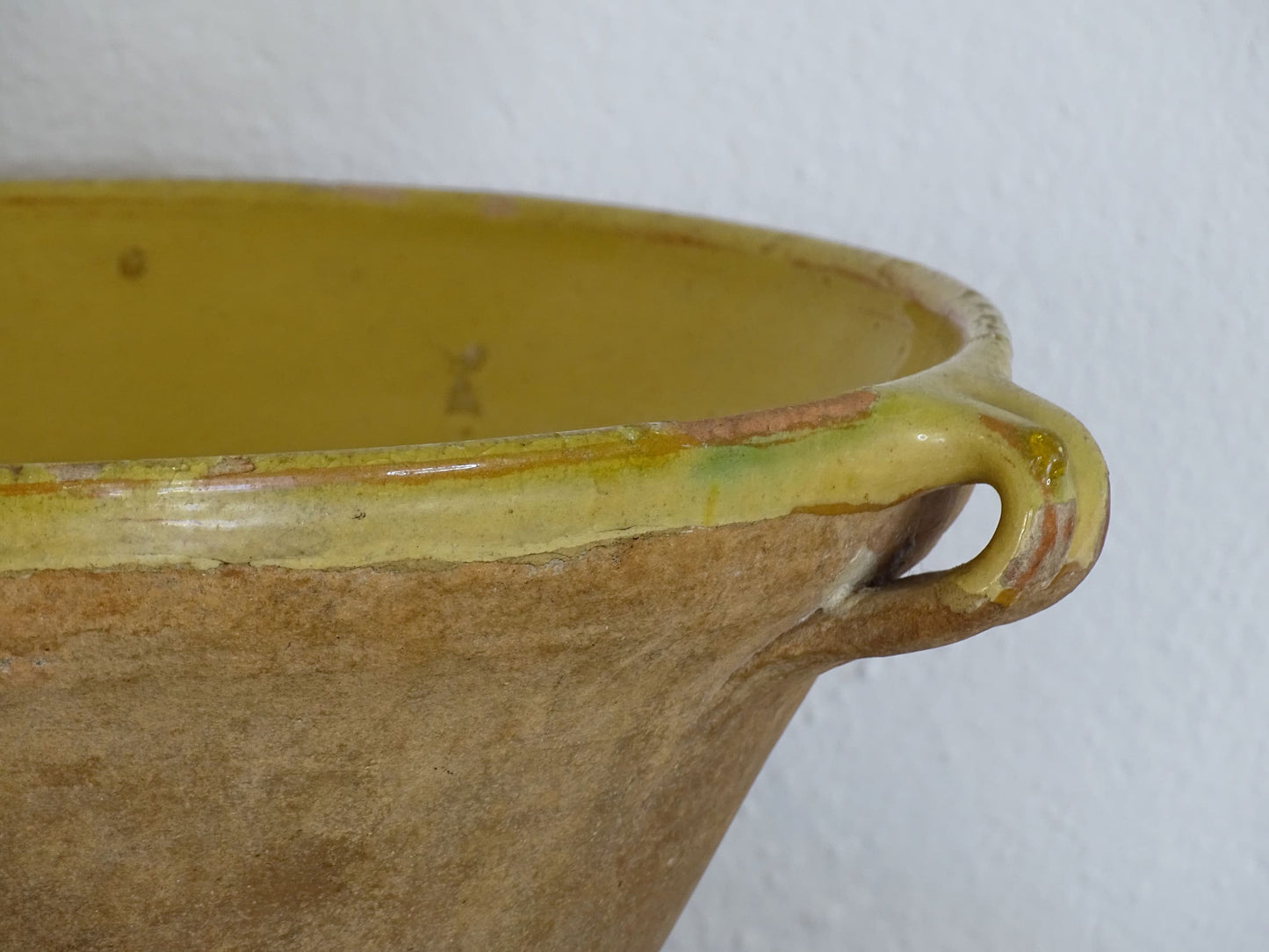 Antique French tian bowl with a yellow glaze to the inside. This terracotta bowl, also known as a confit bowl, has a beautiful patina and originates from the Narbonne area on the Mediterranean coast of South West France. This stunning piece, so typically French, would have been used to prepare confit. It would make a beautiful French farmhouse style decor.