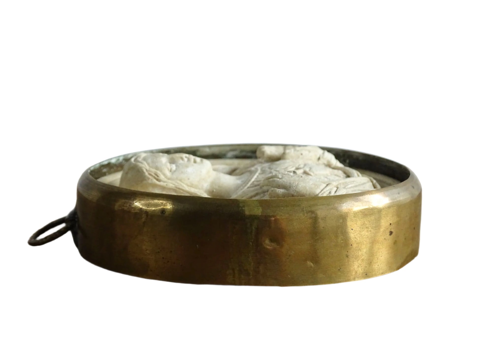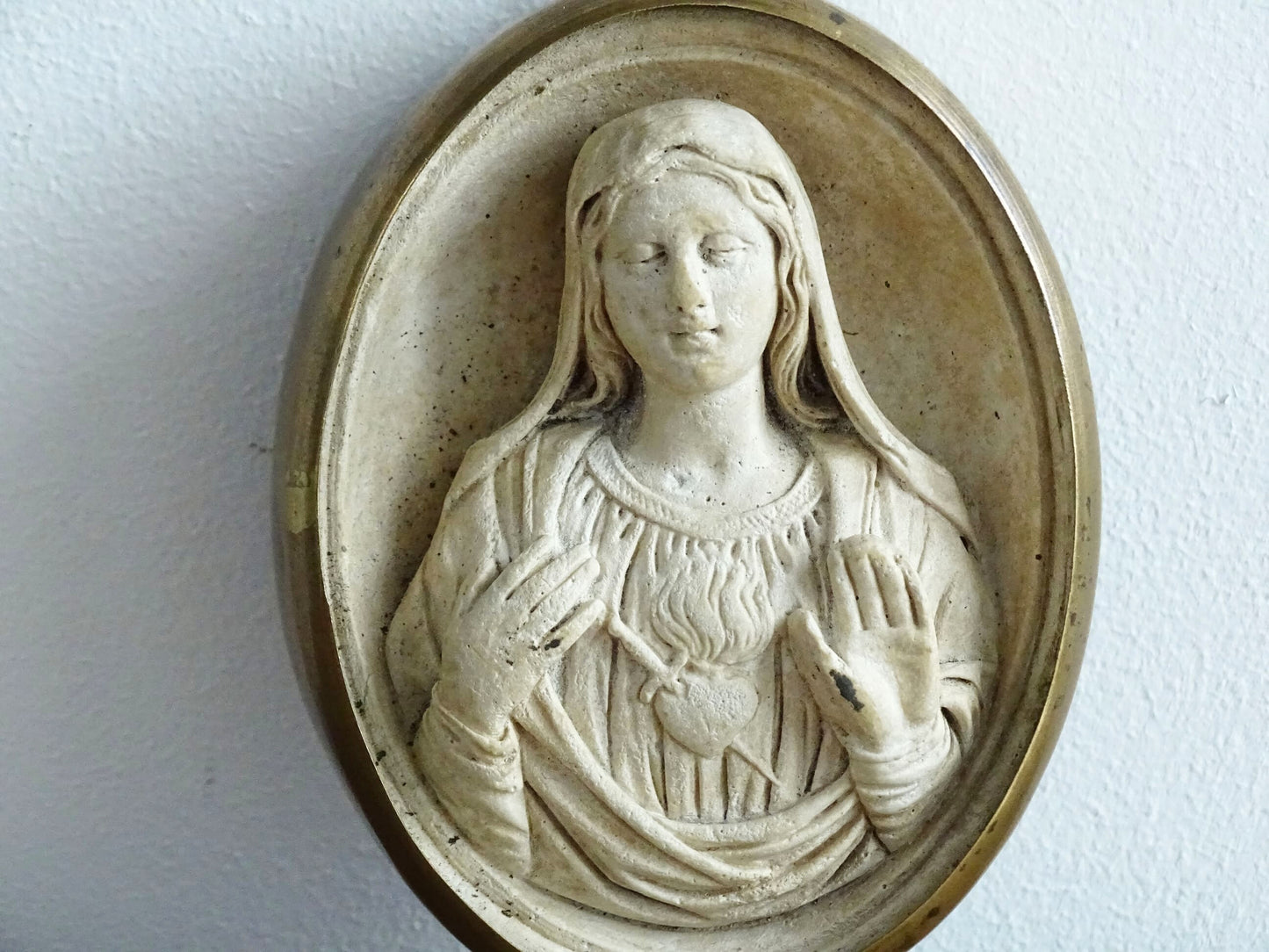 Beautiful depiction of the Virgin Mary in plaster relief, encased in a brass frame. It dates from the mid-19th century and has a small hook to hang on the wall.