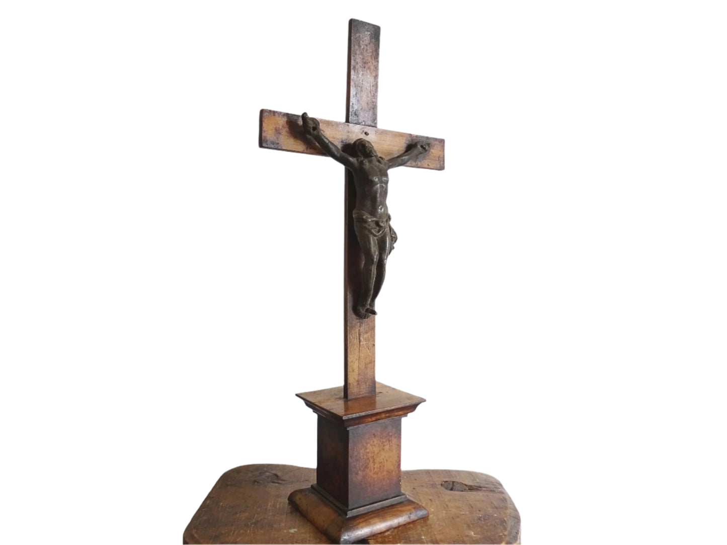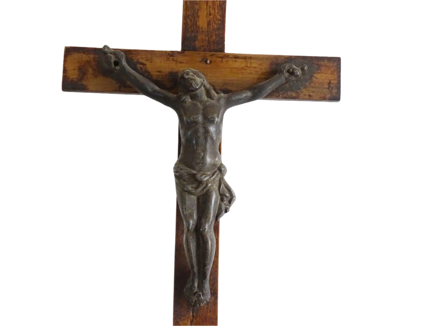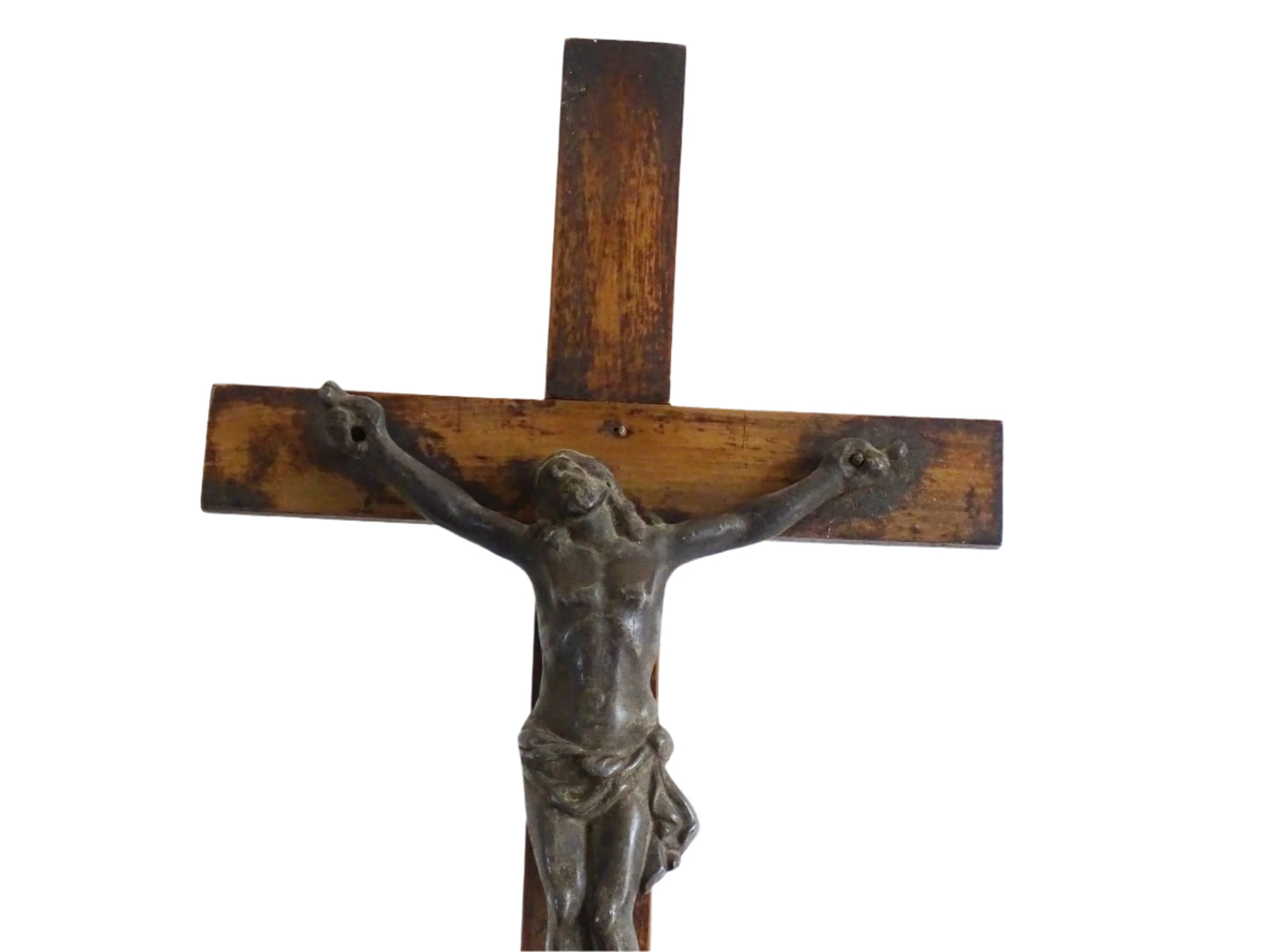 This wooden cross can be placed on a mantel, console, or side table as a focal point. It works well as part of a curated display with antique books, candlesticks, or religious artifacts. Its height makes it suitable for layering with framed artwork or mirrors in the background. Whether set on its own or incorporated into a collection, this religious antique adds depth and character.