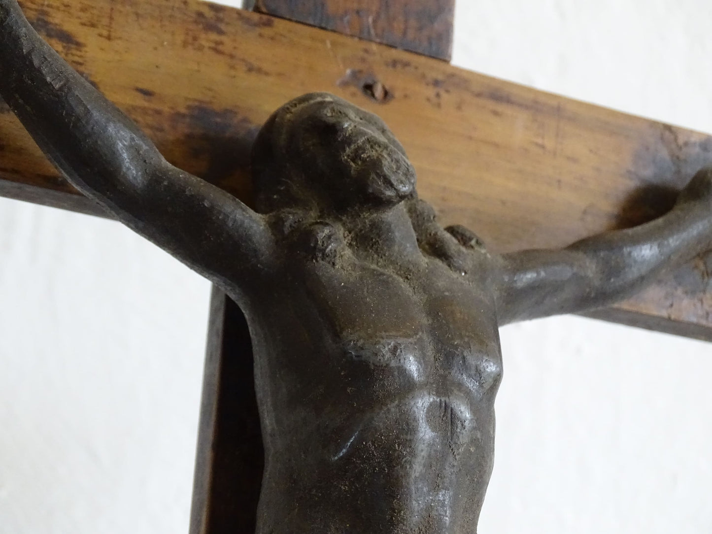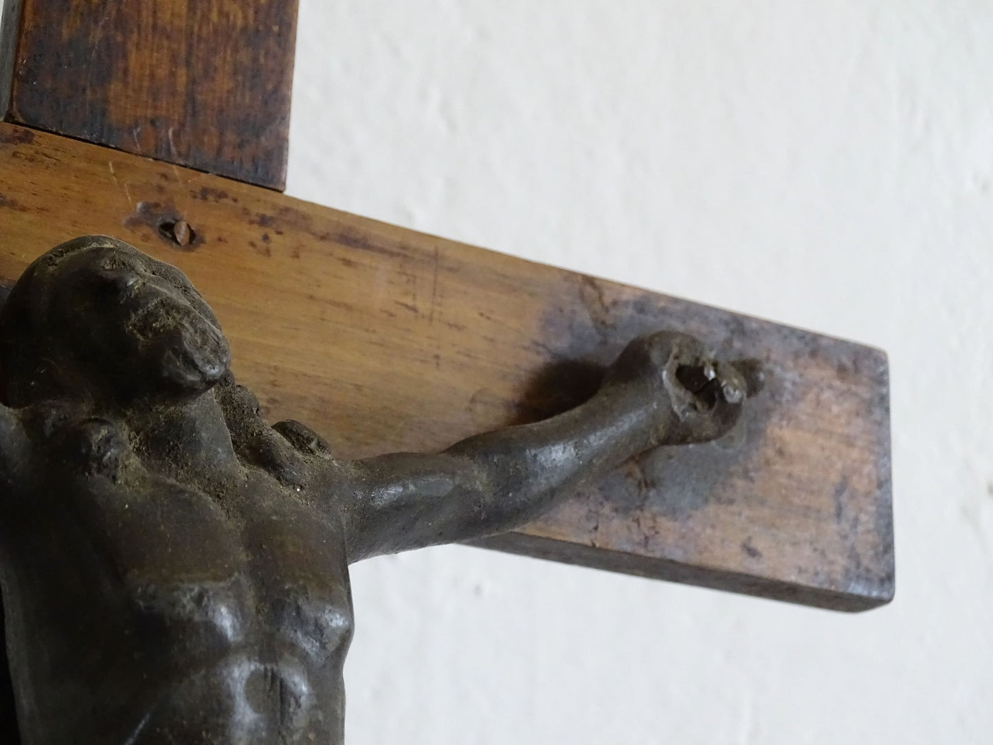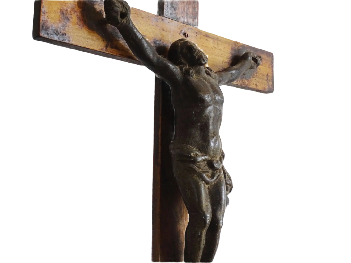 This wooden cross can be placed on a mantel, console, or side table as a focal point. It works well as part of a curated display with antique books, candlesticks, or religious artifacts. Its height makes it suitable for layering with framed artwork or mirrors in the background. Whether set on its own or incorporated into a collection, this religious antique adds depth and character.