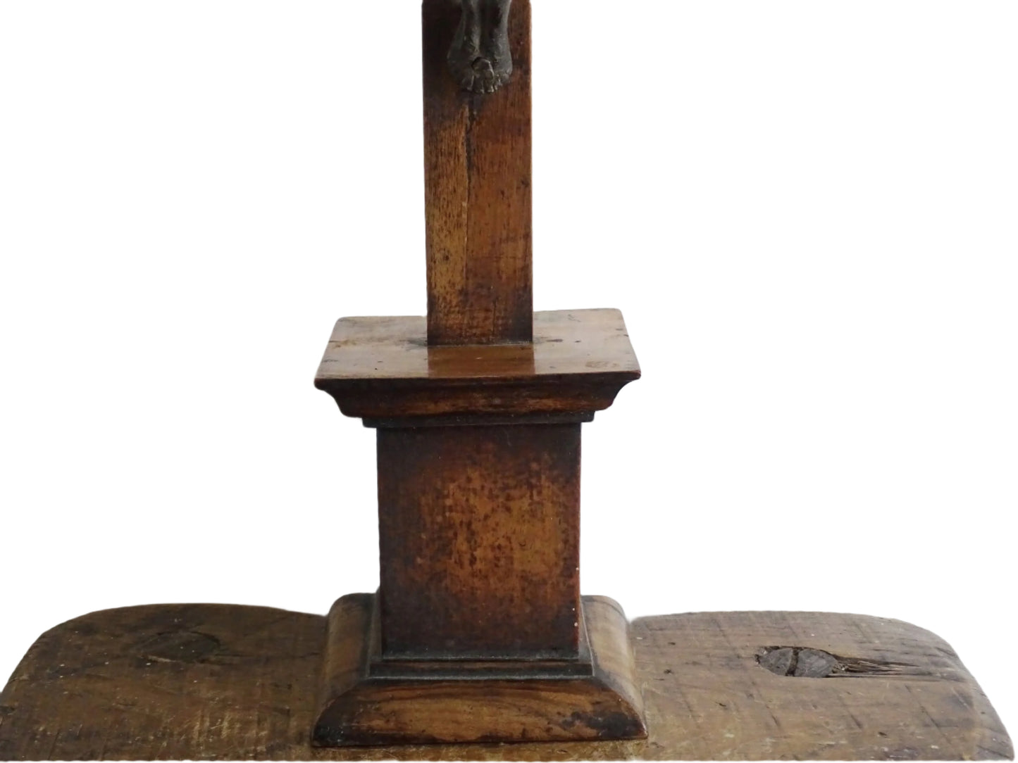 This French antique altar crucifix dates to the 19th century and features a wooden cross with a spelter figure of Christ. The wood has developed a rich patina over time, highlighting its age and history. The cross is mounted on a tiered wooden base, giving it a strong presence. The simple yet striking design makes it a meaningful religious antique that can be displayed in various ways.