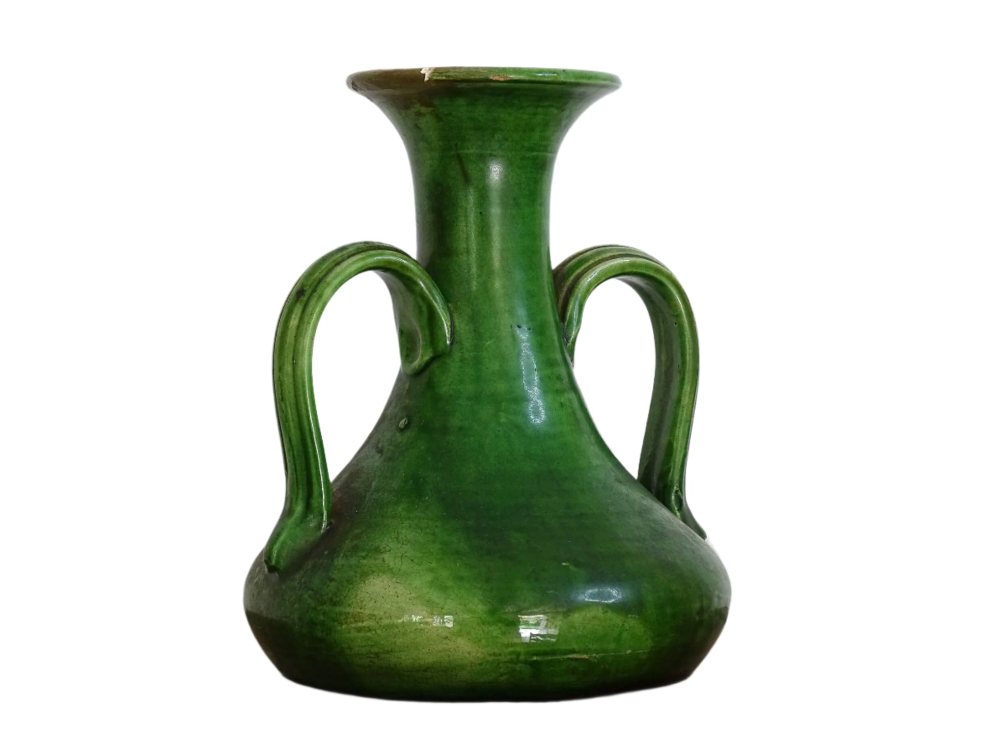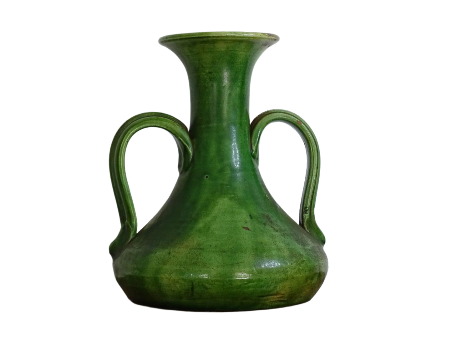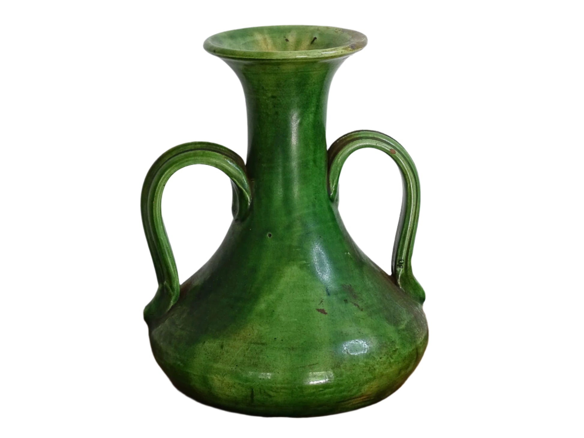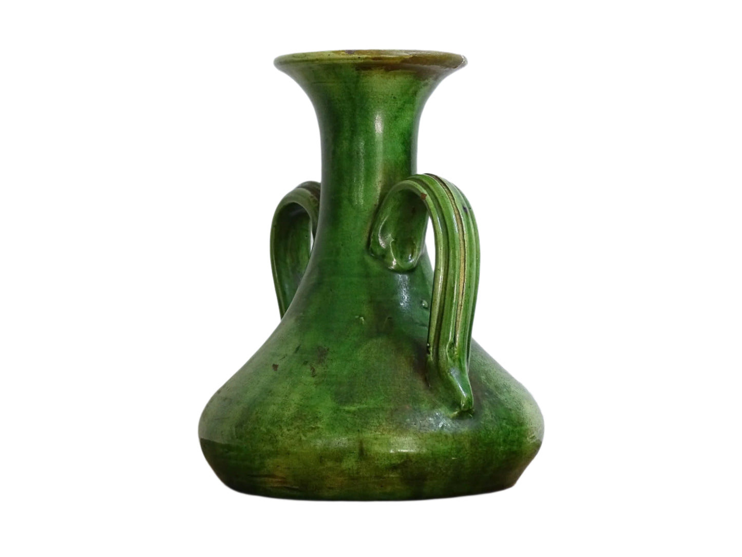 French antique art nouveau pottery vase with a green glaze in a beautiful deep tone with splashes of soft yellow. Wonderfully organic in shape and a little larger than a bud vase, so it could hold a few flower stems. This twin handled antique vase with it's elongated neck, comes from the South of France. It would make a gorgeous decorative accent.