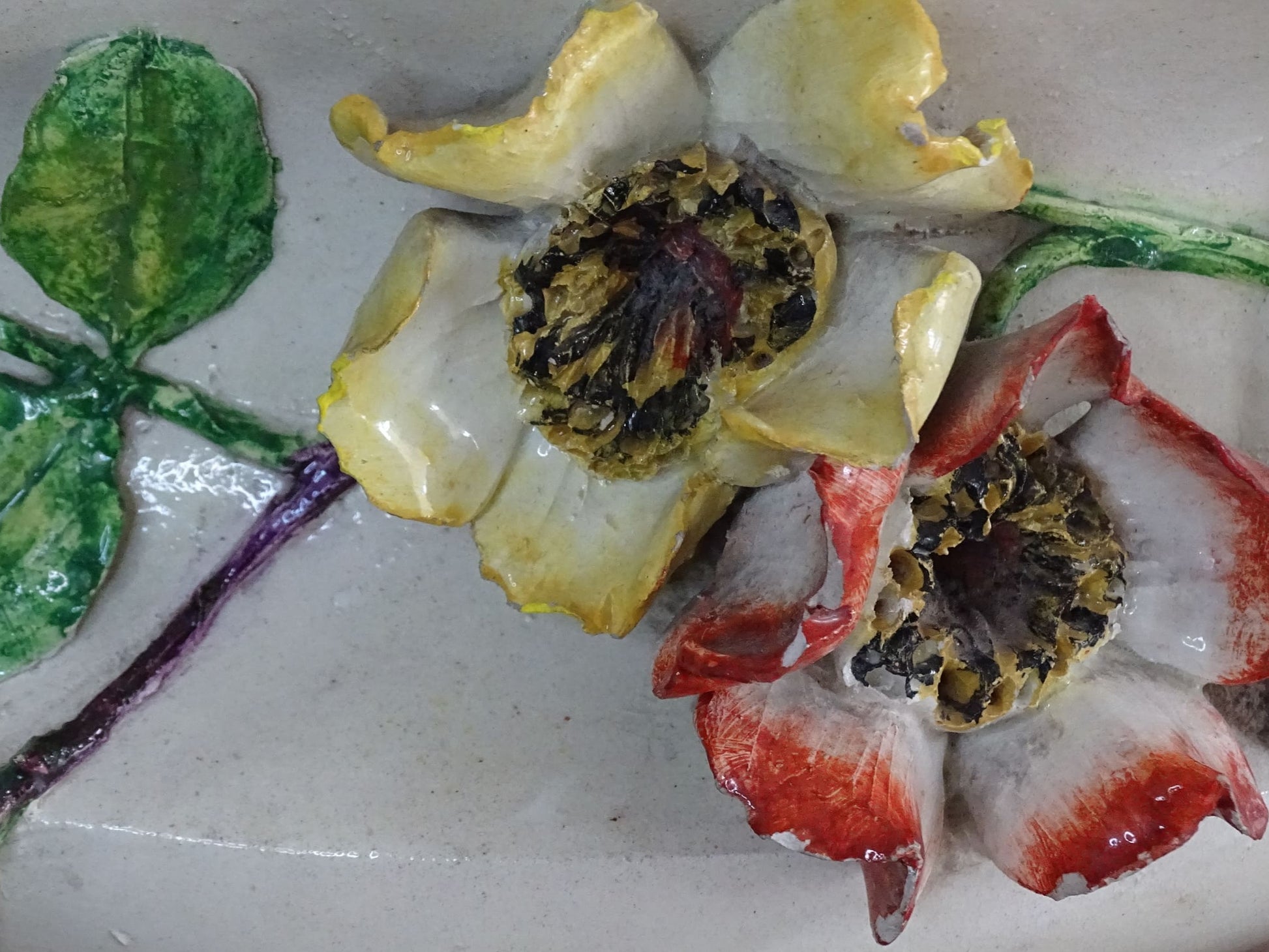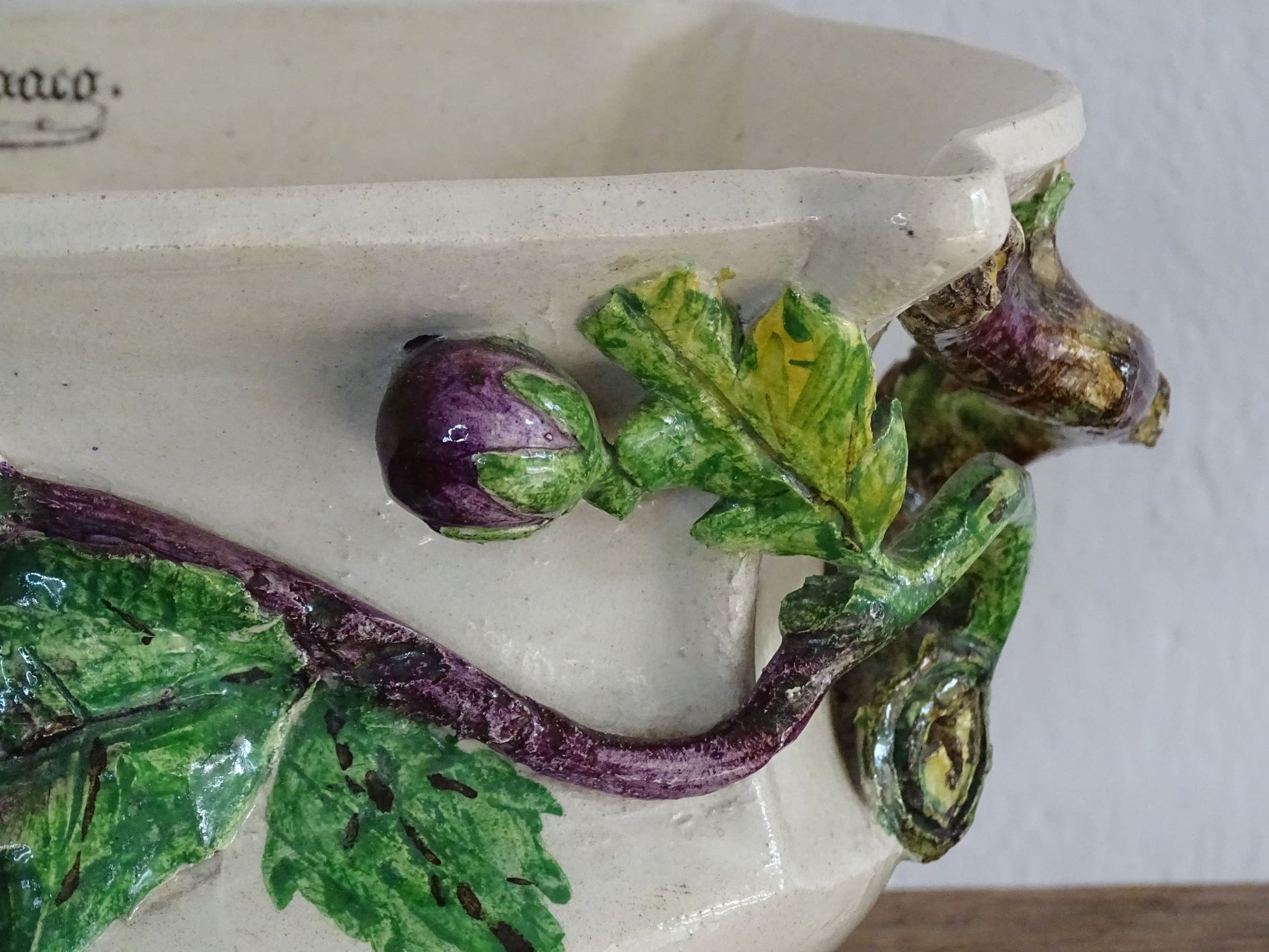 French antique barbotine ceramic planter from Monaco. One side is decorated with purple flower buds, the other with red and yellow flowers. This majolica pottery jardiniere is highly decorative and would look beautiful filled with a leafy plant and displayed on a console table, or perhaps as a table centrepiece.