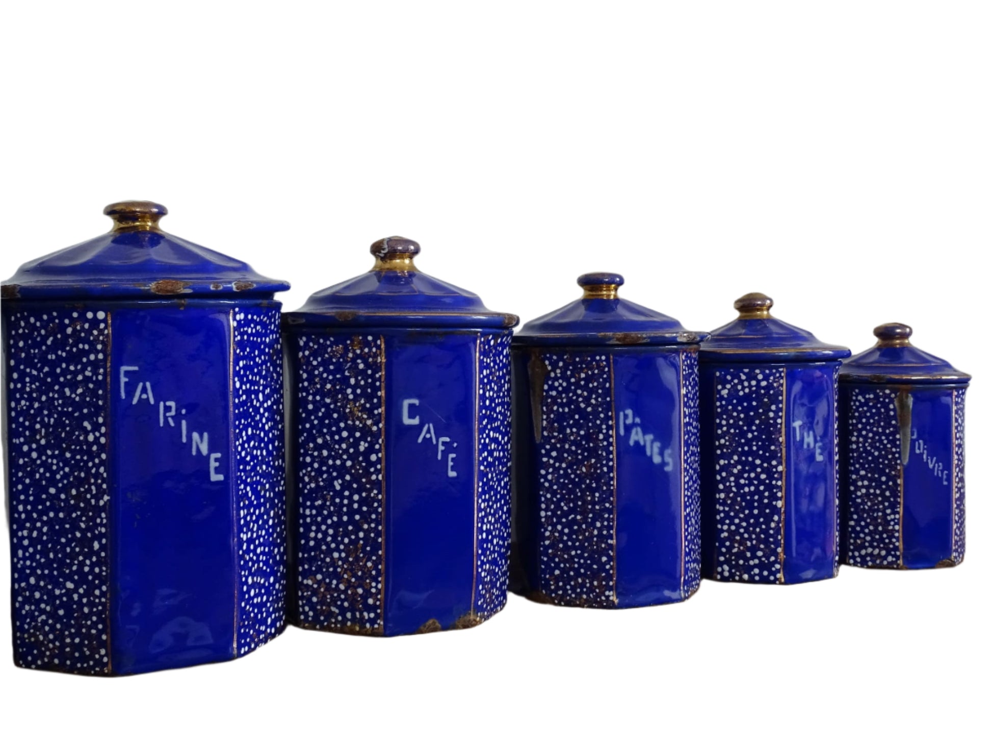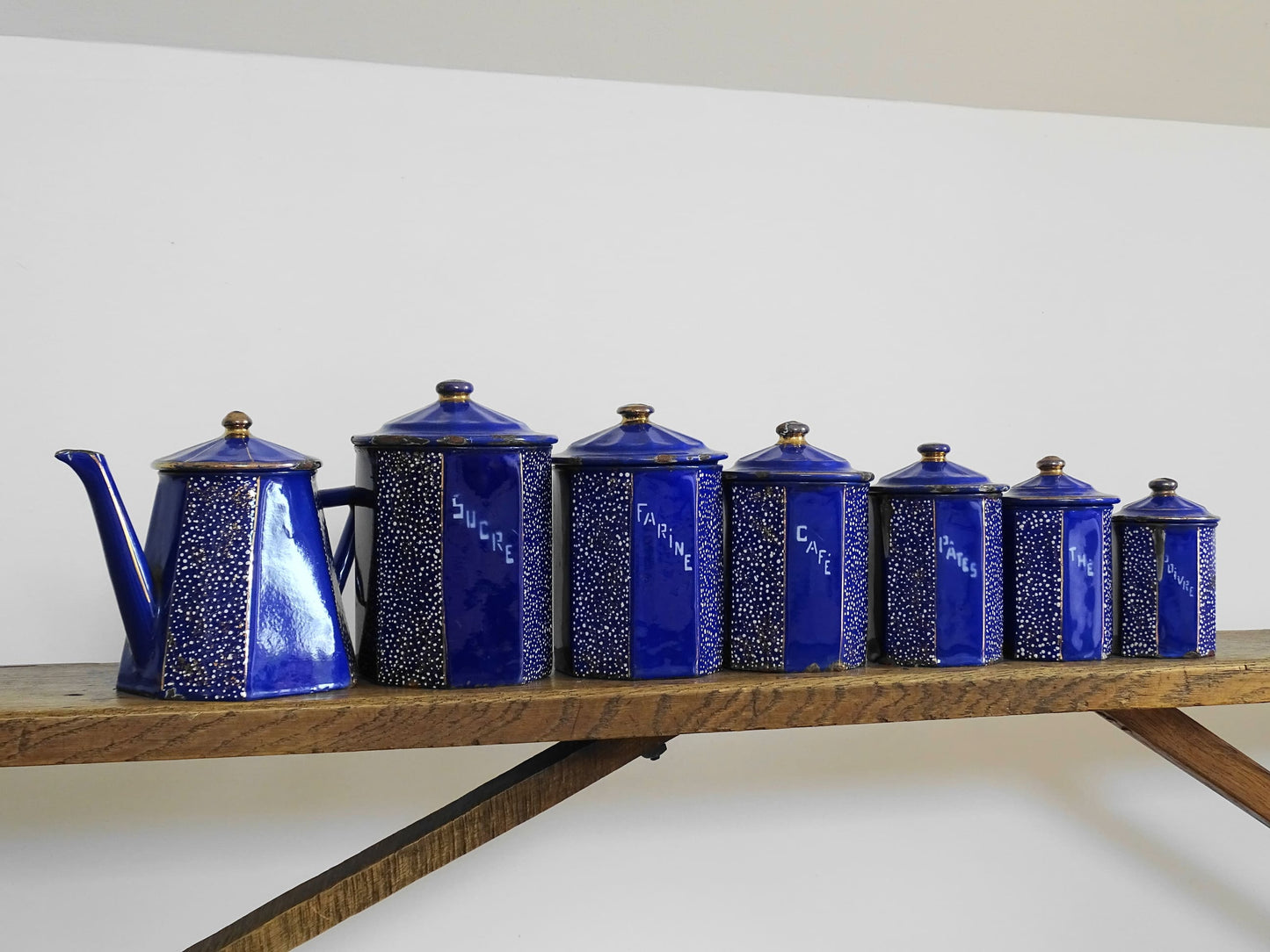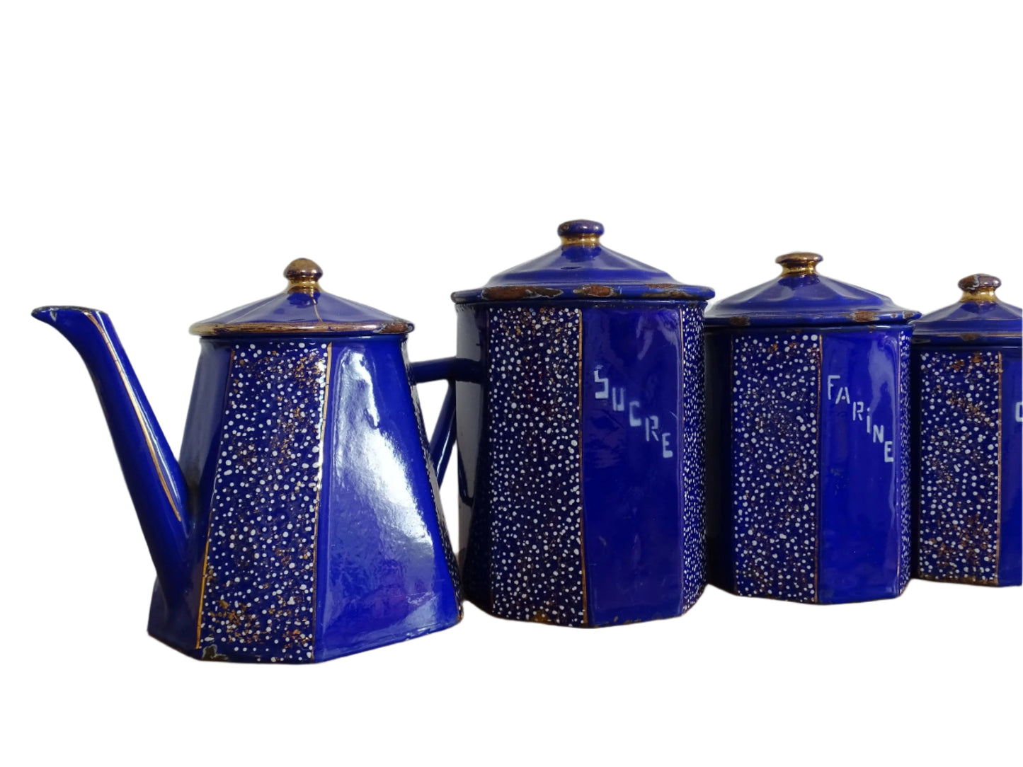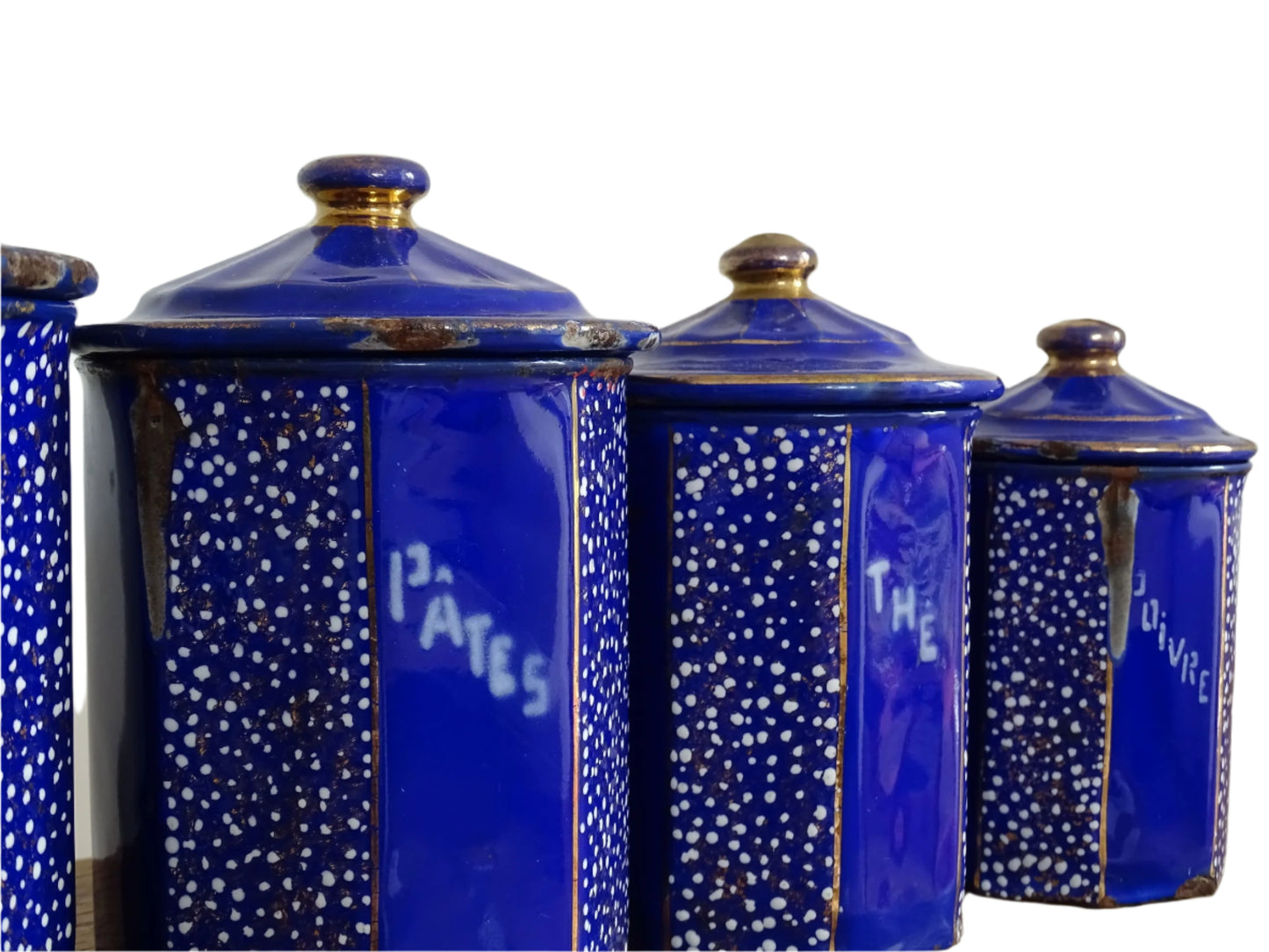 French antique blue enamelware canister set from the 1920s. The vibrant cobalt blue finish is adorned with delicate white speckles and detailed with gold accents along the edges. Each cannister features classic white lettering that labels its contents: sucre (sugar), farine (flour), café (coffee), pâtes (pasta), thé (tea), and poivre (pepper), along with a matching teapot to complete the set.