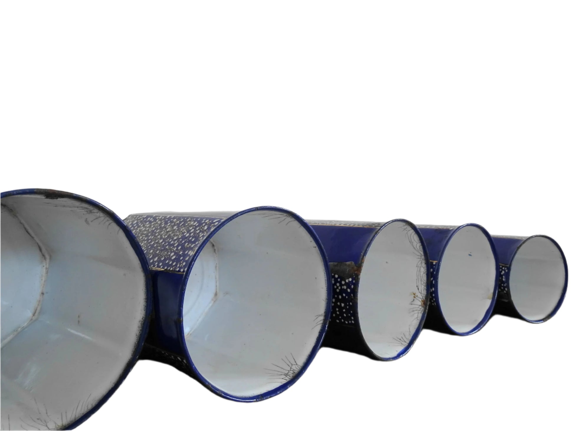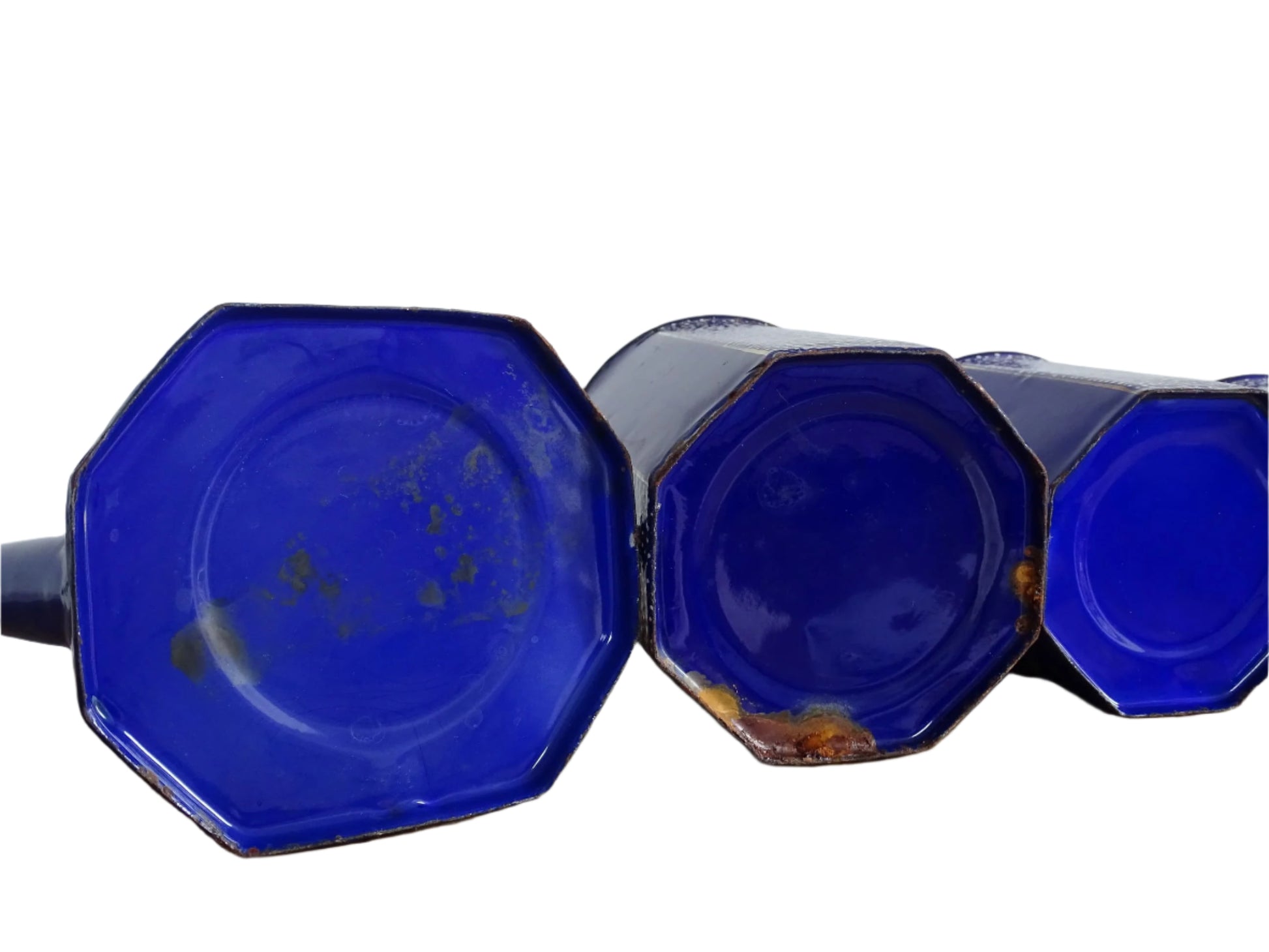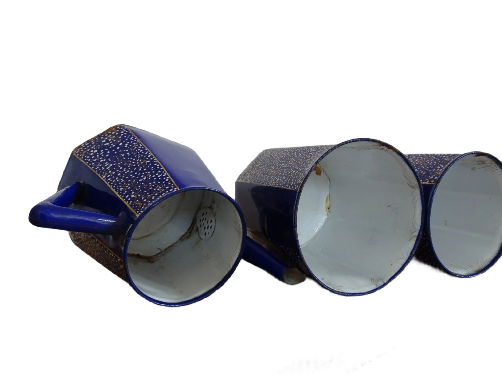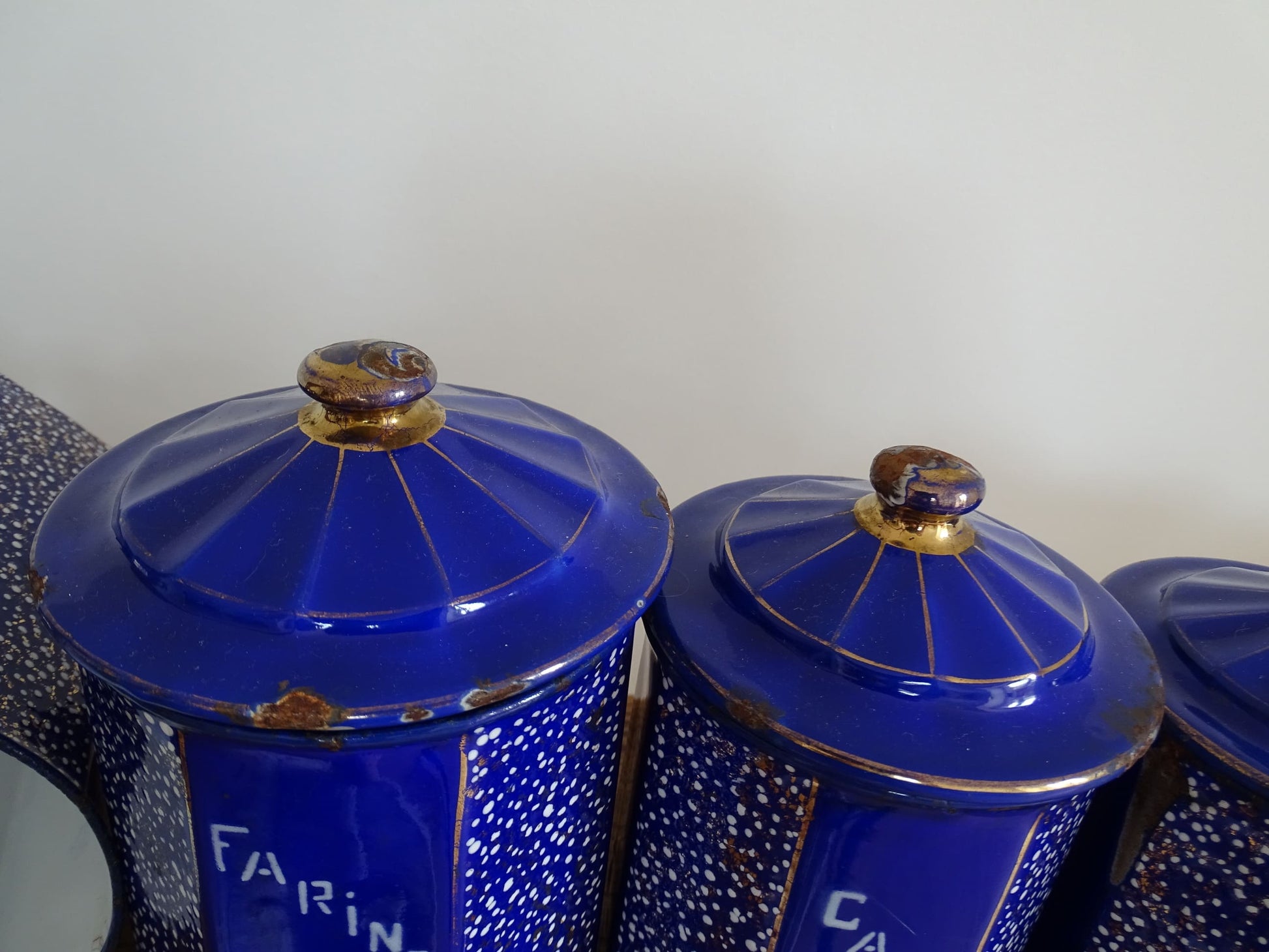 French antique blue enamelware canister set from the 1920s. The vibrant cobalt blue finish is adorned with delicate white speckles and detailed with gold accents along the edges. Each cannister features classic white lettering that labels its contents: sucre (sugar), farine (flour), café (coffee), pâtes (pasta), thé (tea), and poivre (pepper), along with a matching teapot to complete the set.