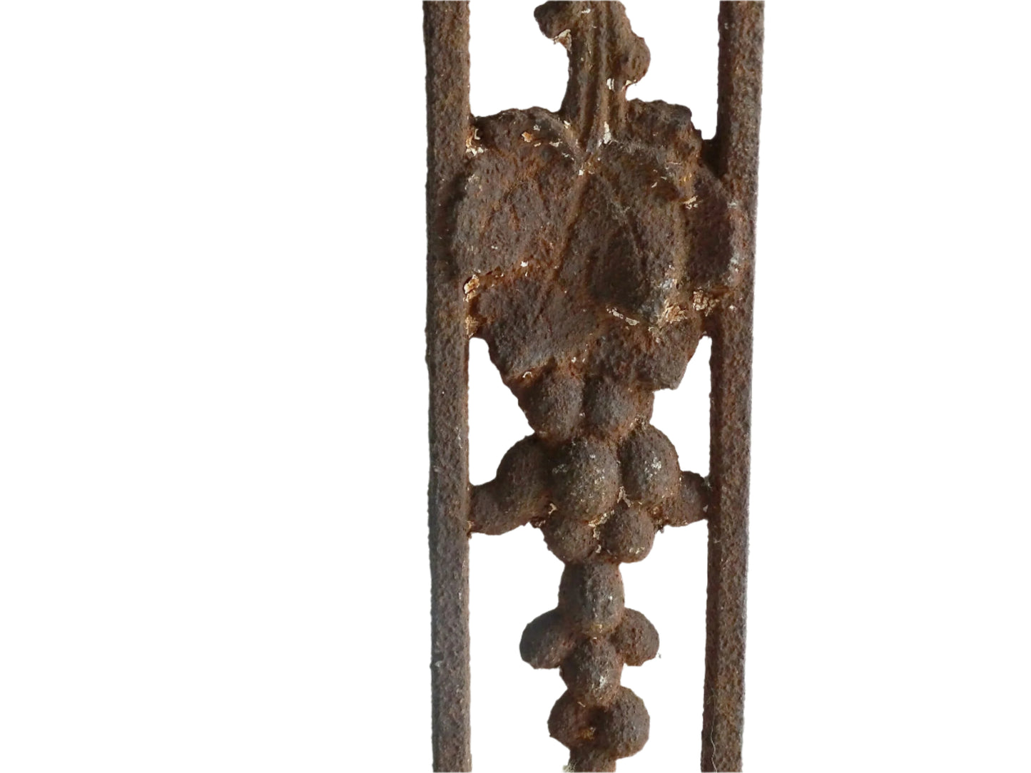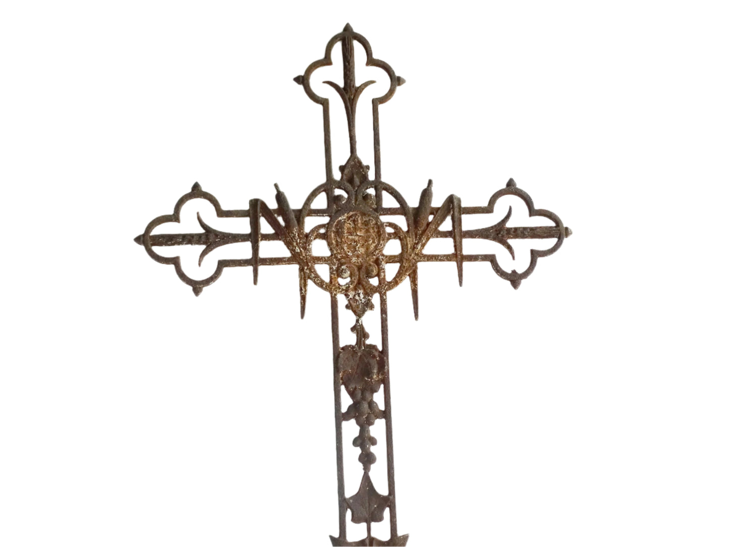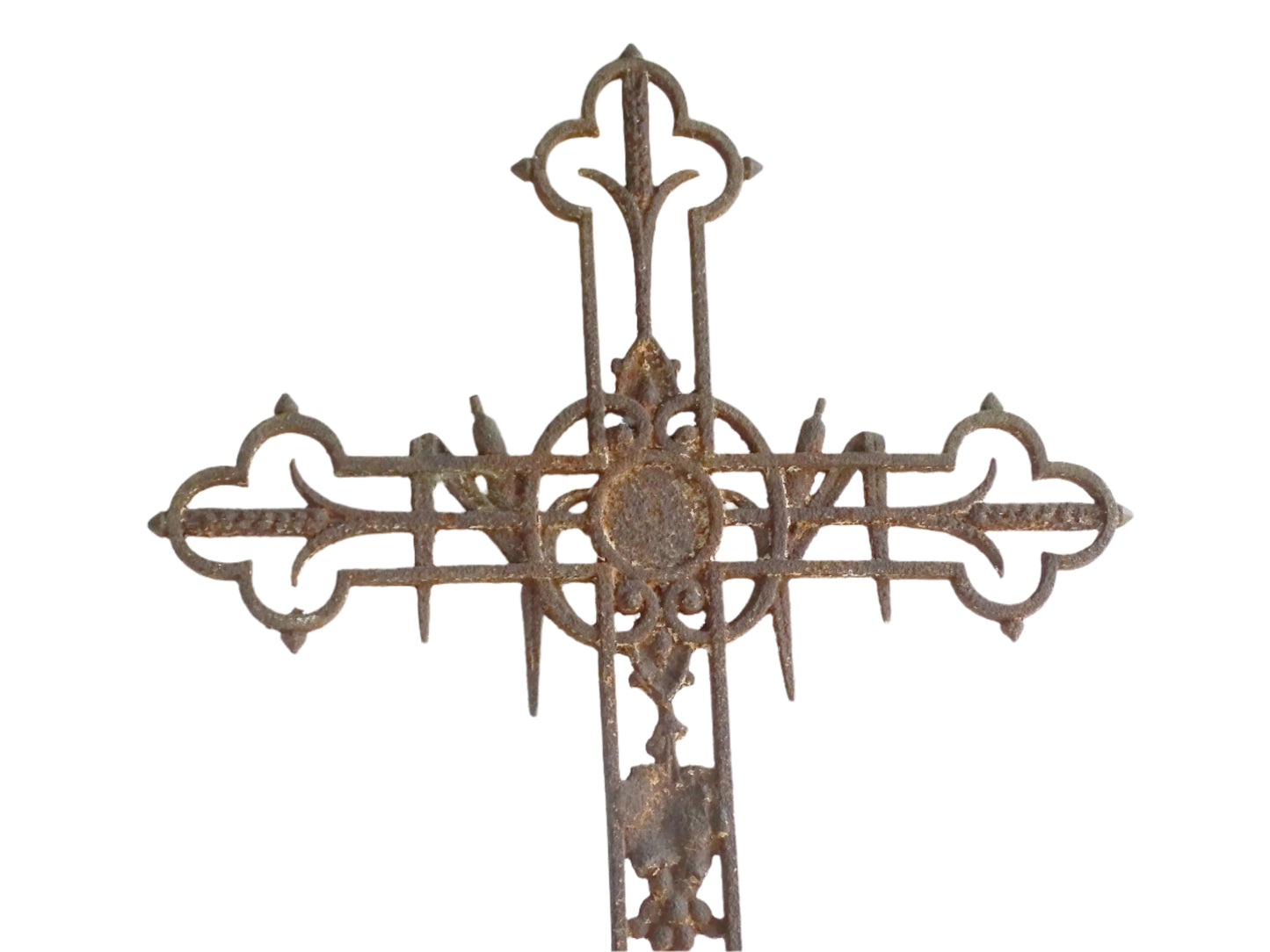 This French antique cast iron field cross, also known as a pilgrim cross, is beautifully aged. Often used to mark the way for travellers or pilgrims, they were also placed on the edges of fields or vineyards. We think this one could have been used next to a vineyard as it is decorated with grapes and vines.
