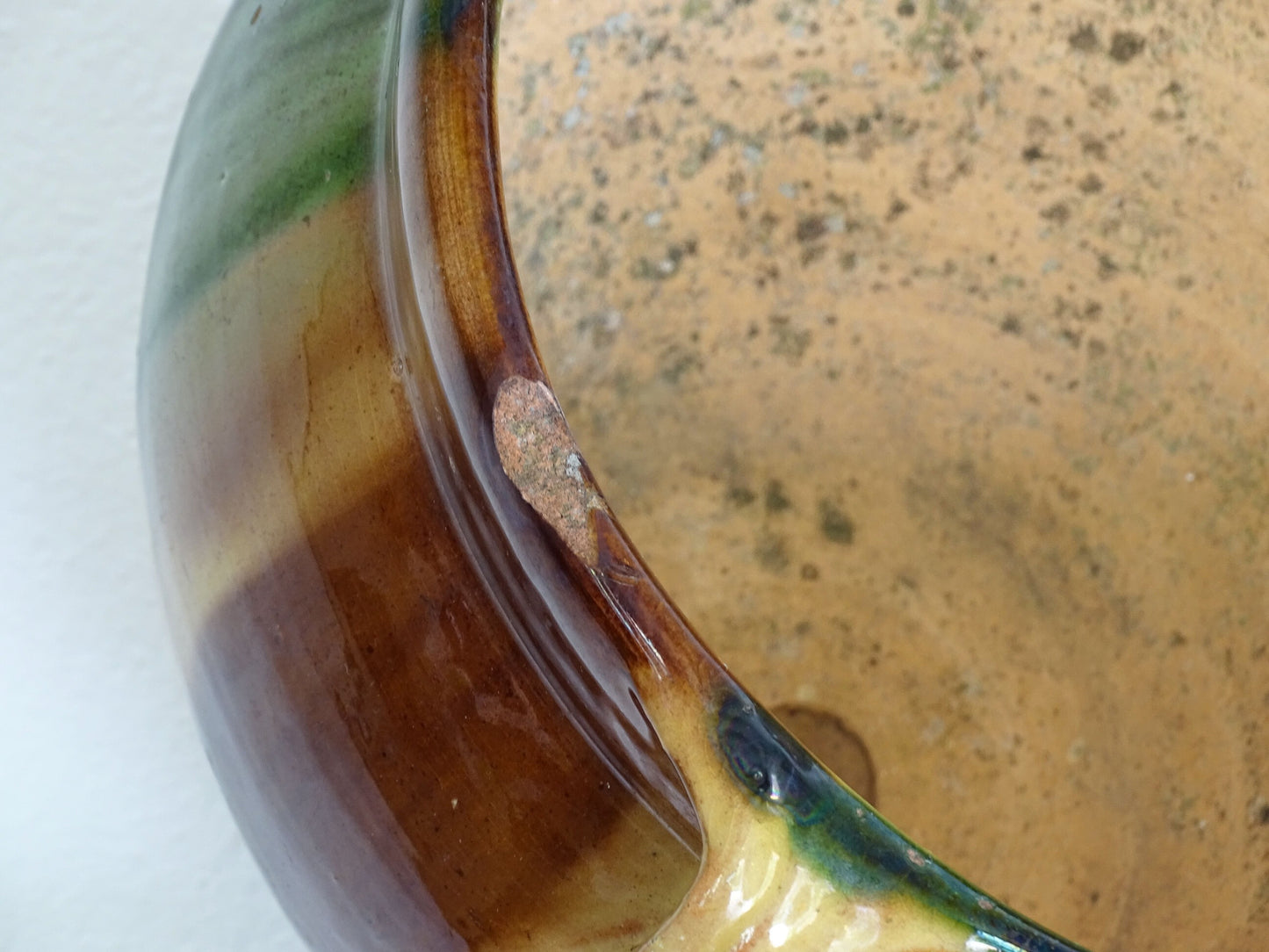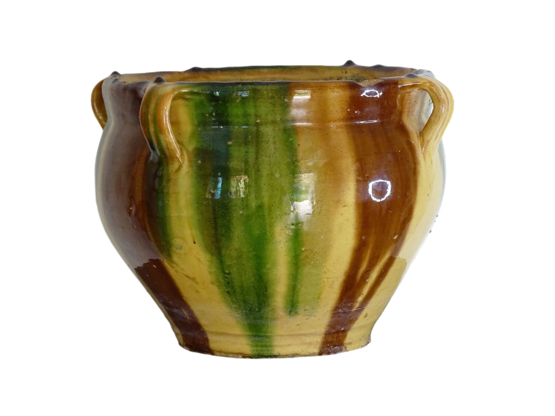 French antique ceramic planter from Castelnaudary. The pot has a stripe drip glaze in yellow, green and brown. This antique cache pot in terracotta, so typical of the pottery in the South of France, would make a wonderful decorative accent.