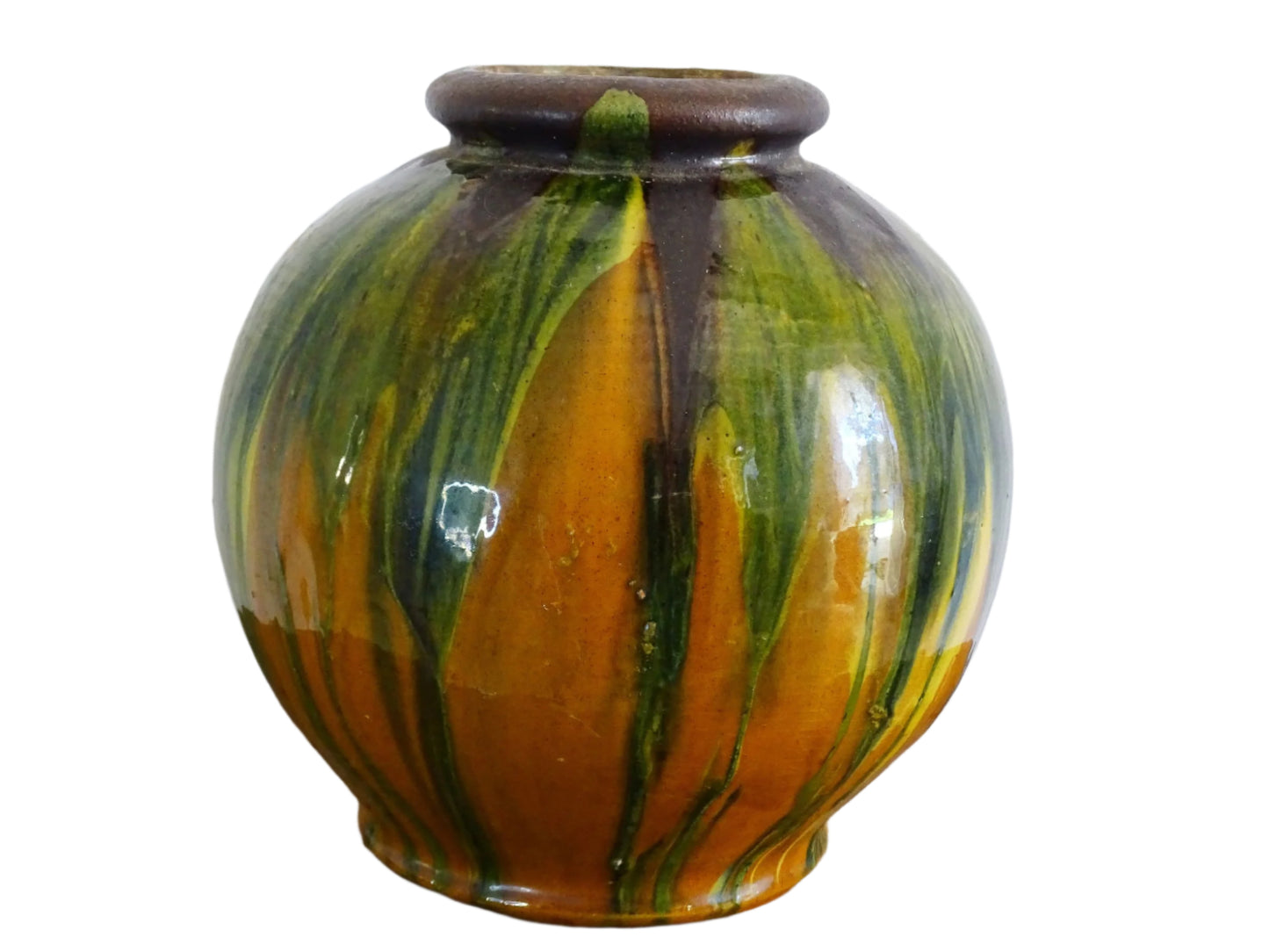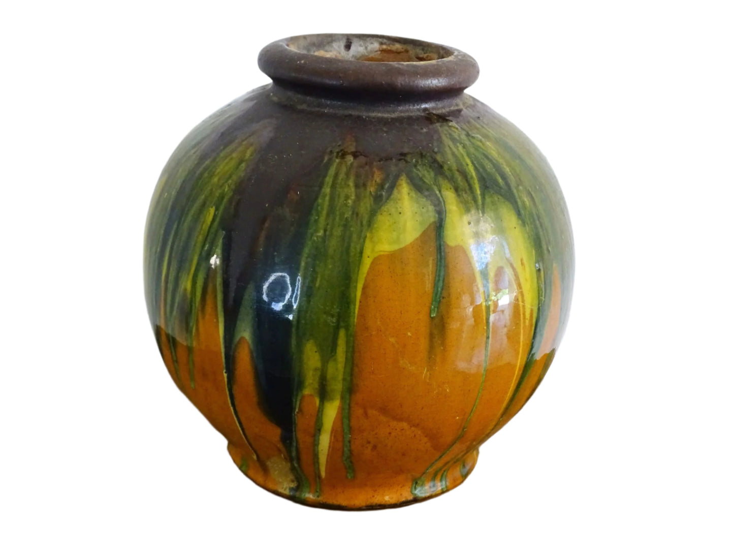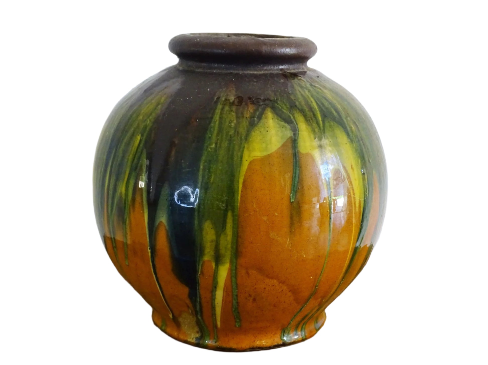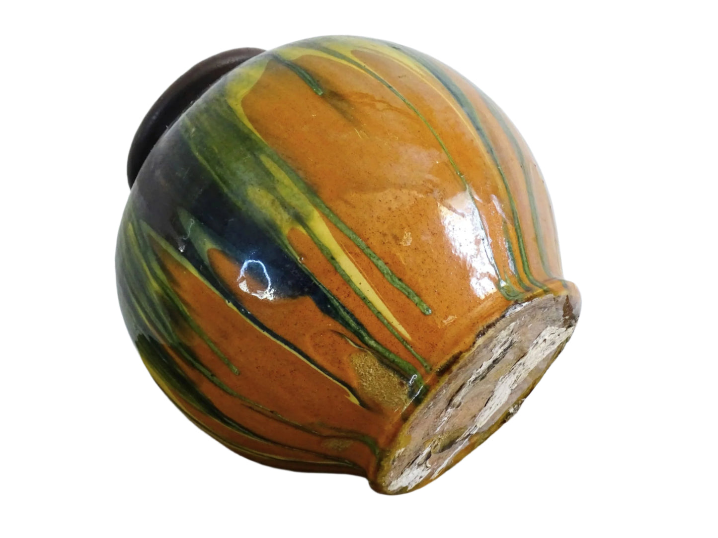 Beautiful French antique ceramic vase glazed in orange with a yellow, green and brown drip glaze. It has a rounded shape and would make a gorgeous decoration, both filled with greenery or standing by itself.