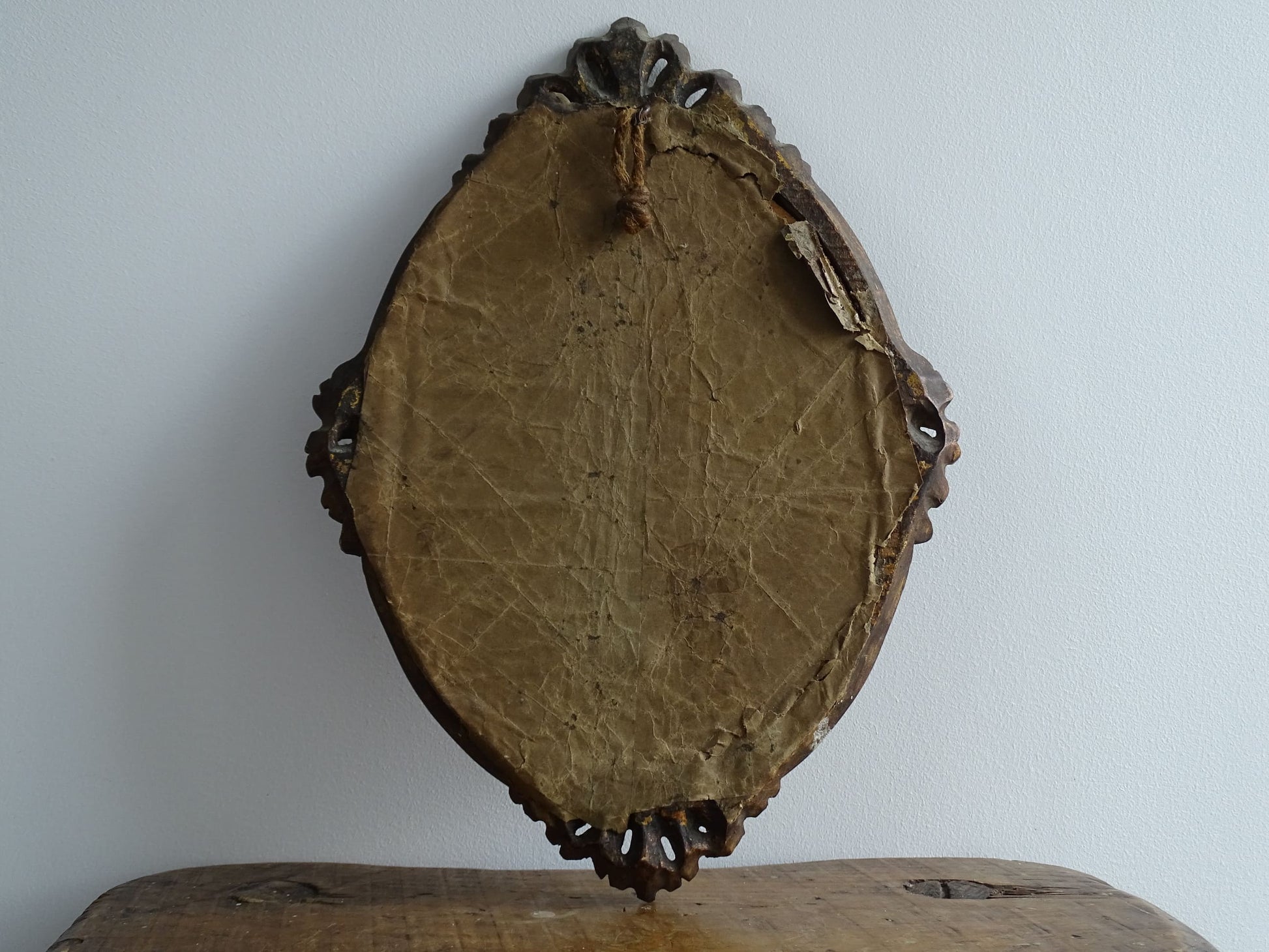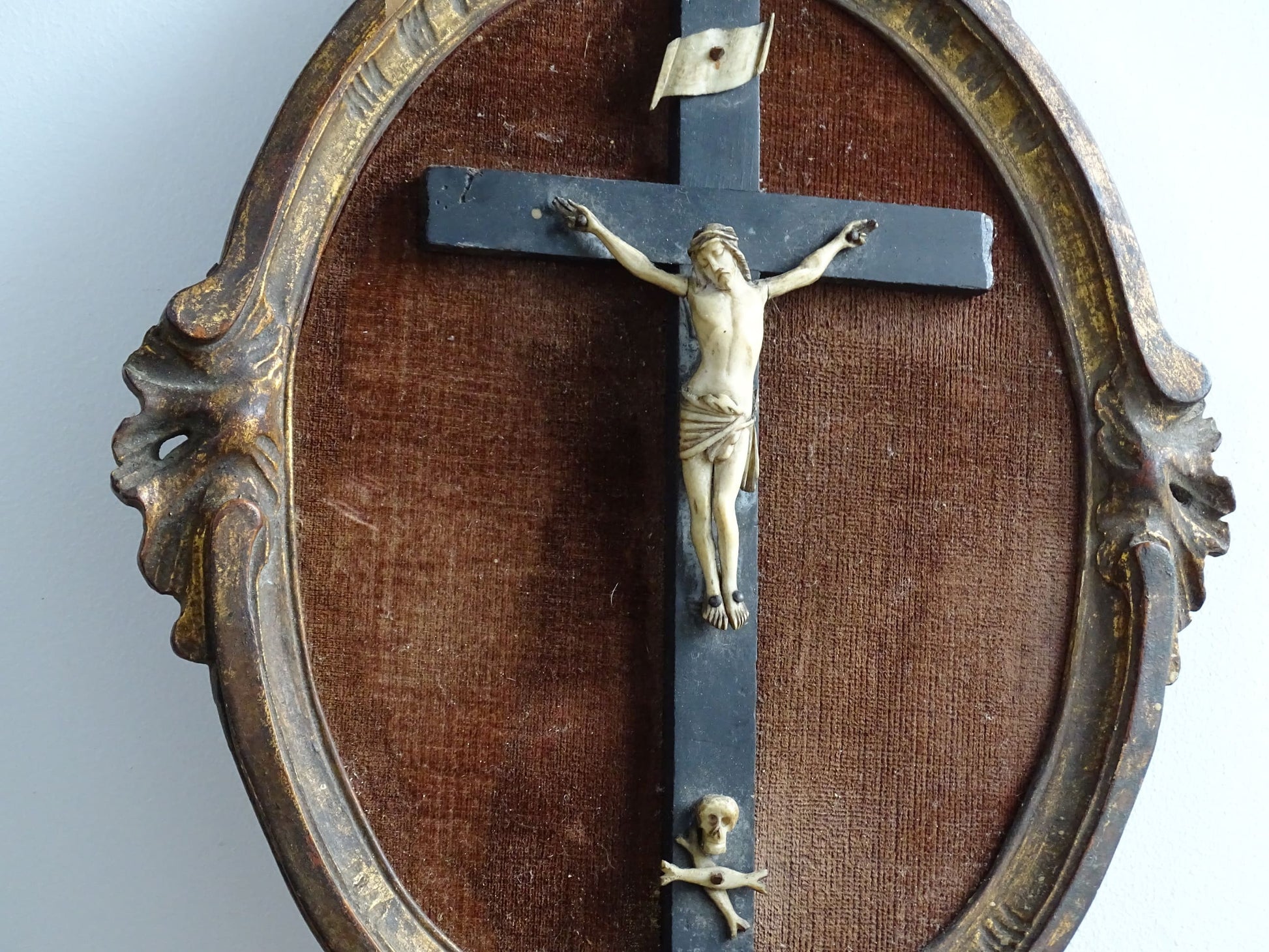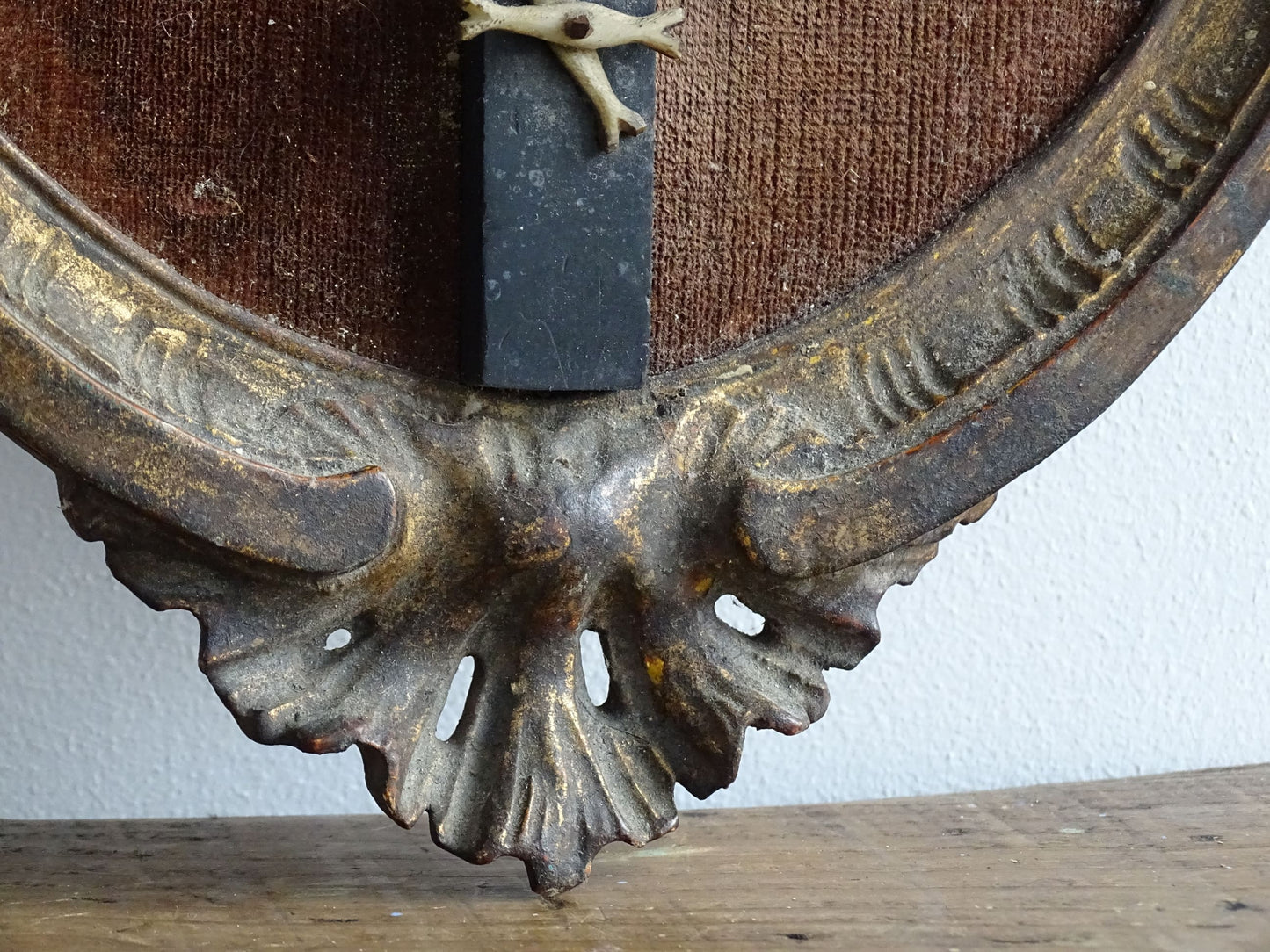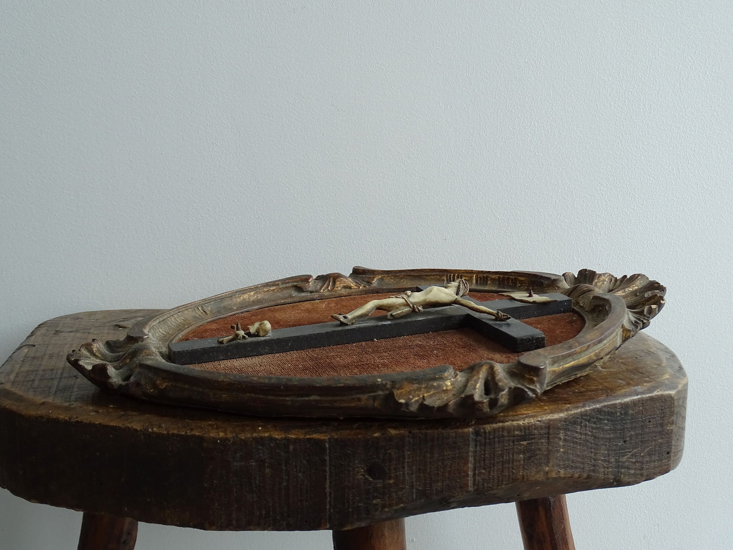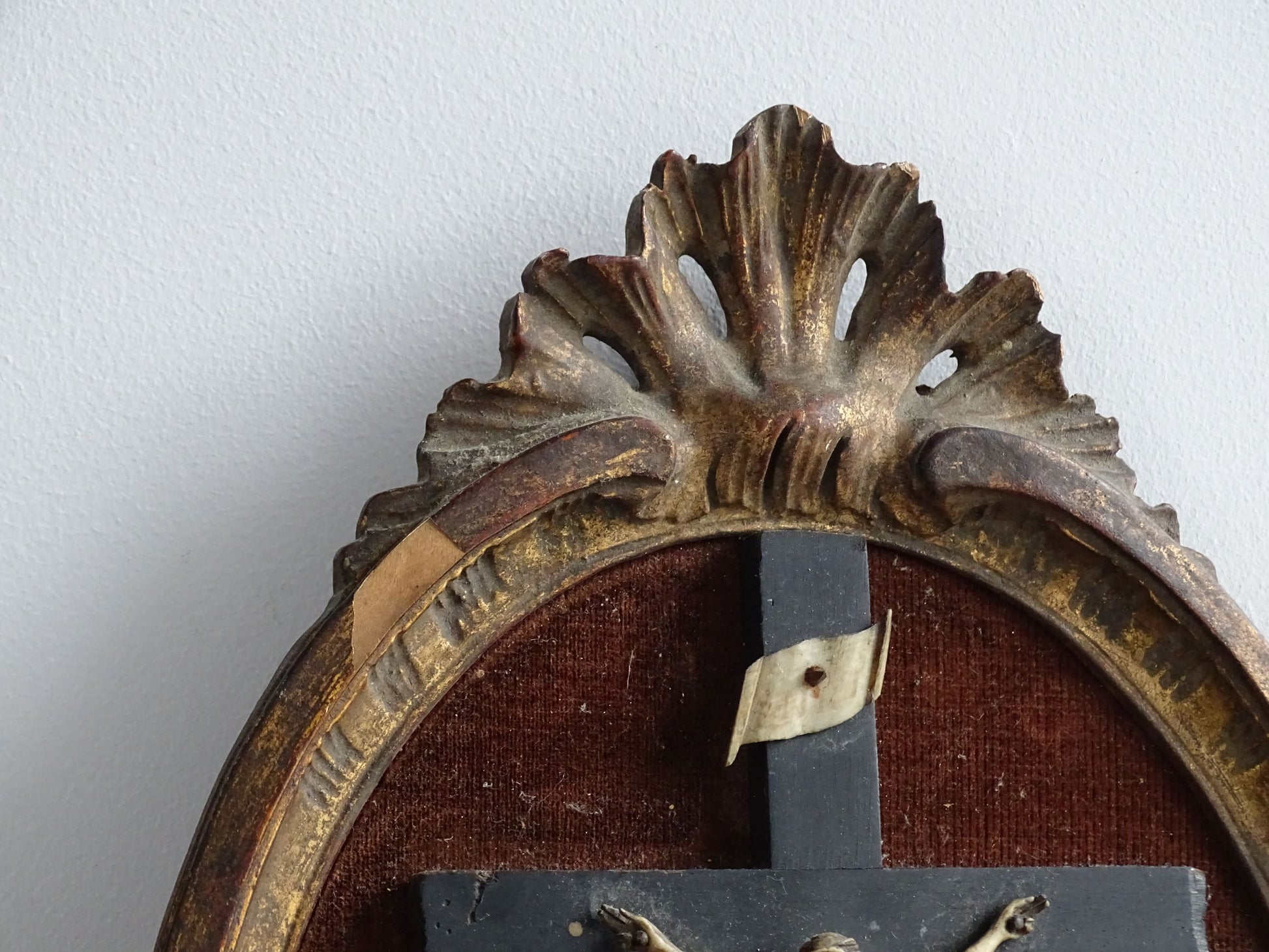 Beautifully aged French antique framed crucifix with a gold wood oval frame and a brown velvet background. It is decorative enough to be displayed on its own or it could be hung on the wall amongst other religious decor.