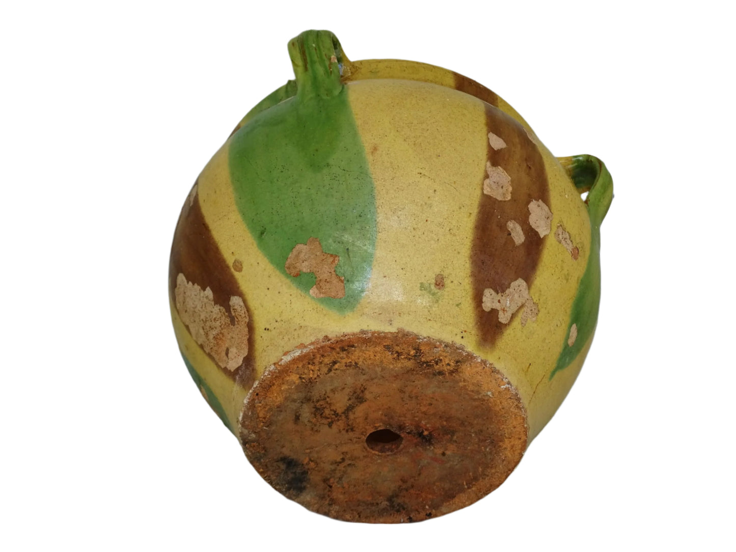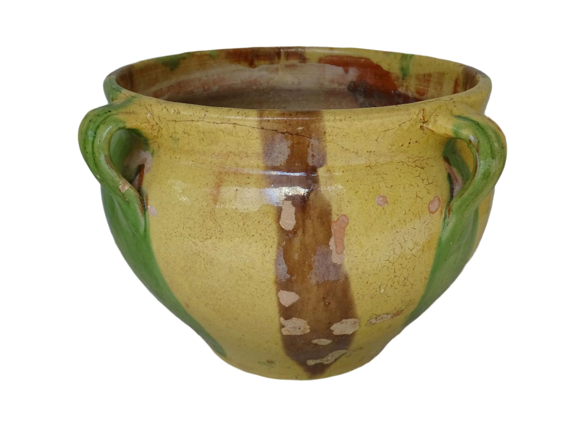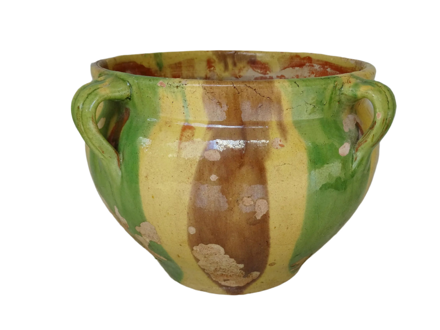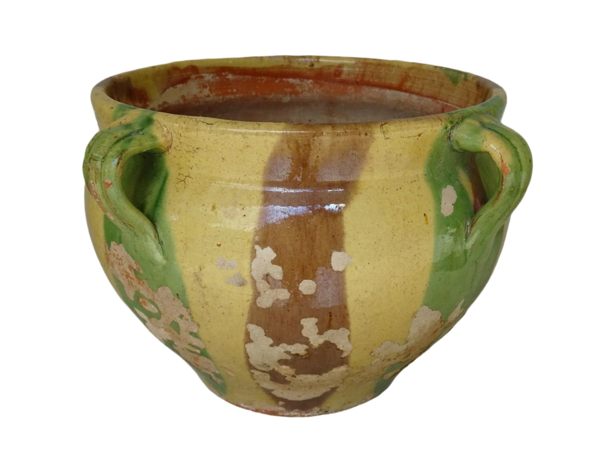 Beautiful French antique glazed terracotta planter from Castelnaudary. The pot has a stripe drip glaze in yellow, green and brown. This antique cache pot, with it's four loop handles, would make a beautiful decorative accent displayed with a leafy green plant.