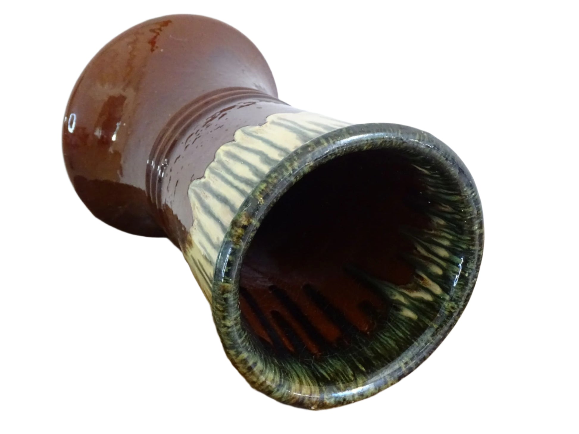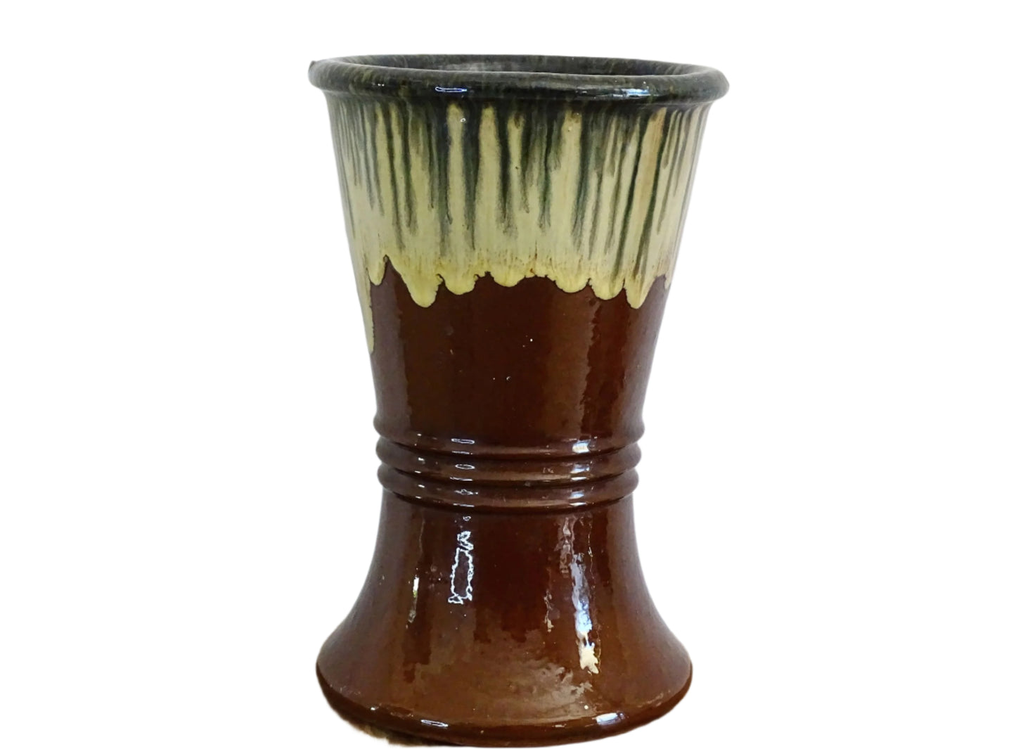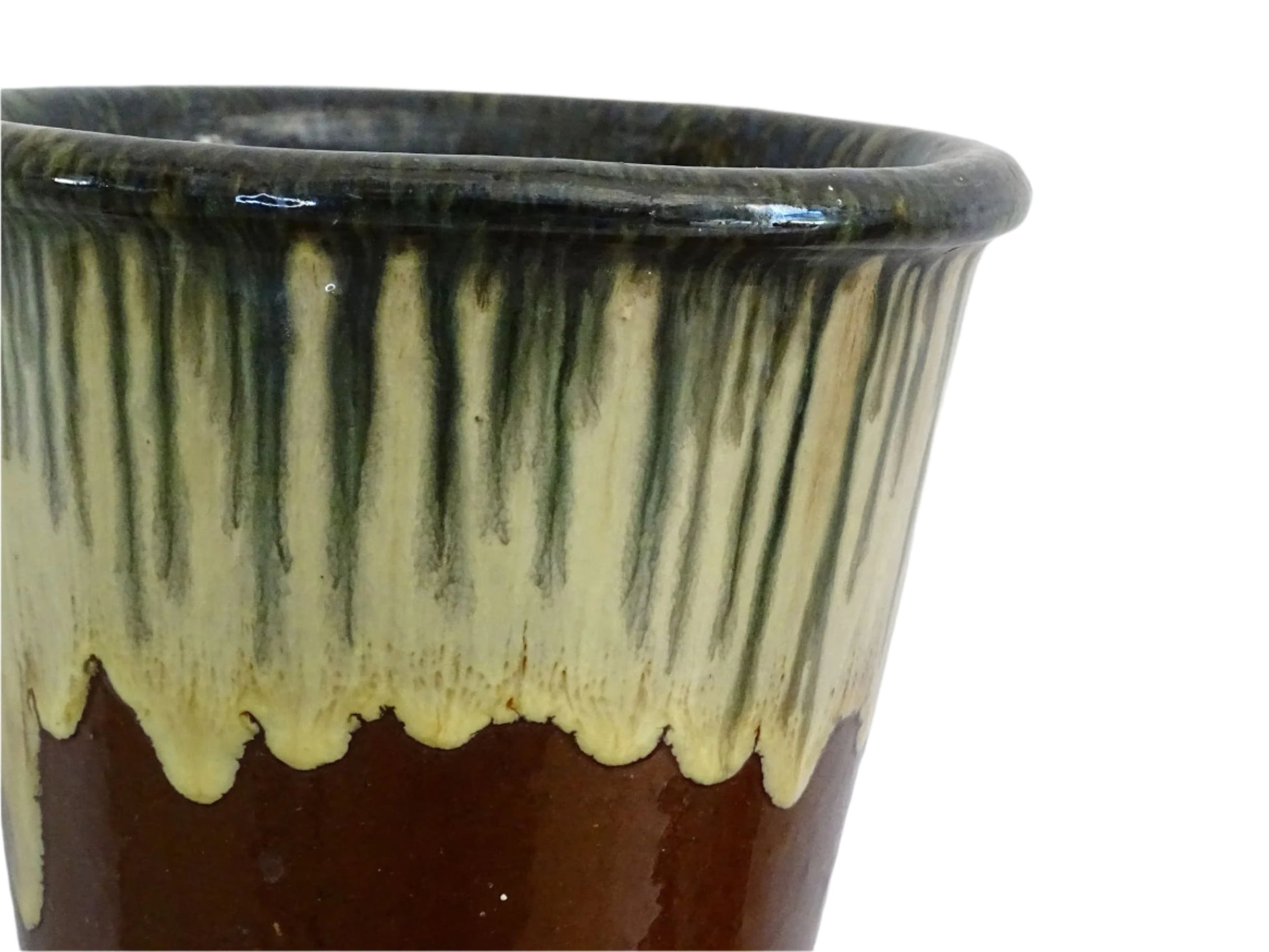 French antique glazed terracotta vase, crafted from earthenware, featuring a rich brown base glaze contrasted by a flowing drip glaze in green and cream tones, creating a stunning organic effect. The flared silhouette is accentuated by subtle ridged detailing. Fill this gorgeous pottery vase with seasonal foliage or pair with other antique ceramics and pottery to create a curated vignette.